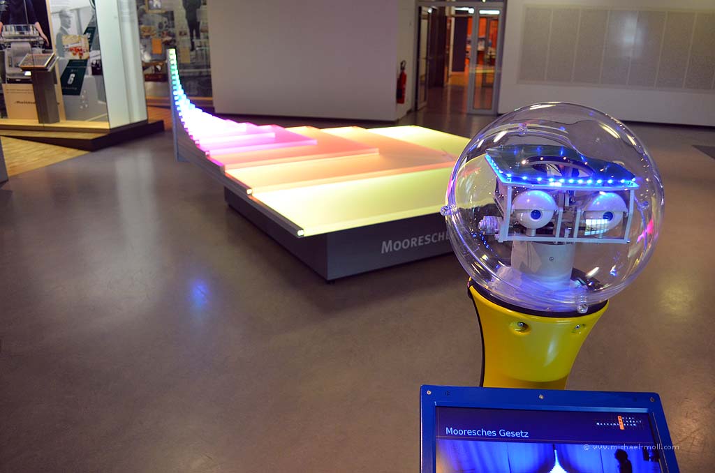 Der Roboter im Vordergrund ist eine Art Infoschalter. Er hält einem ein Display entgegen, auf dem man anklicken kann, was man sich gerne anschauen möchte. Der Knabe bringt einen dann in die entsprechende Abteilung. So einen Roboter habe ich letztens auch bei Elektronikfachmarkt Conrad gesehen.