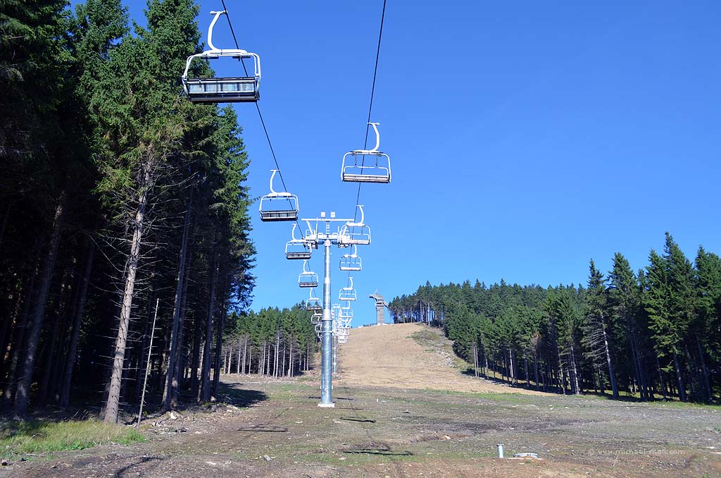 Spielplatz neben dem Wirtshaus. Im Hintergrund die Skischanze. Hinter mir ist nun das Gipfelkreuz und ein kleiner Streichelzoo. Neben dem Streichelzoo noch die Bergstation der Seilbahn und rechts neben dem Wirtshaus ist noch die neue Bergstation vom Sesselllift. Mehr passt nicht auf den Wurmberg, denn an allen Seiten geht es dann hinab.