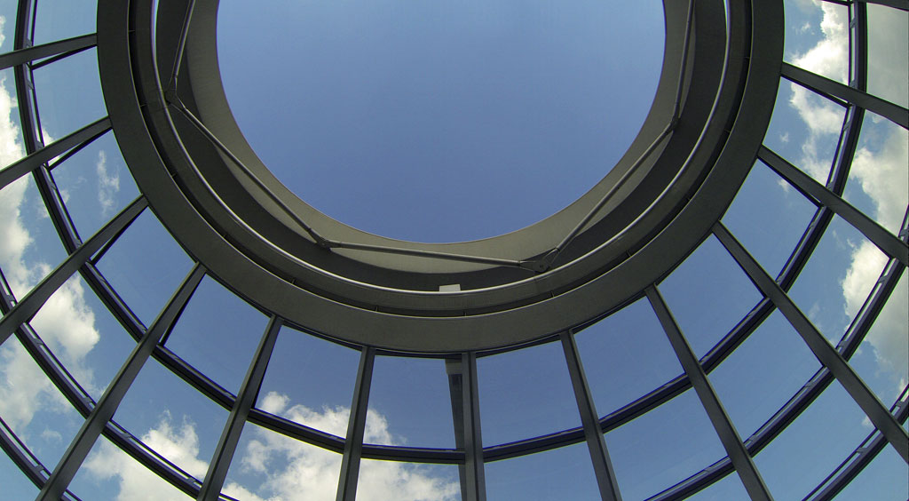 Und zwar habe ich die Kuppel vom Reichstag besucht. Dafür musste vorher online ein Termin vereinbart werden. Wir waren pünktlich vor Ort, ließen die Sicherheitsvorkehrungen über uns ergehen, fuhren mit dem Fahrstuhl (ja, ich musste Fahrstuhl fahren - gruselig) nach oben, lasen brav die Infotafeln über den Reichstag und schlenderten dann den Weg in der Kuppel nach oben. Soweit so gut. Oben angekommen, kann man es sich auf einer großen liege-ähnlichen Sitzbank bequem machen und nach oben schauen. Und siehe da: Die Kuppel vom Reichstag ist oben offen. Immer. Ich war echt erstaunt. Das wusste ich nicht.