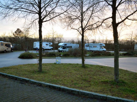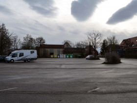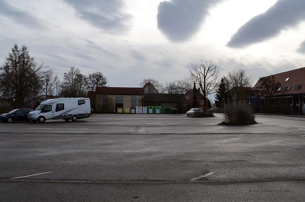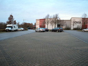 Parkplatz, der zum Stellplatz gehört. Hier gibt es aber keinen Strom. Im Hintergrund das Kino.
