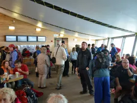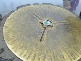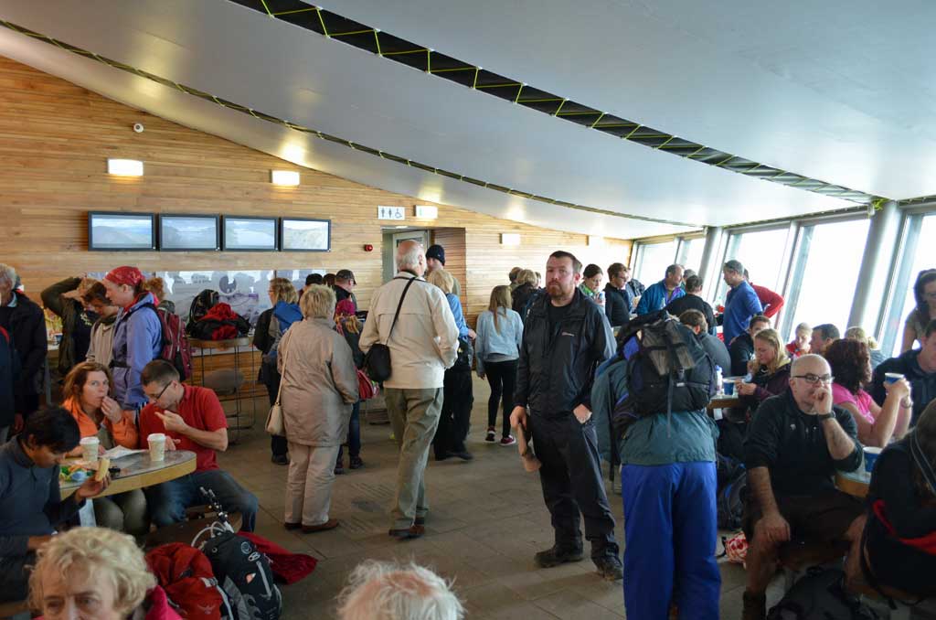 Schon unterwegs war uns klar, dass wir nicht mit der Bahn wieder runter fahren würden, sondern lieber auch zu Fuß gehen. Dafür sprachen nämlich auch andere Gründe: Der Zug hat auf dem Gipfel rund 45 Minuten Aufenthalt. Allerdings steckten wir in einer dicken Wolke und hatten vom Gipfel keinerlei Ausblick. Und sonst gab es dort nichts anders zu machen, als einmal um die Gipfelmarkierung herumzugehen oder im Souvenirladen bzw. am Kiosk Geld zu lassen.