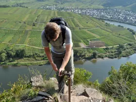 Ich weiß, das ist wahrscheinlich ein Klassiker und damit ein alter Hut. Aber ich fand diese Wanderstrecke einmalig. Und zwar meine ich den Calmont-Klettersteig bei Bremm an der Mosel. Der Calmont ist der steilste Weinberg Europas und im Sommer kann es mit der Südlage dort richtig unangenehm werden. Aber die Aussicht ist wunderbar und das Wandern einfach ein Erlebnis.