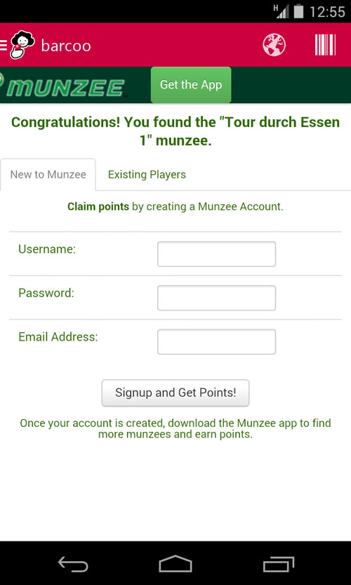 Scannt man ihn, kommt man auf die entsprechende Seite, wo man sich mit seinem Munzee-Account einloggen kann:
