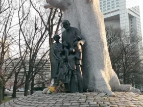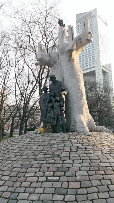 Das Foto zeigt eines der drei Janusz-Korczak-Denkmale in Warschau. Janusz Korczak war ein Arzt und Kinderbuchautor, der seine Kinder aus dem Waisenhaus im Warschauer Ghetto ins Vernichtungslager begleitet hat und da zusammen mit ihnen ums Leben gekommen ist.