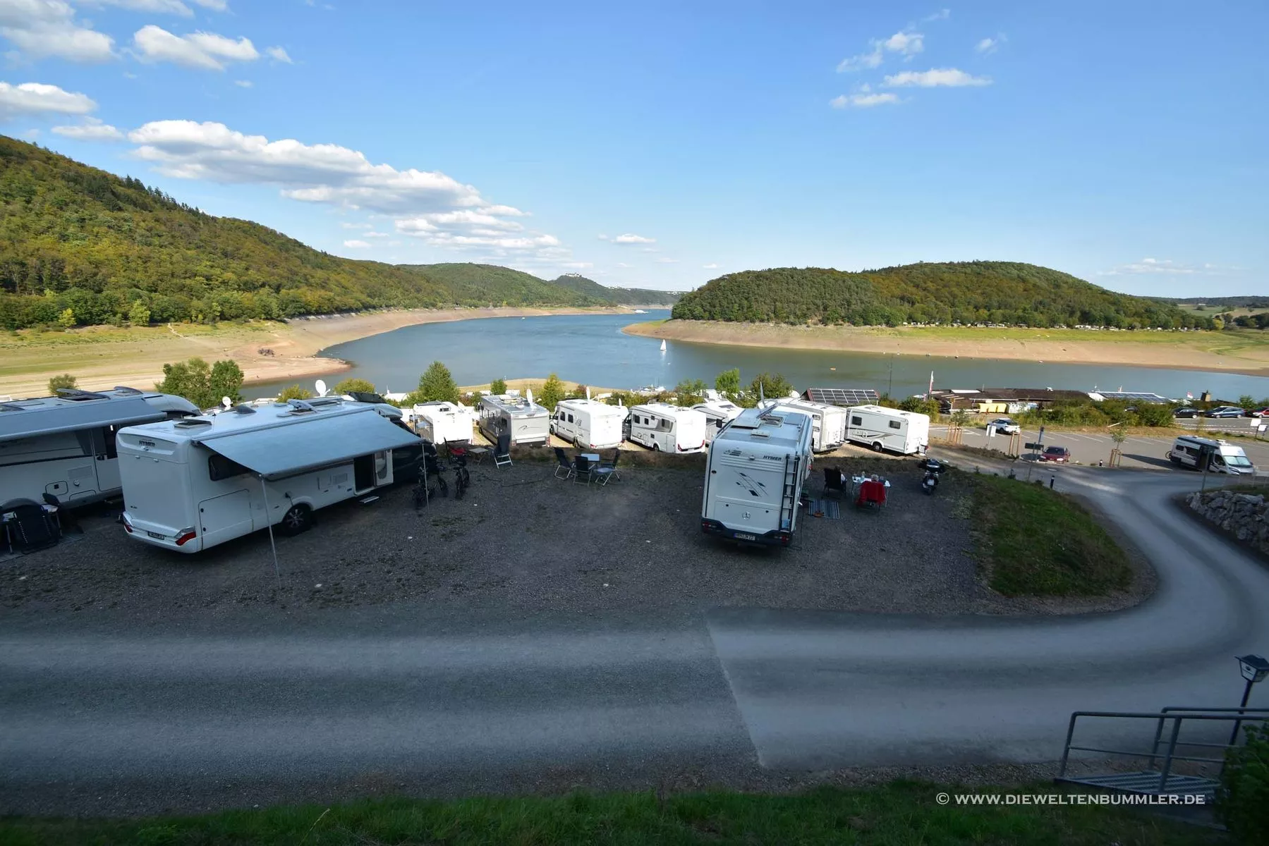 das hatte ich ganz übersehen: Unser Heimatsee, der Edersee mit der Wohnmobil-Alm.( Tatsächlich haben wir dort noch nie gestanden. Schöner Ausblick, aber das war dann auch schon Alles. Kein Laden in der Nähe, Schiffahrt hält dort auch nicht)
