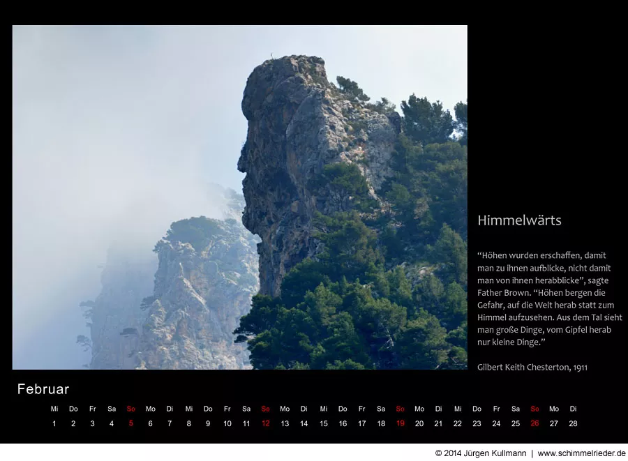 Das Zitat von Gilbert Keith Chesterton wurde einer seiner Father-Brown-Geschichten aus dem Jahr 1911 entnommen, und wenn das Foto auch aus einer völlig anderen Region stammt — ich nahm es Ende Februar 2014 auf Mallorca auf dem Weg zum Torre Picada auf — passen Bild und Text gut zusammen.