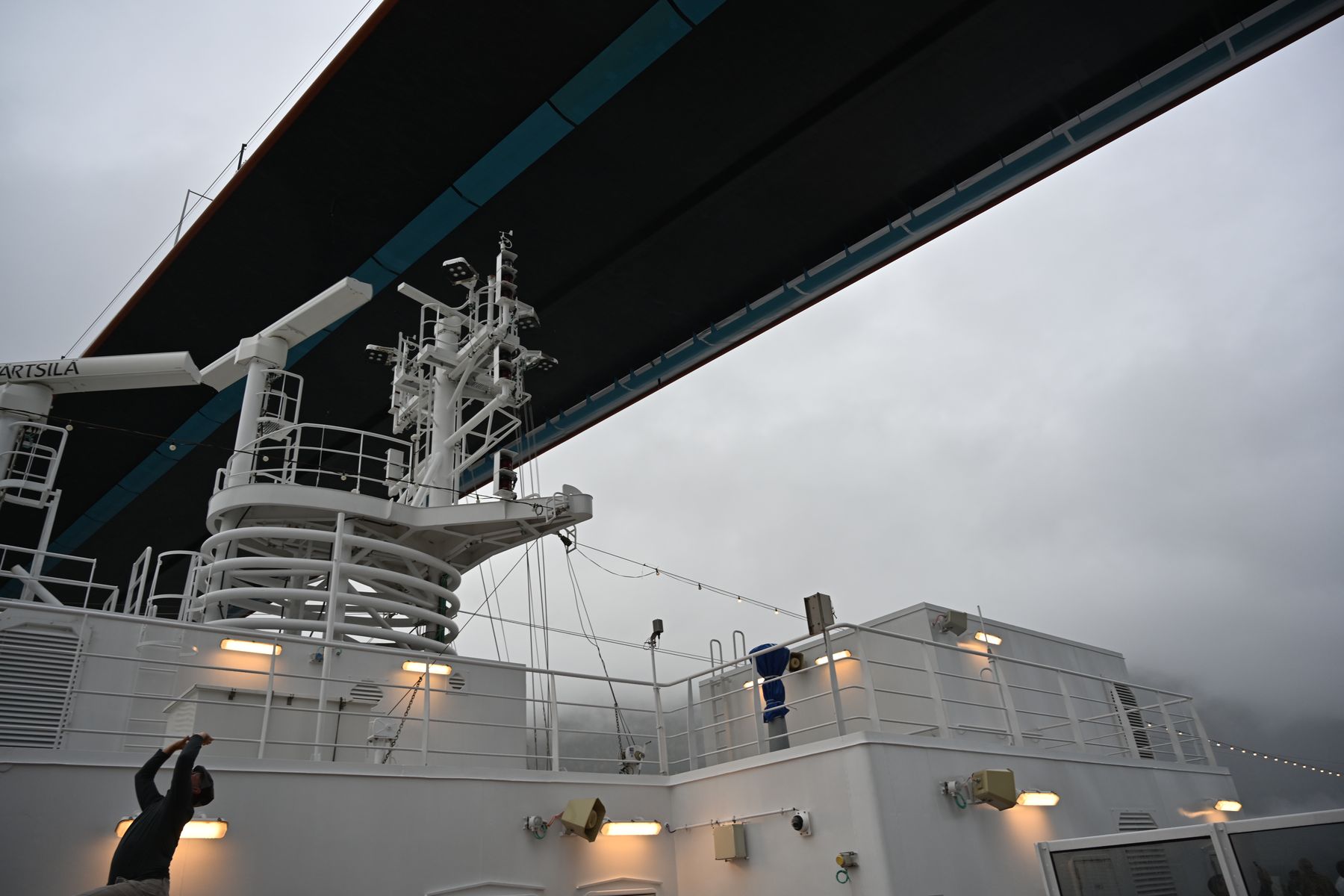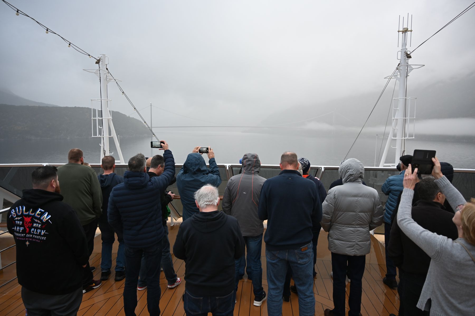 Am Nachmittag legte das Schiff ab, wobei hierfür extra der Bugbereich für die Passagiere geöffnet wurde. Denn bei der Fahrt durch den Fjord unterquert man auch die beeindruckende Hardangerbrücke. Wir gingen zwar auch kurz zum Bug, doch kurz vor der Unterführung unter der Brücke hindurch, sausten wir schnell rauf zu den oberen Außendecks, weil wir annahmen, dass es dort beeindruckender sein würde. Diese Erfahrung hatten wir auf Grund der Fahrten mit der Queen Mary 2, die in New York auch sehr knapp unter der Verrazzano-Bridge in den Hafen einfährt.