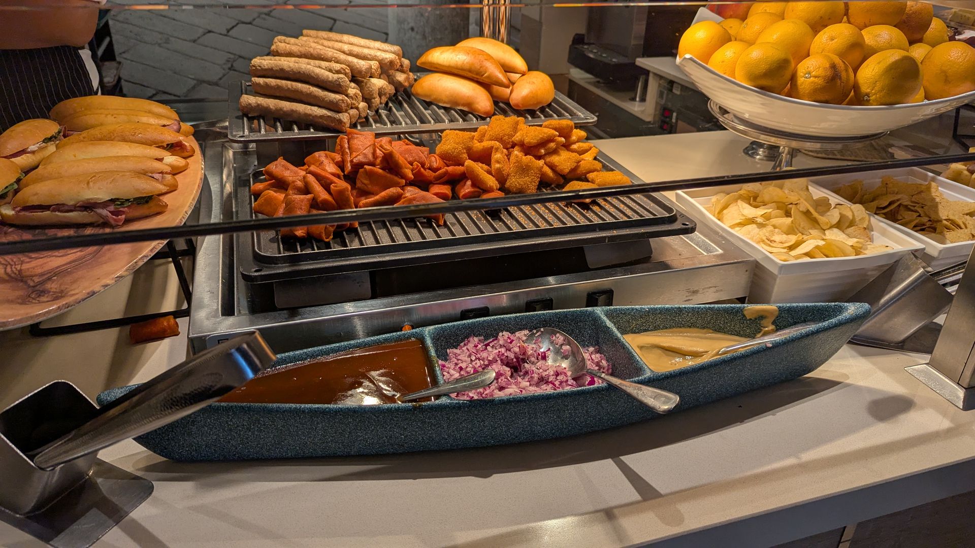 Nach dem Aufstehen verabschiedeten wir uns von der Kabine 6053 und begaben uns zum Zähneputzen zur Kabine 7119. Gleich im Anschluss daran gingen wir zur Rezeption und fragten, welche Möglichkeiten bestünden, weil die nächsten Nächte sicher nicht leiser werden würden. Man bat uns um Geduld bis ca. 14 Uhr. Das Hotelmanagement berät im Laufe des Vormittags. Also frühstückten wir und schauten zu, wie das Schiff sich der Nordsee näherte. Das war sogar für uns als erfahrene Seereisende etwas heftig. Der Sturm war noch immer ordentlich und in Hoek van Holland spürten wir nicht nur sofort den Wellengang, sondern sahen auch ein Frachtschiff vor uns, das extrem durch die See stampfte. Da mussten wir beide doch ordentlich schlucken. Ich hätte es gerne gefilmt, aber ich musste mich selber festhalten und traute mich nicht, das Telefon rauszuholen.