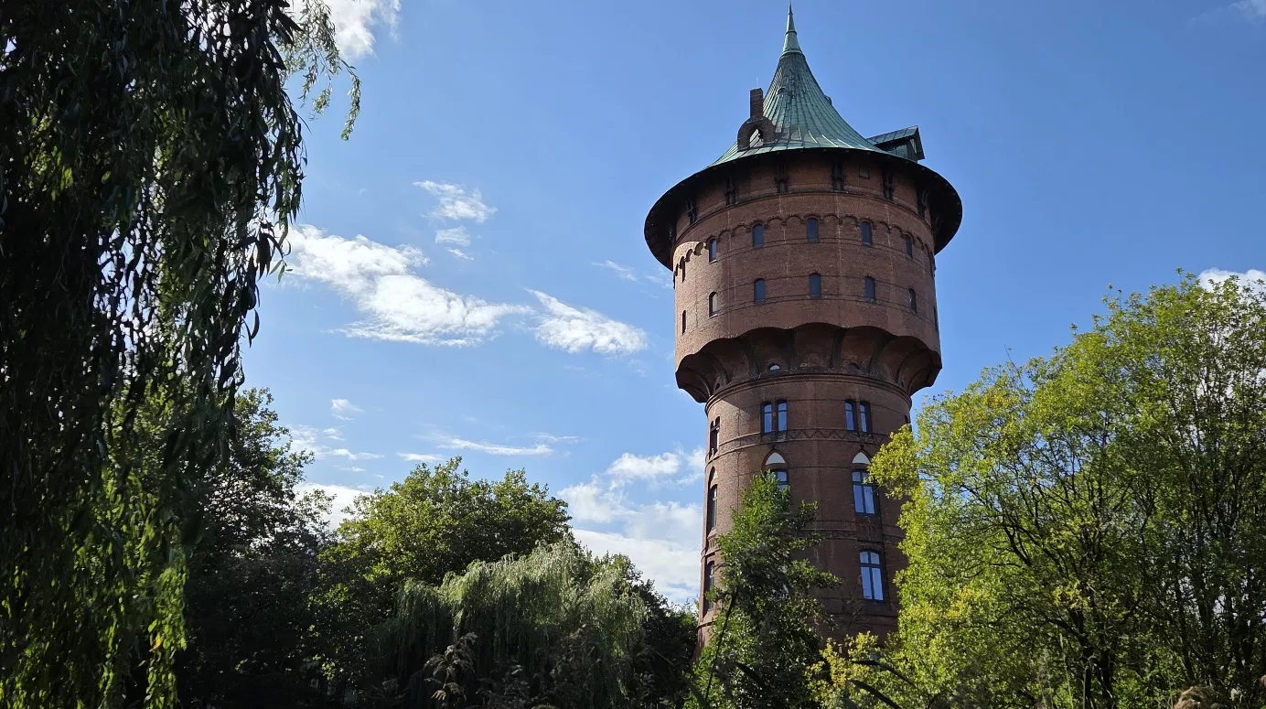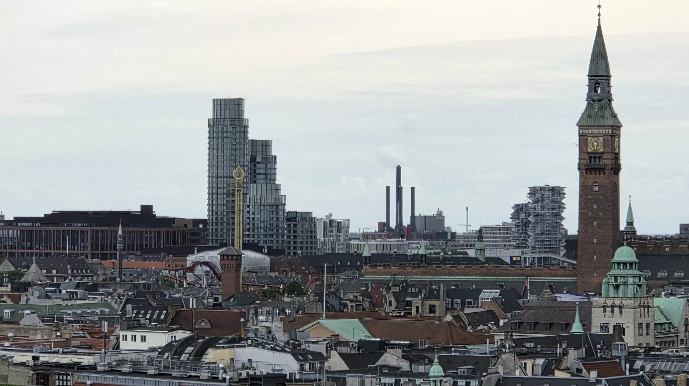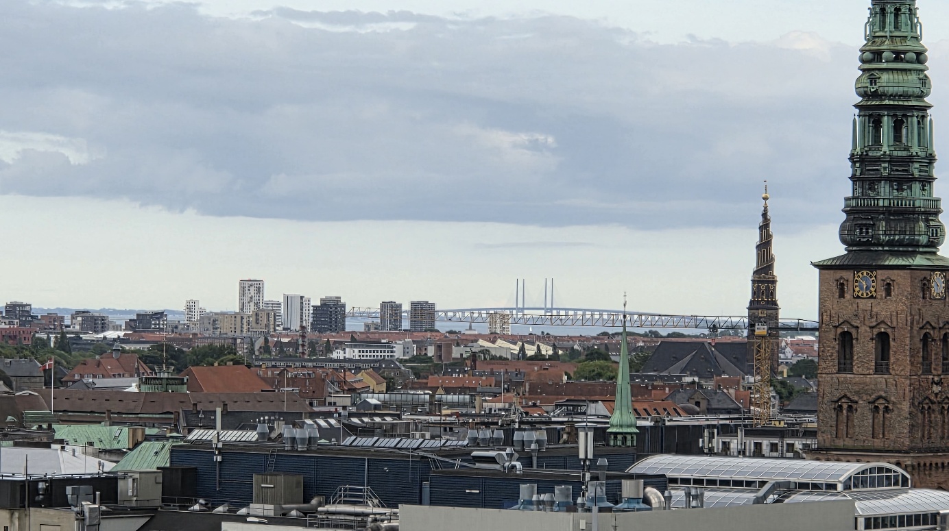 Der zweite Turm von rechts ist der gedrehte Kirchturm, ganz hinten die Brücke nach Malmö, Schweden.