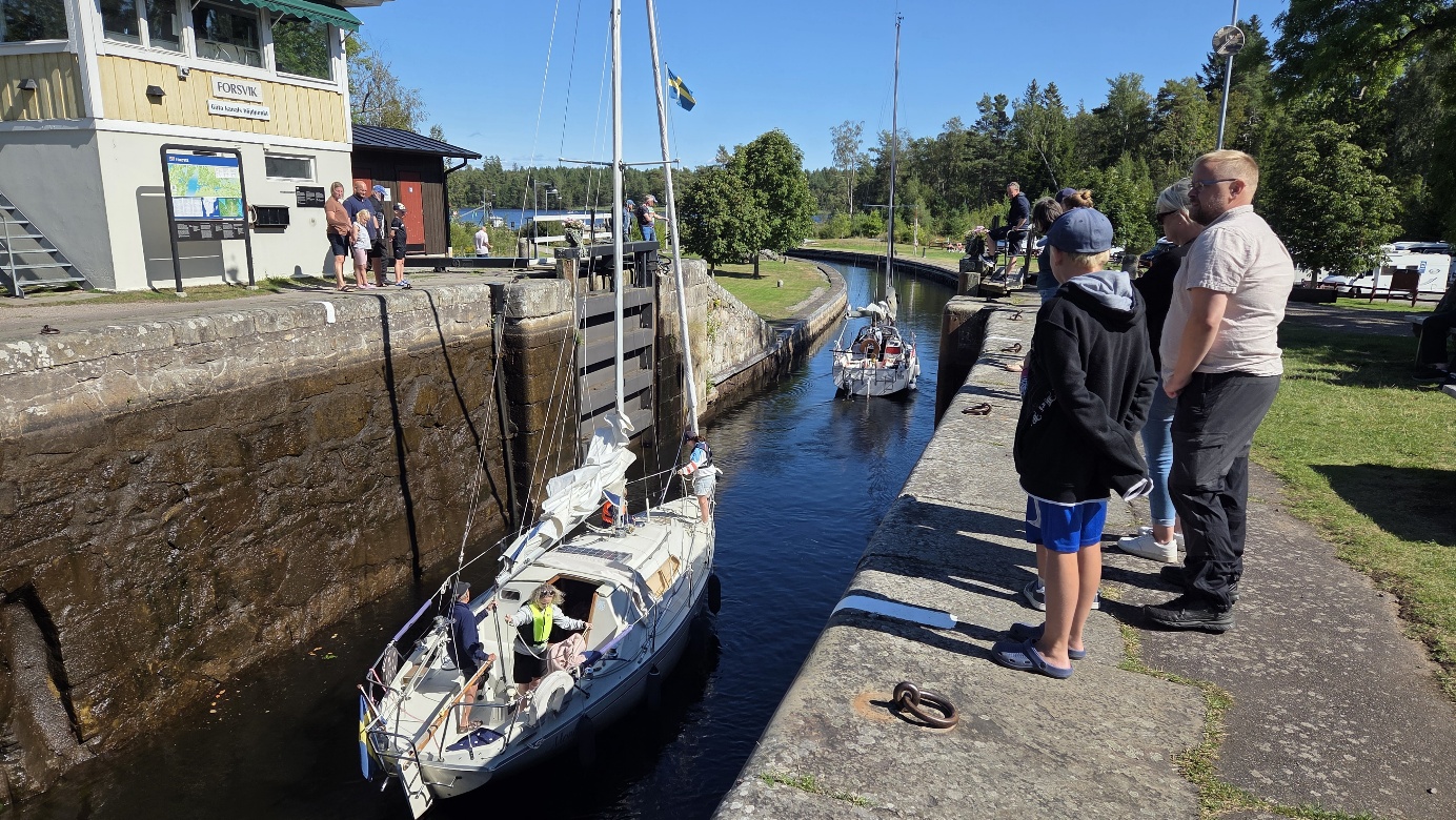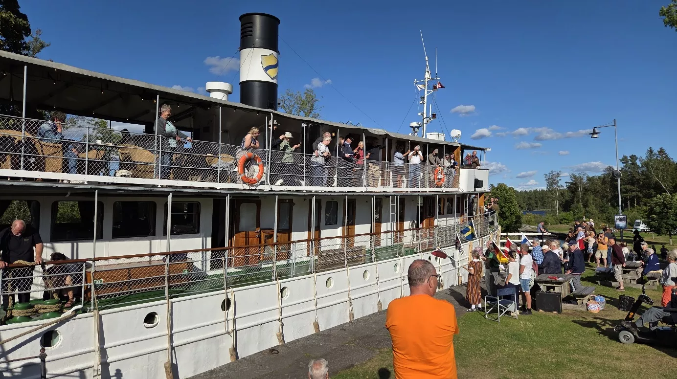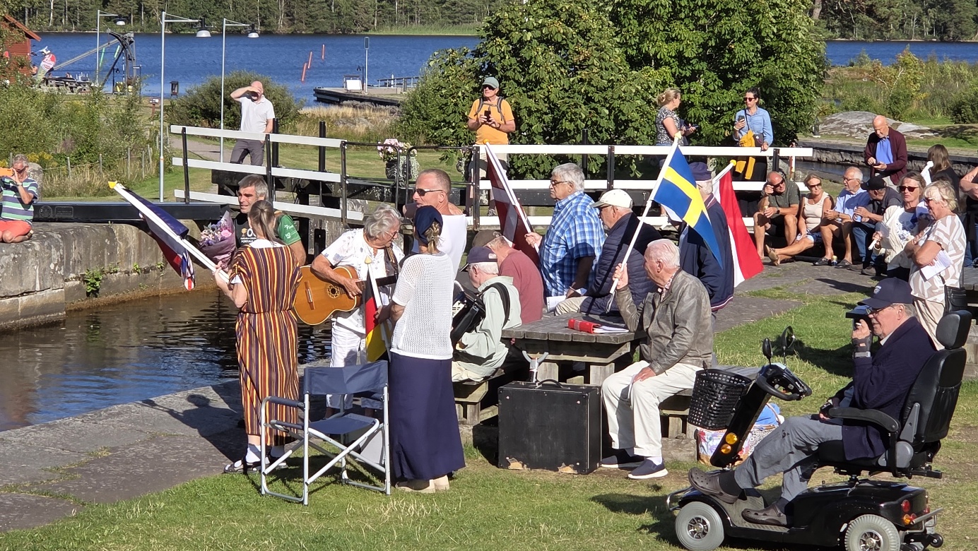 Mit den Fährrädern nach Forsvik gefahren. Ich glaube, das ist die einzige Stelle am Götakanal, wo der Radweg weit entfernt vom Kanal irgendwo durch die Landschaft geht. Schade, aber die Schleuse in Forsvik, mit dem gebogenen Kanal, ist schon sehenswert. Das Besondere aber ist, daß die christliche Gemeinde sich bei jeder Vorbeifahrt der alten Schiffe versammelt und dann singt und betet.