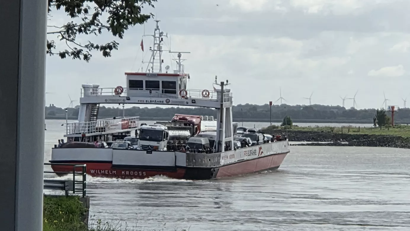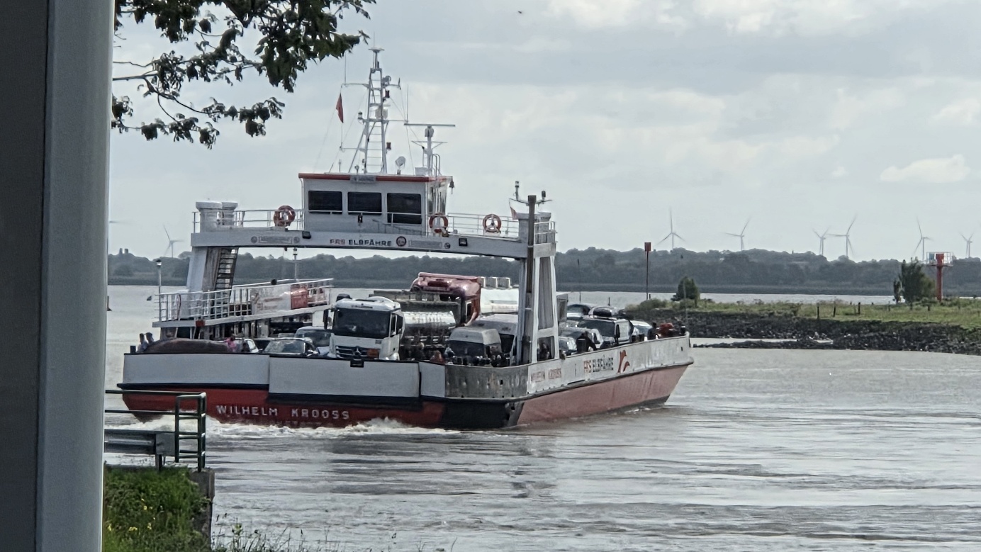 Von Wischhafen nach Glückstadt. Auf der Fähre zwei LKW, unser Wohnmobil und der Rest waren lauter Metal-Fans des Wacken Open Air – Festivals.