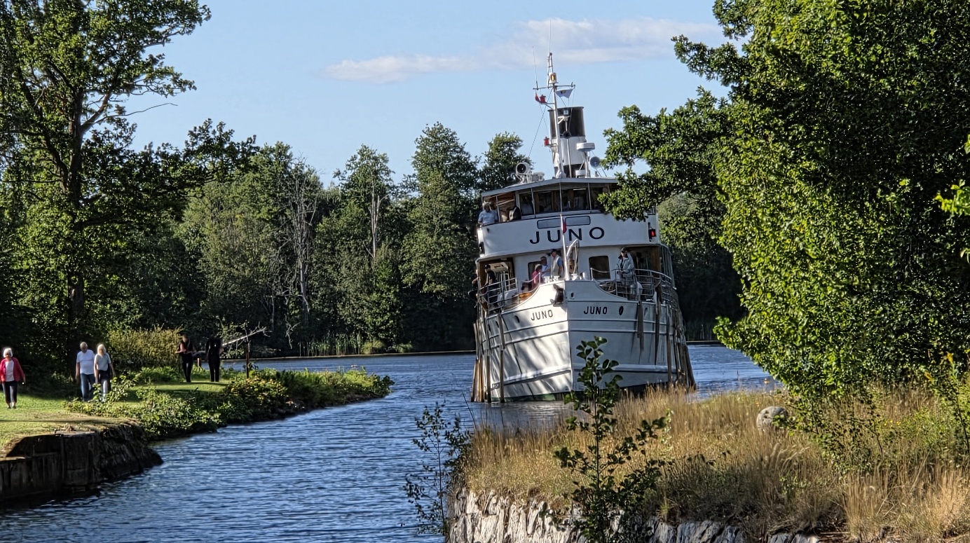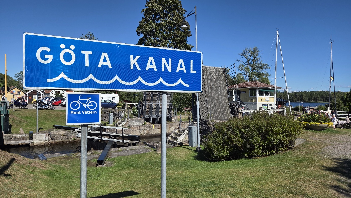 In Karlsborg am Götakanal verbringen wir ein paar Tage. Auf der Postkarte ist der leicht gebogene Götakanal zu sehen. Unten rechts ist ein Materiallager, dort ist heute der Stellplatz. Als wir ankommen sind, ist nur noch ein Platz frei. Glück gehabt. Am nächsten Abend sind mindestens 20 Plätze frei. So haben wir es öfters erlebt. Seit Anfang August wird es zwar etwas leerer, aber zwischendurch, vom Tag und/oder dem Ort abhängig, ist auch mal voll.