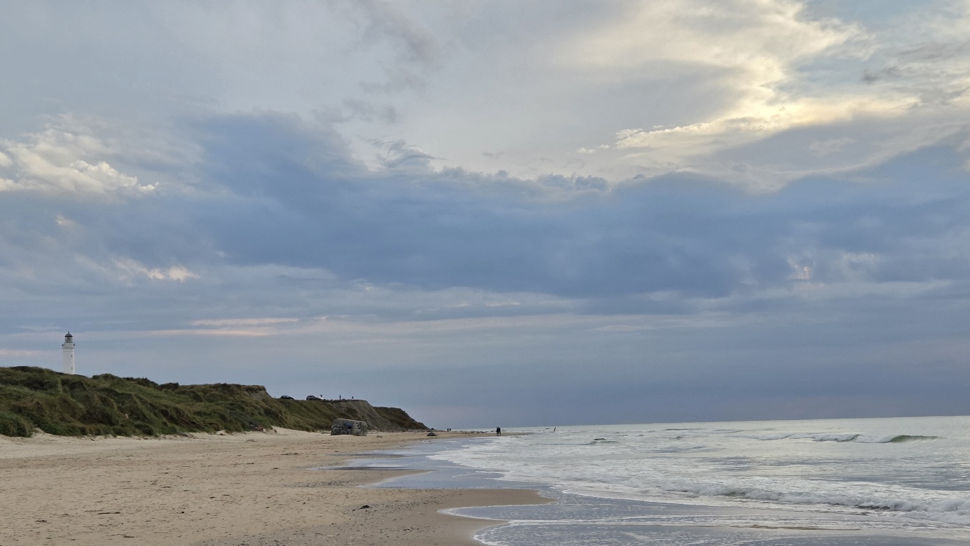 Strand, Bunker, Leuchtturm in der Abendstimmung