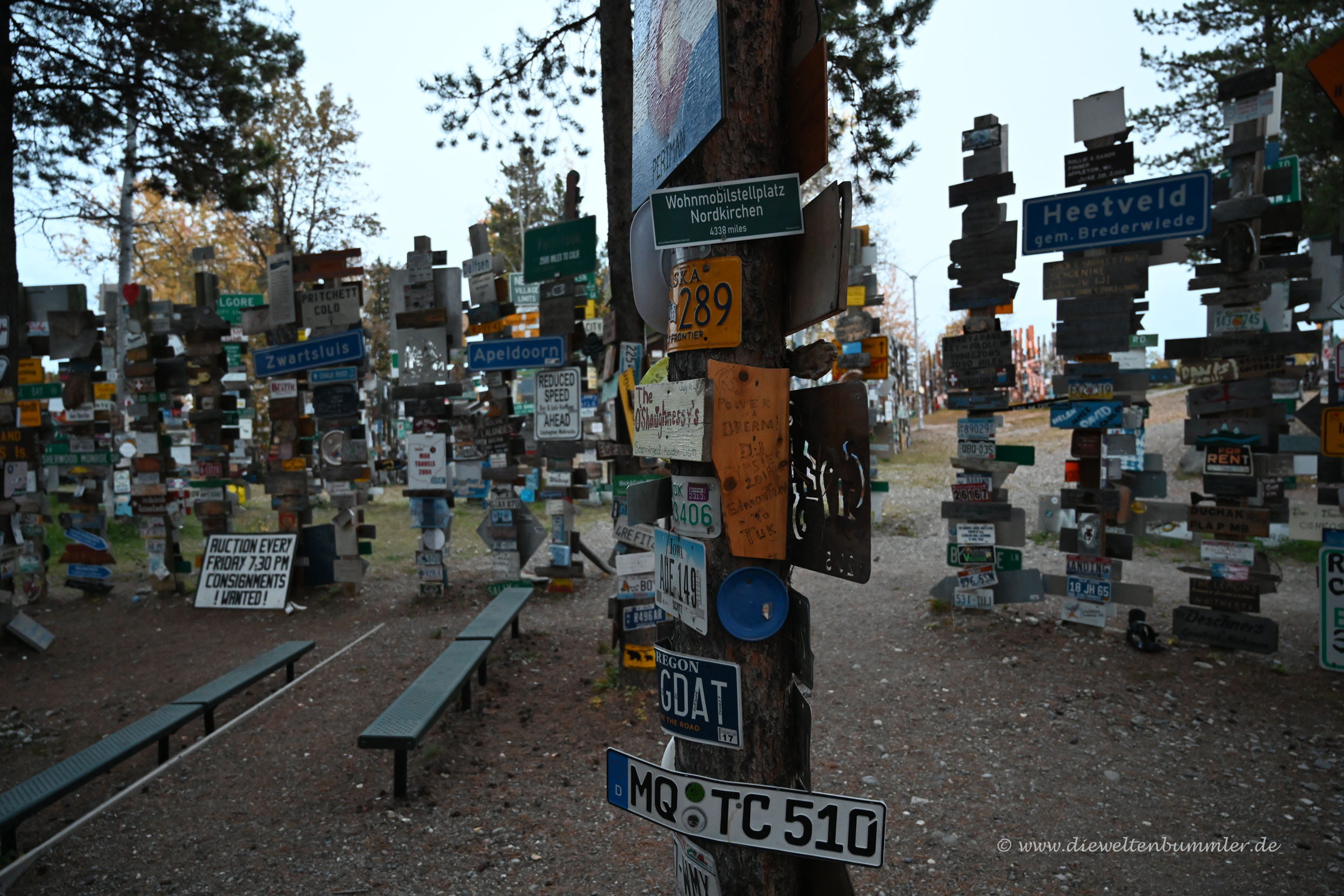 Auf dem Weg von Alaska in die Rocky Mountains machten wir auch wieder Station in Watson Lake. Dort übernachteten wir wieder in dem Hotel, das wir bereits kannten und das uns zusagte. Abends spazierten wir natürlich auch wieder zum Sign Post Forest. Wir wollten doch nachschauen, ob unser Schild dort noch hängt und das tat es auch. Sehr schön.