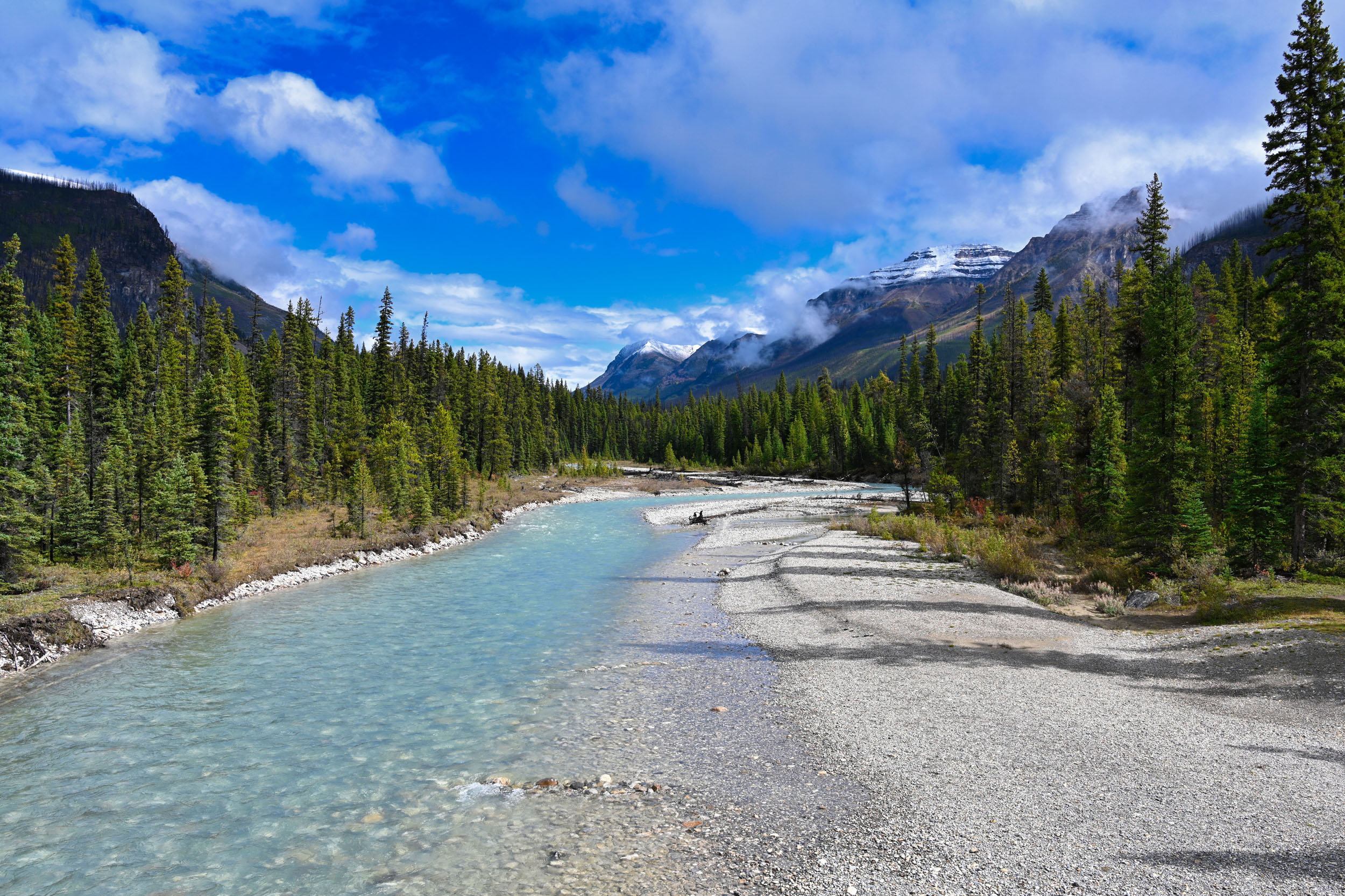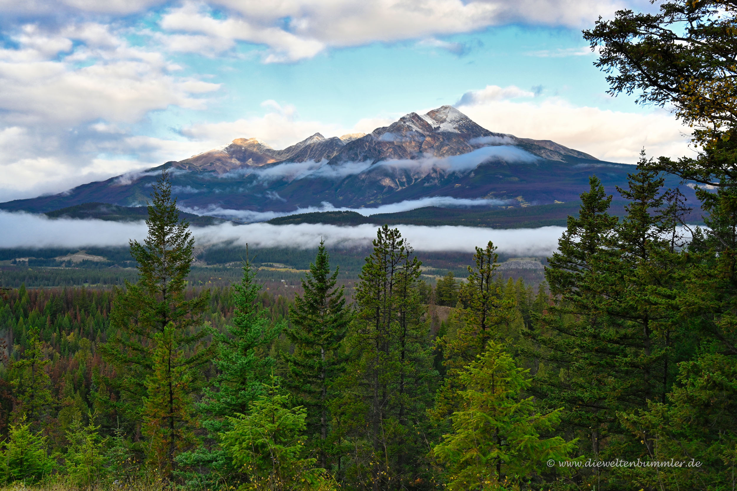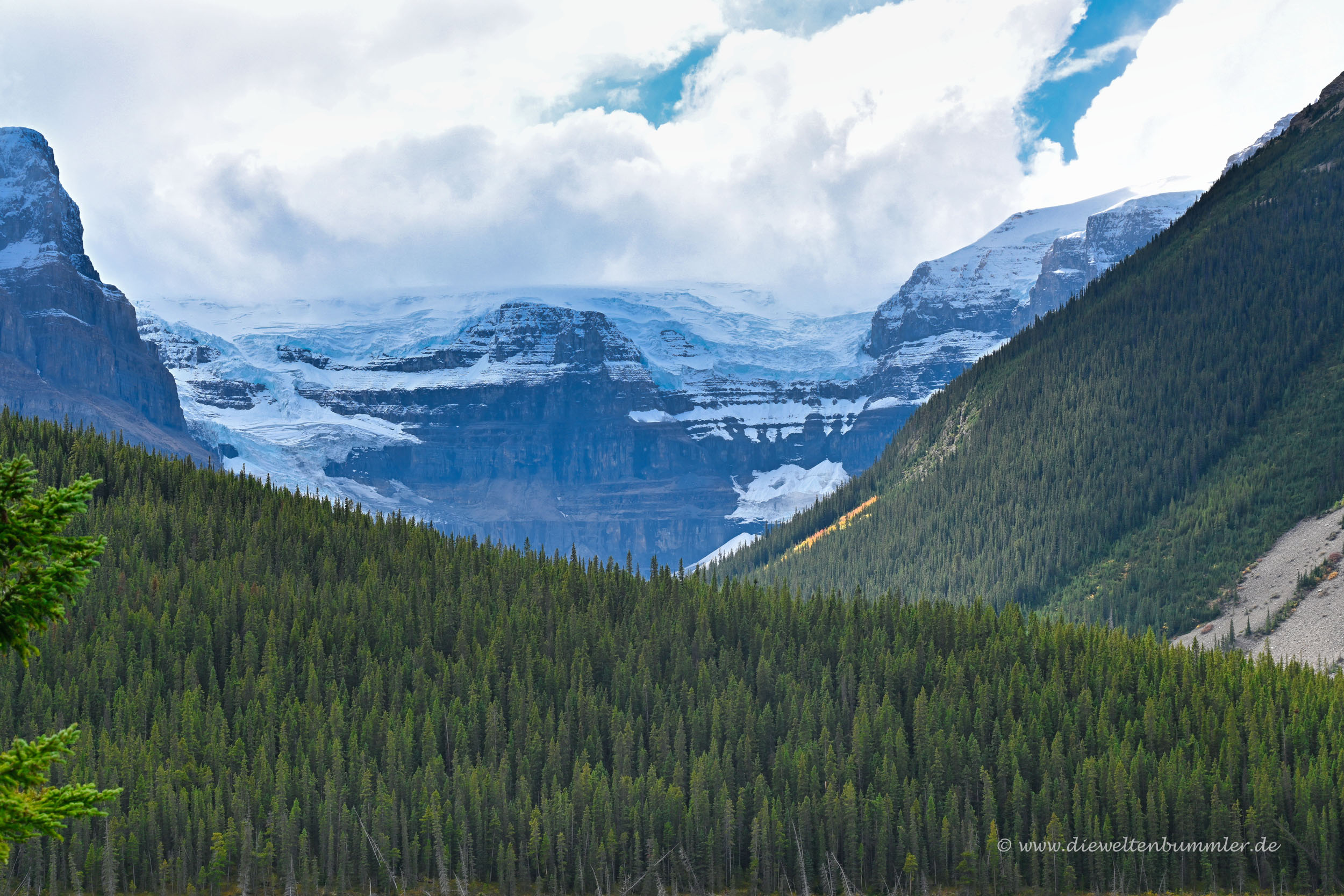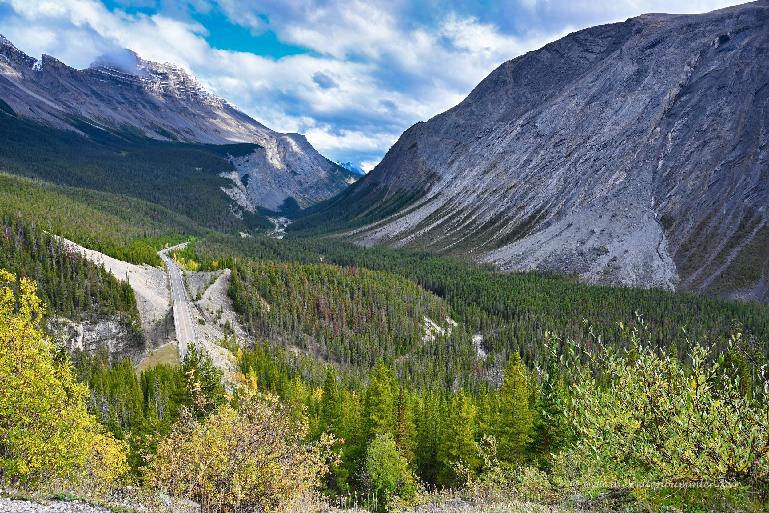 Gleich hinter dem Besucherzentrum überquert man einen Pass, der gleichzeitig die Grenze zwischen Jasper Nationalpark und Banff Nationalpark darstellt. Weil auch der Banff Nationalpark kostenpflichtig ist, kauften wir noch im Besucherzentrum ein Ticket für unser Auto. Der Icefields Parkway führt nun durch das enge Tal deutlich hinab und bot auch weiterhin tolle Ausblicke.
