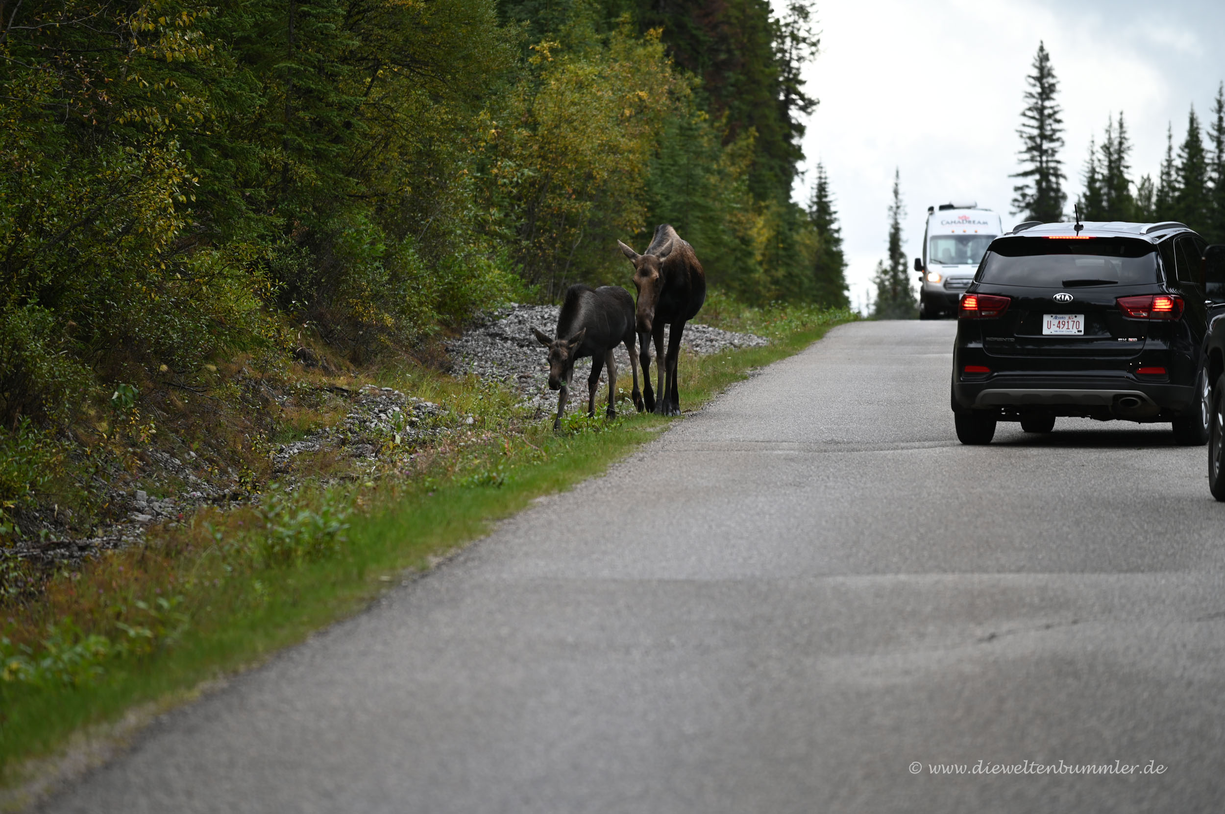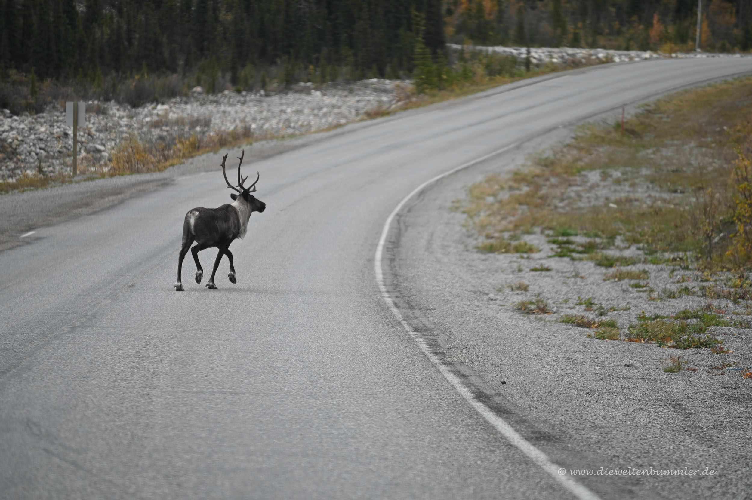 Daher beließen wir es bei einem kleinen Spaziergang am Seeufer und gingen später wieder zurück zum Auto. Man muss ja auch immer ein wenig die Entfernungen im Auge behalten. Alleine die Strecke zwischen Maligne Lake und Jasper misst mal eben 50 Kilometer – pro Richtung. Ohne Zwischenstopp braucht man dafür schon knapp eine Stunde. Und Zwischenstopps gab es immer wieder einmal. Unter anderem dann doch noch einmal für ein Rentier mit Junge.