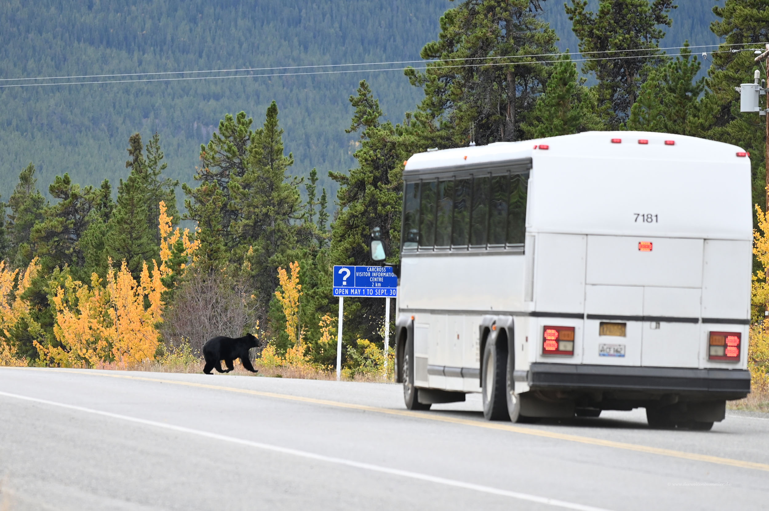 Der Bär war weit genug weg, um keine Gefahr für uns darzustellen. Wir standen ja direkt am Auto und es dürften noch vierzig oder gar fünfzig Meter Entfernung gewesen sein. Der Bär hatte auch überhaupt kein Interesse an uns. Ein wenig in Sorge gerieten wir vielmehr, als der Schwarzbär die Straßenseite wechseln wollte. Damit entfernte er sich noch mehr von uns, aber gleichzeitig kam ein Bus auf den Bär zugefahren. Wir fürchteten schon wieder, dass es zu einem Zusammenstoß kommen könnte. Doch der Busfahrer bremste rechtzeitig und der Bär rannte, irgendwie niedlich aussehend, über die Straße. Fort war der Bär.