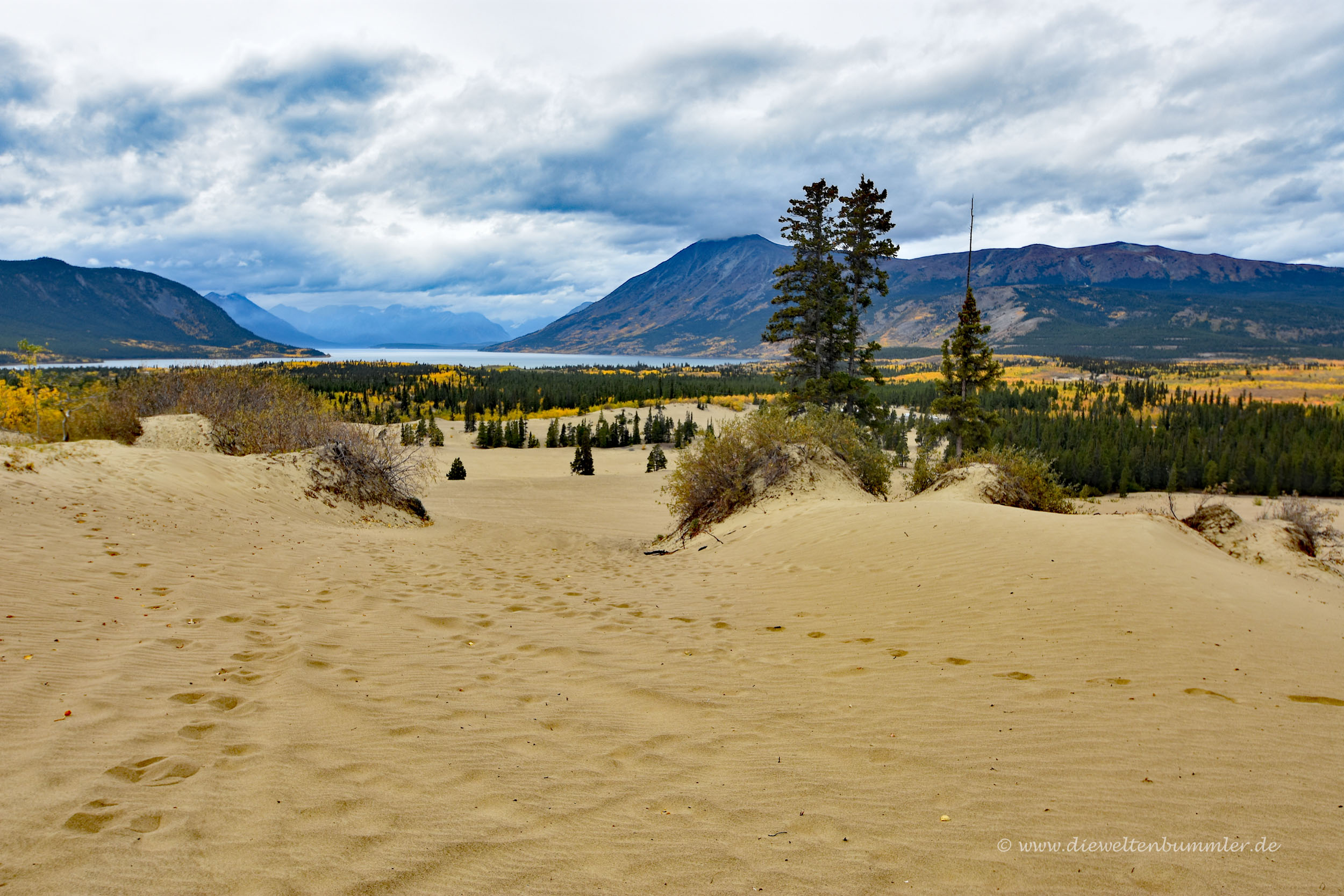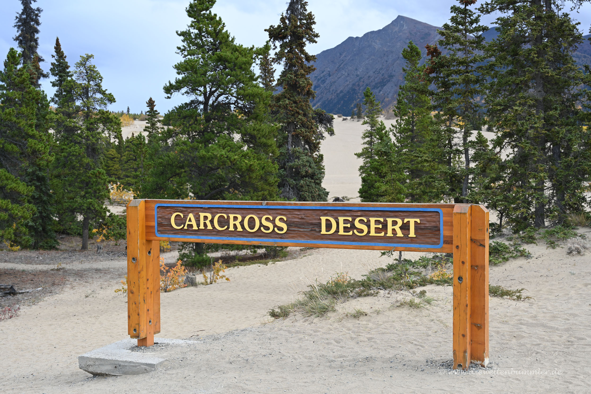 Mit ein paar Zwischenstopps an dem einen oder anderen Aussichtspunkt fuhren wir durch British Columbia zurück in den Yukon und legten unseren ersten längeren Stopp in Carcross ein. An diesem kleinen Ort sind wir bei der Hinfahrt absichtlich vorbeigefahren, weil wir die Zeit in Skagway/Alaska genießen wollten. Doch jetzt hielten wir an, denn Carcross ist bekannt für eine riesige Düne, die sich hier mitten in der Wildnis ein wenig überraschend erhebt.