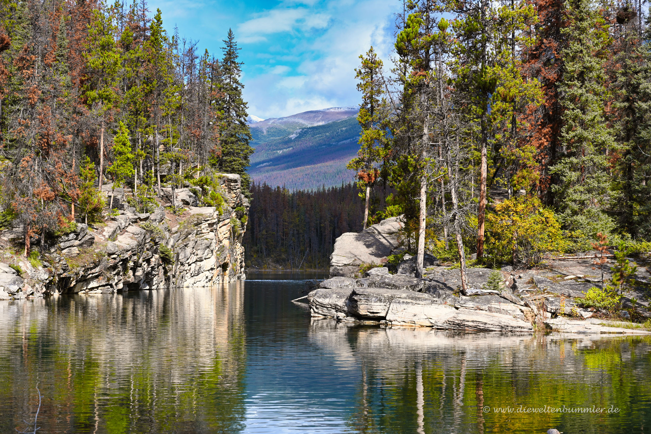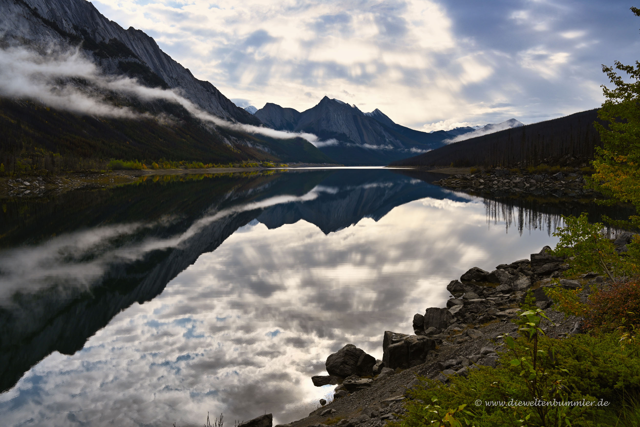 Am nächsten Tag war das Wetter nicht sehr viel besser, aber immerhin besser. Zumindest regnete es gerade nicht und die Berge waren zum Teil sichtbar. Das heißt, die Wolken hingen nicht mehr ganz so tief wie bei unserer Anreise. Unser erster Weg führte uns in ein kleines Seitental, das am Ende vom Maligne Lake begrenzt wird. Schon auf dem Weg durch dieses Tal stoppten wir mehrfach und besichtigten vereinzelte Naturschönheiten. So zum Beispiel den Maligne Canyon und auch wenig später den Medicine Lake.
