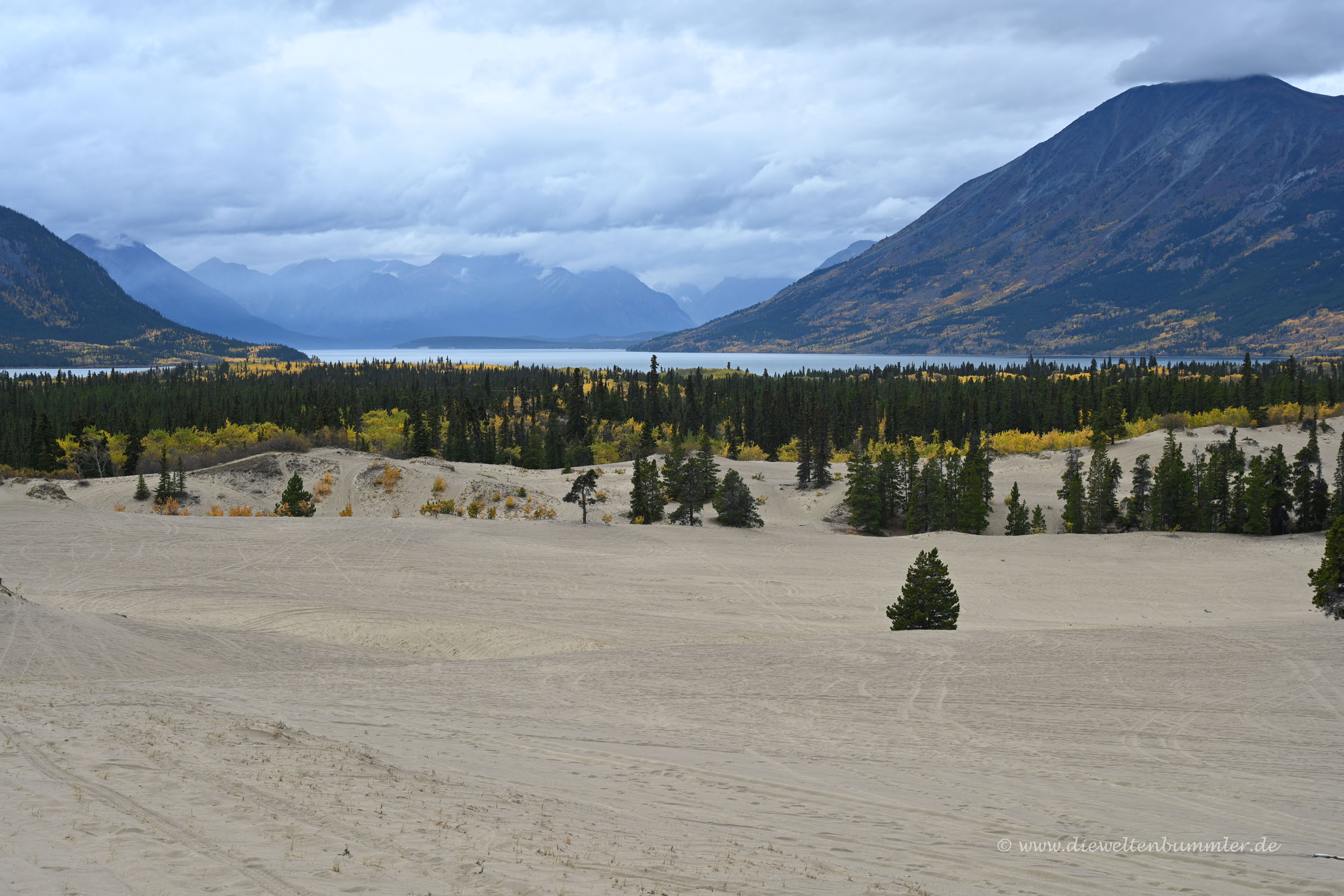 Eigentlich wollten wir nur ein paar Meter durch den Sand laufen. Aber wie das so ist, geht man dann doch bis zur Spitze der Düne. Denn von dort oben gab es natürlich eine tolle Aussicht auf die gesamte Umgebung. Ganz in der Nähe breiteten sich der Bennett Lake und der Nares Lake aus, während gleich dahinter die Berge das Landschaftsbild dominierten. Ein toller Anblick – mal wieder.