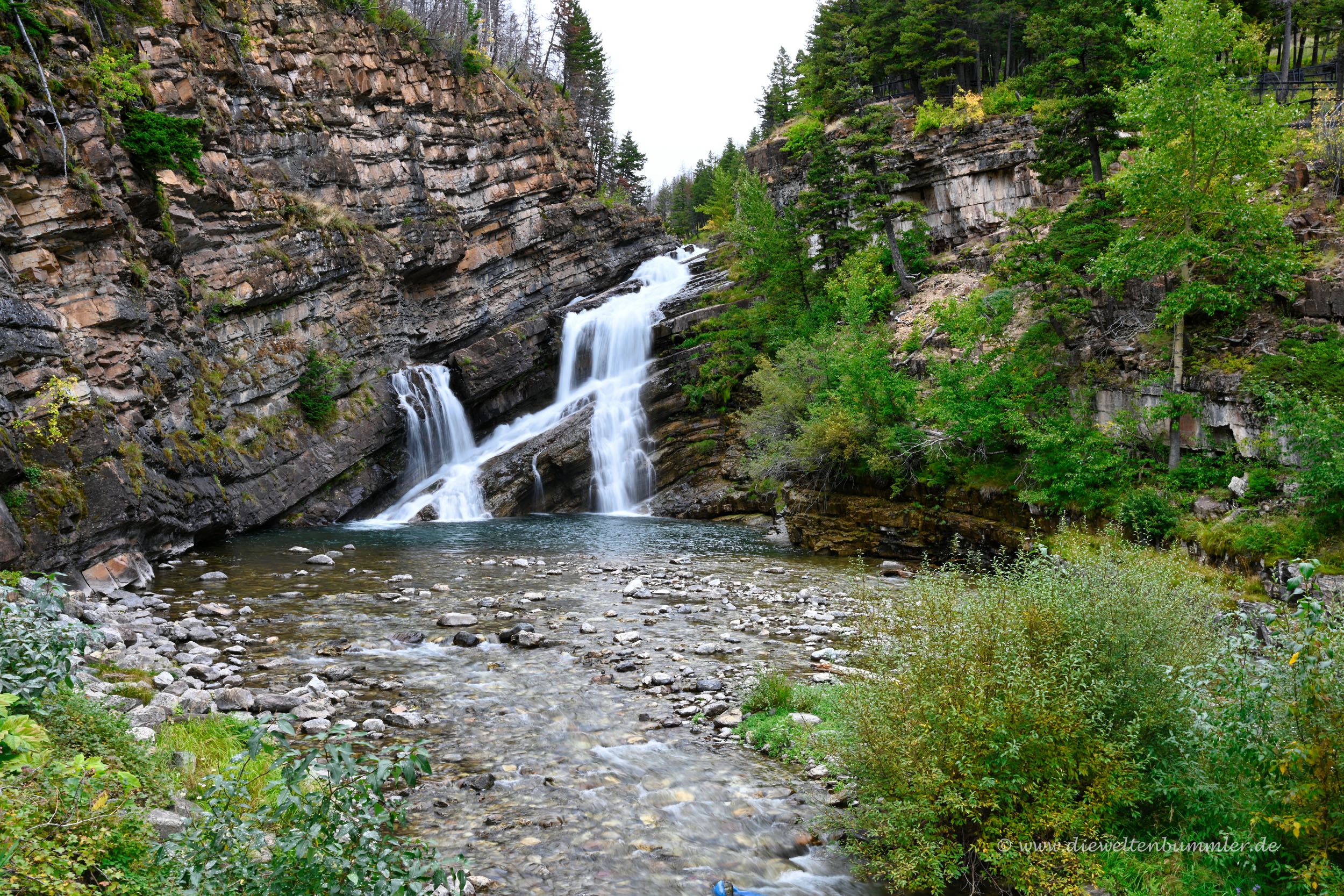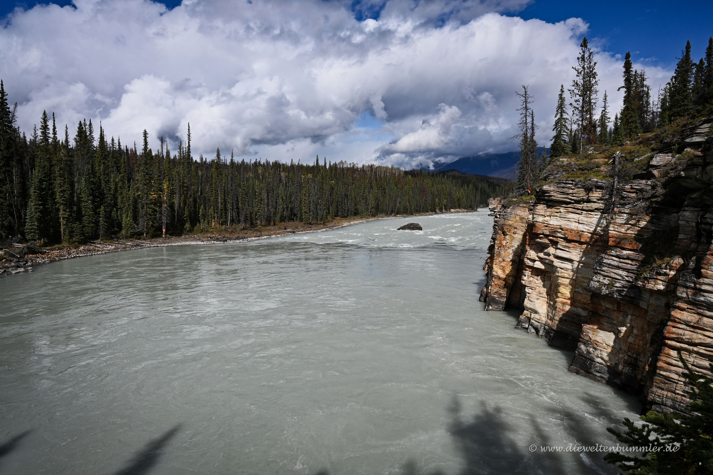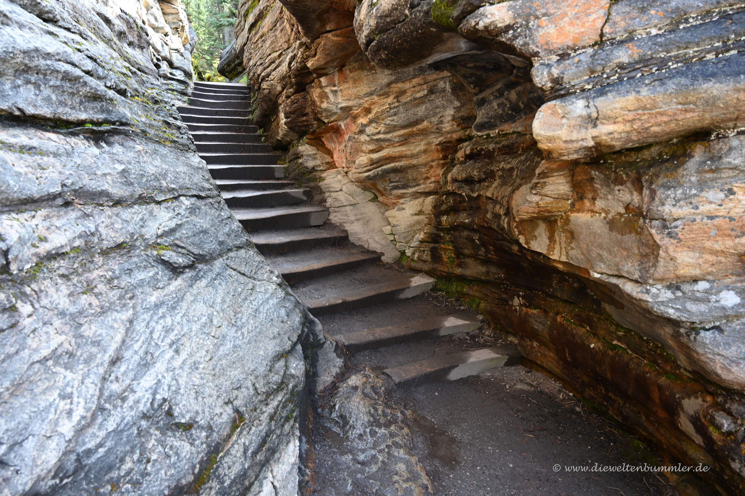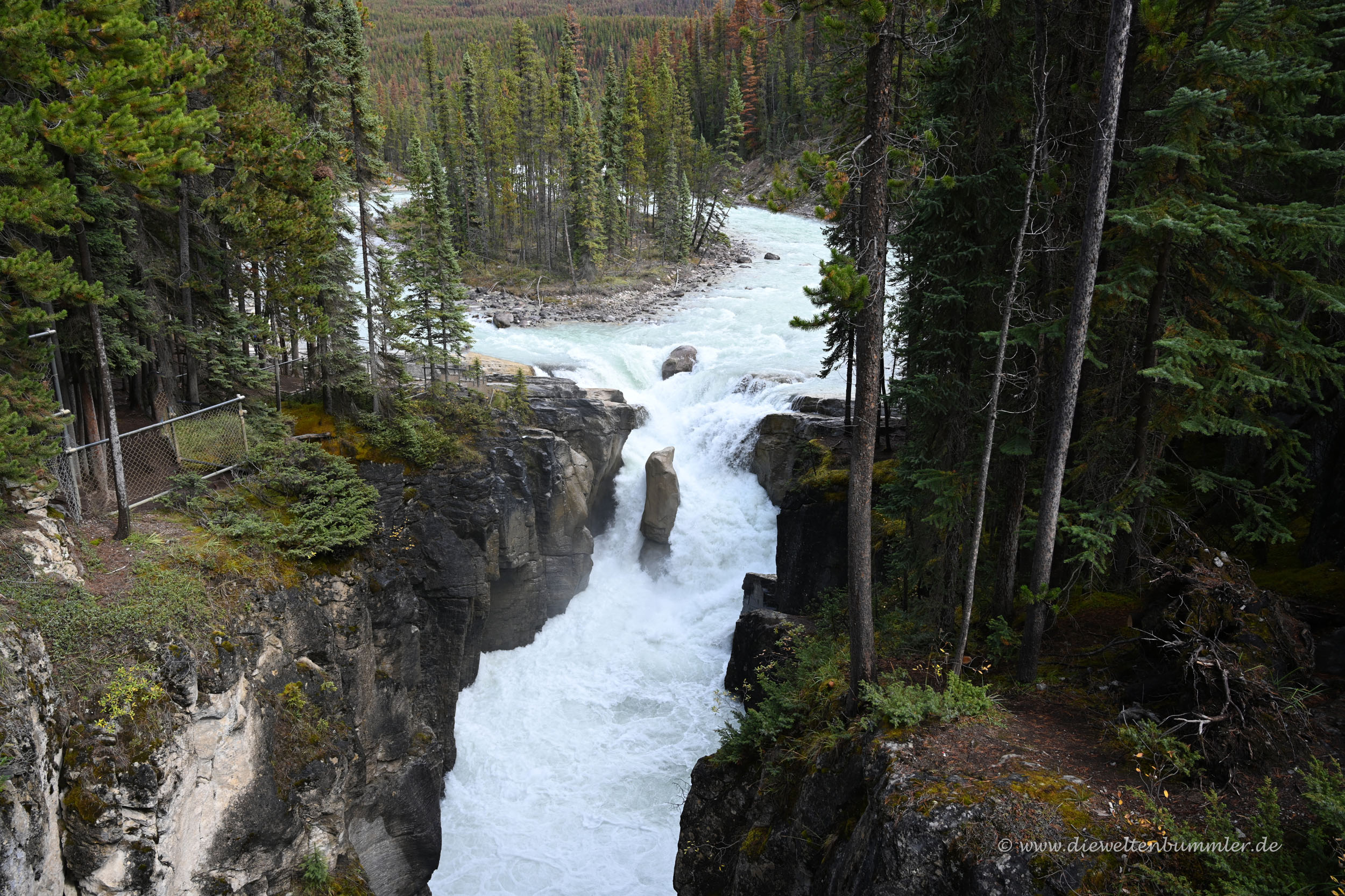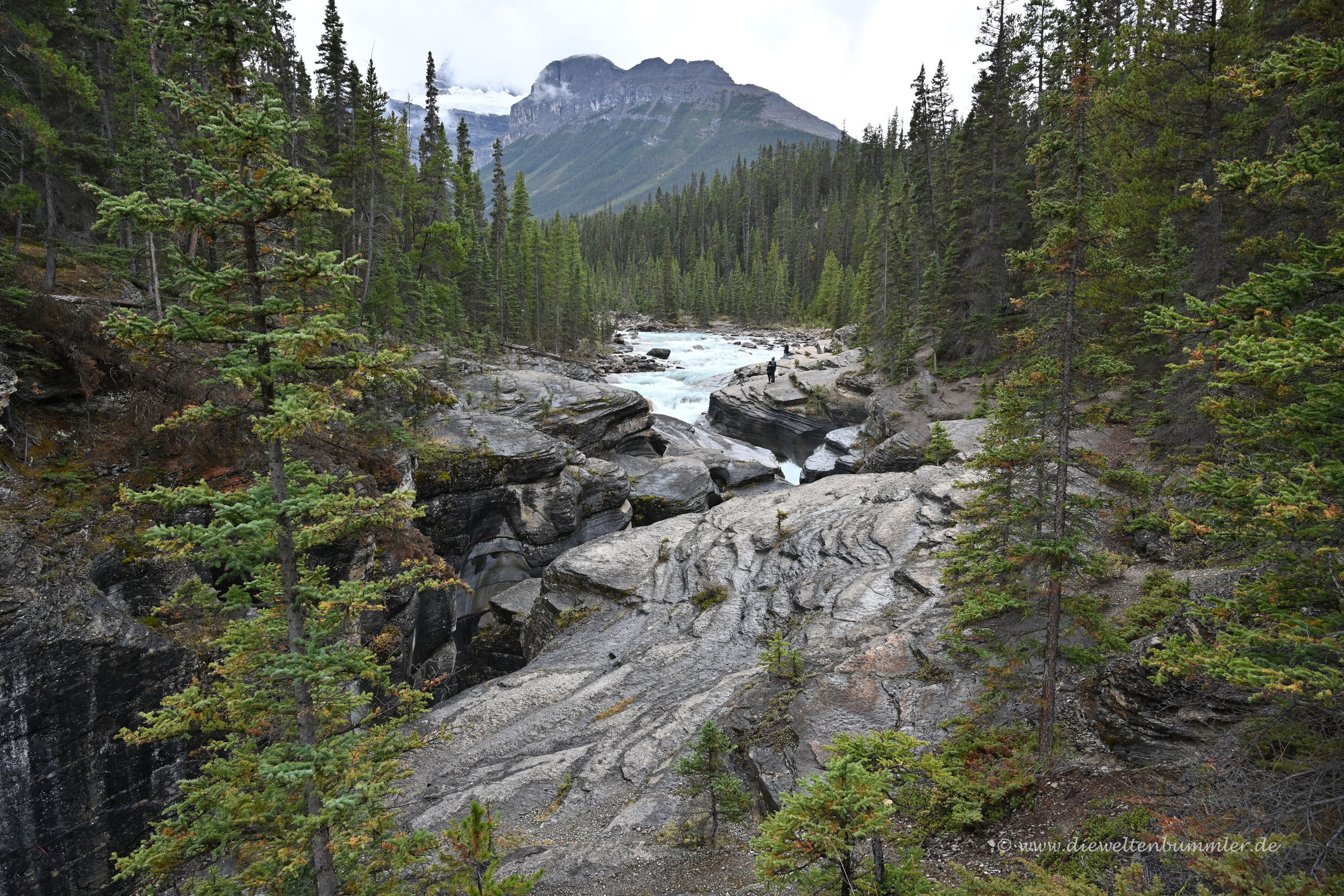 Leider wurde das Wetter immer schlechter und leider gab es auch hier gesperrte Parkplätze. Denn gerne hätten wir die beliebte Aussicht auf den Peyto Lake genossen. Doch wir kamen noch nicht einmal auf die Zufahrtsstraße, weil diese schon gesperrt war. Dafür hatten wir kurz zuvor die Möglichkeit, uns auf eine sehr kurze Wanderung zum Mistaya Canyon zu begeben. Kurzum, zu sehen gab es also jede Menge.