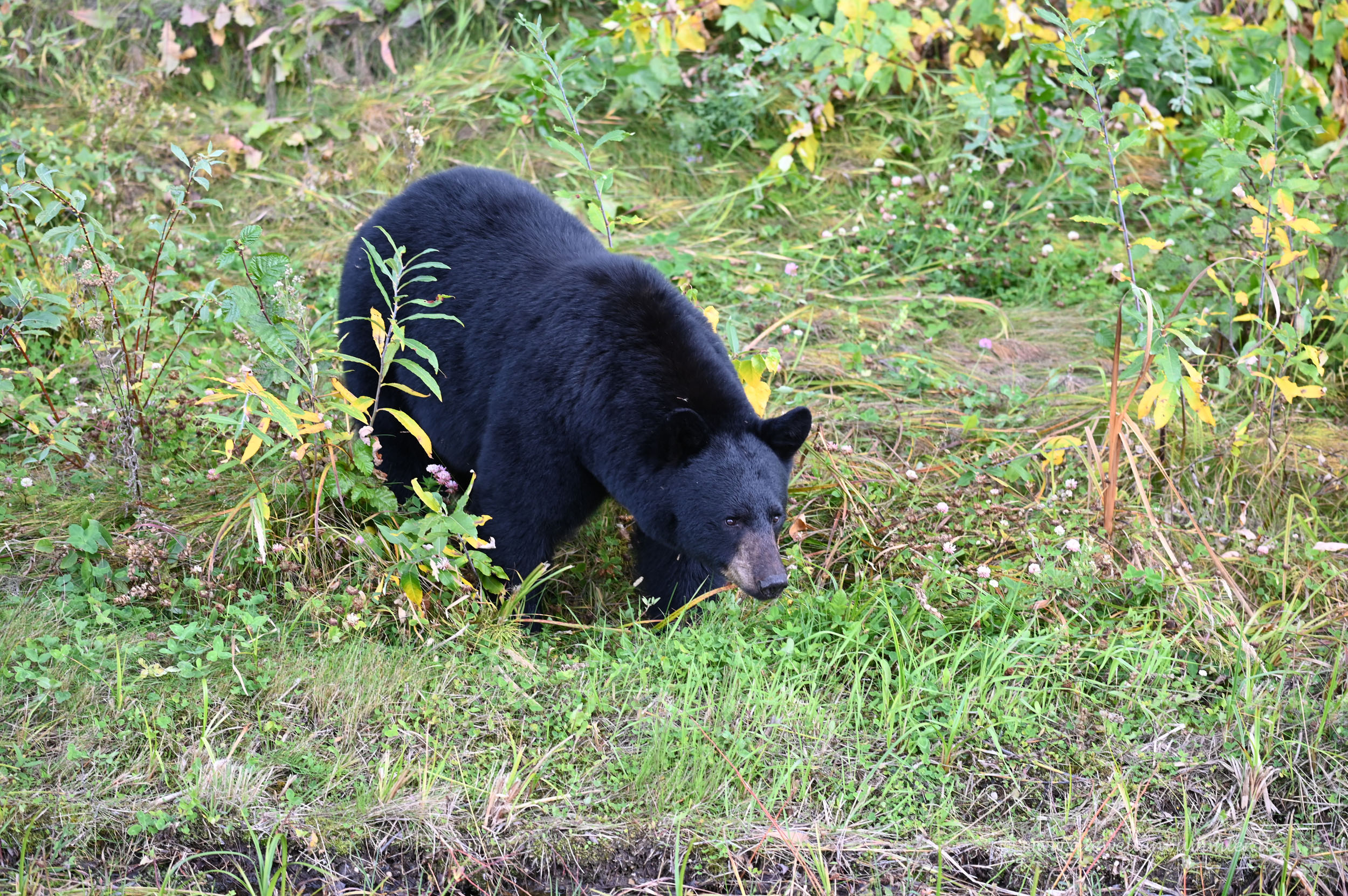 Wir gingen wieder hinab und kamen nach dieser kleinen Sandberg-Besteigung gerade am Auto an, als uns eine Dame am Straßenrand etwas zurief. Wir verstanden erst gar nicht, was und fragten noch einmal nach. Sie wiederholte, dass sich dort an der Straße in kurzer Distanz ein Schwarzbär aufhielt. Danke für den Warnruf, den wir gleich mal nutzten, um noch ein paar Bilder von einem Schwarzbären zu machen.
