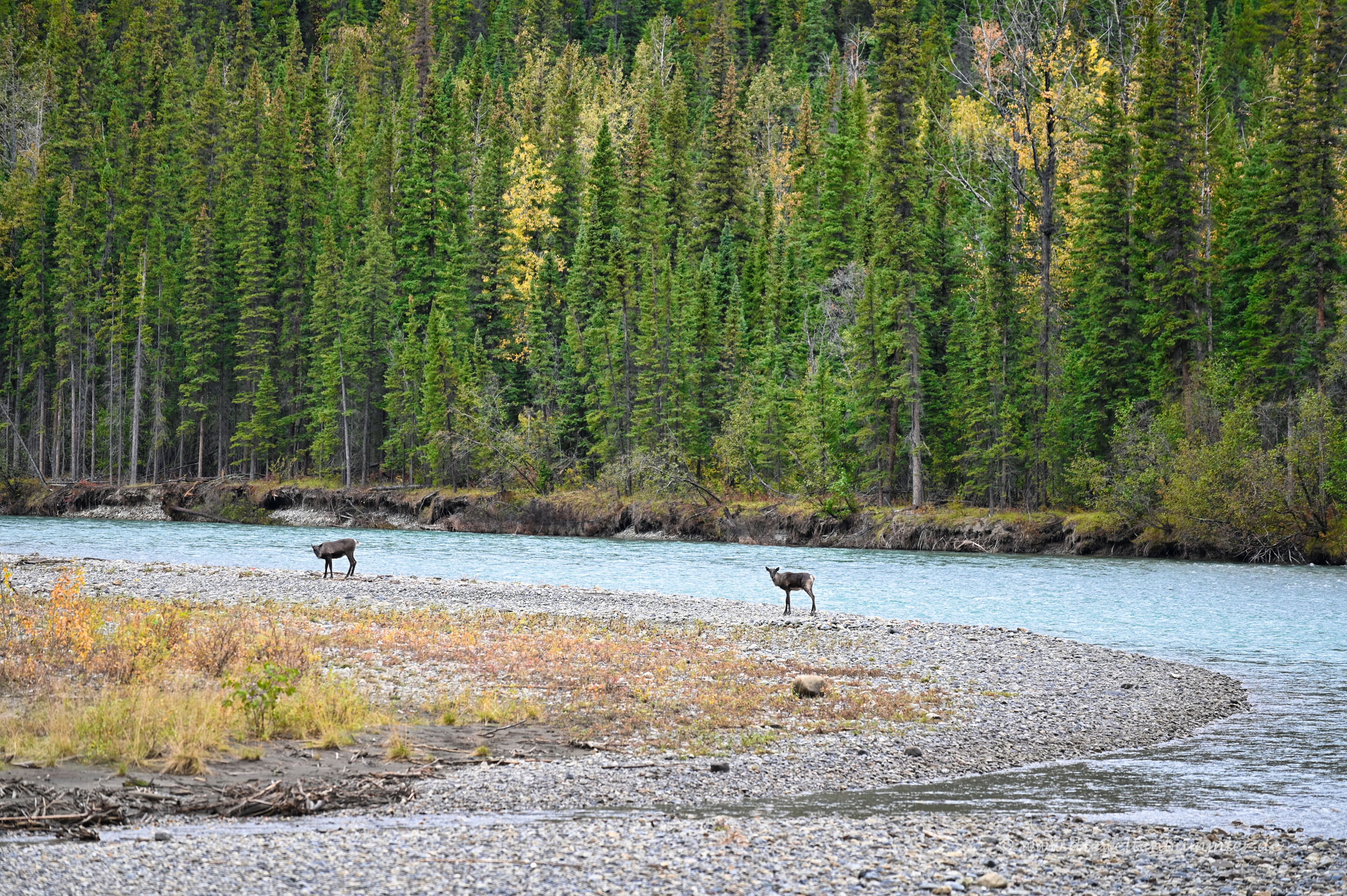 Bei Jakes Corner erreichten wir wieder den Alaska Highway und folgten ihm in südliche bzw. östliche Richtung. Auf der gesamten Strecke, die wir noch bis in die Rocky Mountains vor uns hatten, sahen wir noch jede Menge Schwarzbären, Bisons und auch Rentiere. Am Ende waren es schließlich zehn lebende Schwarzbären, die wir teilweise aus nächster Nähe und ganz für uns alleine fotografieren konnten. Weitere tote Schwarzbären, davon auch ein ganz junges, sahen wir tot am Fahrbahnrand.