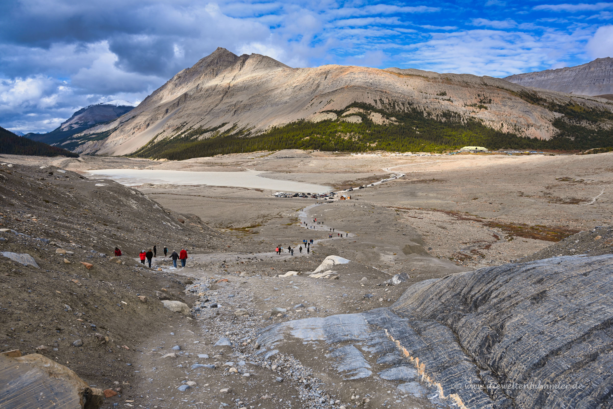 Klar, wäre der Parkplatz zugänglich gewesen, dann hätten wir natürlich angehalten und uns das mal in Ruhe angeschaut. Aber auf eine Fahrt mit dem Shuttlebus hatten wir dadurch wenig Lust. Einen längeren Stopp legten wir natürlich am Besucherzentrum ein, das Ausgangspunkt für den Athabasca-Gletscher ist. Dieser ist wiederum ein kleiner Teil des Columbia-Eisfelds, das wiederum weit oben zwischen den zahlreichen Berggipfeln liegt.