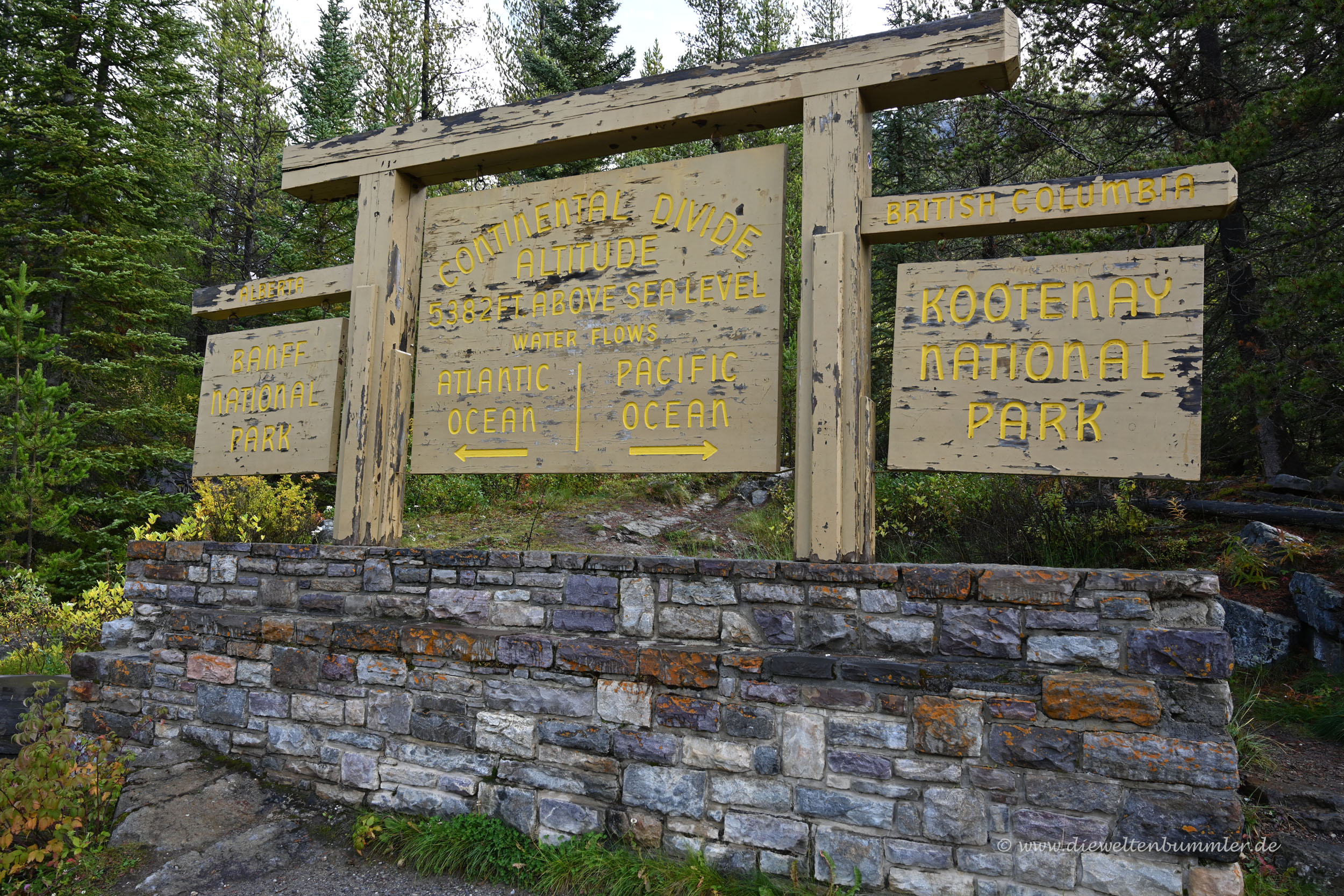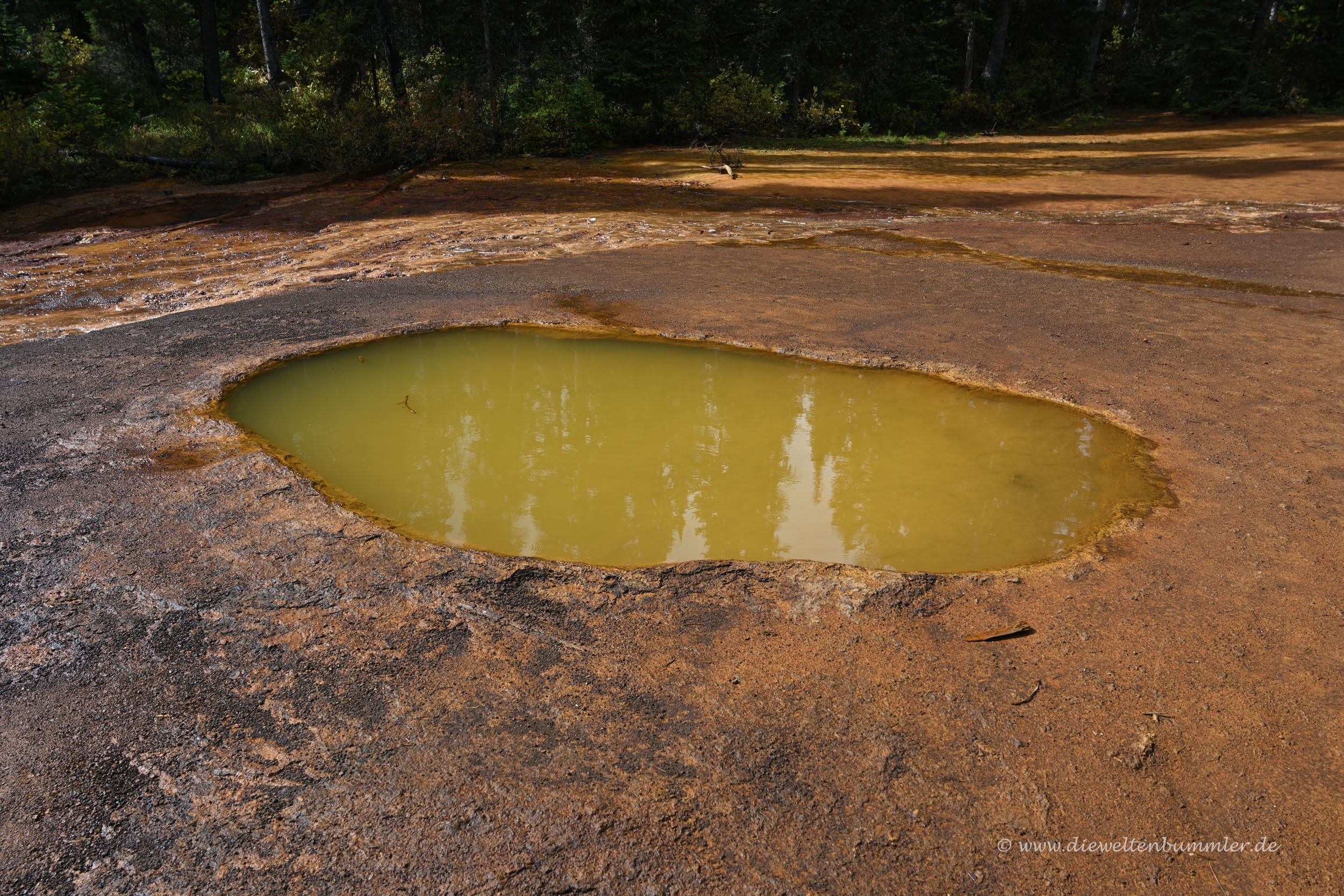 Den Kootenay Nationalpark hat man relativ schnell durchquert. Der Highway 93 führt einmal durch ihn hindurch. Wir hielten am Eingang des Parks, der gleichzeitig auch mal wieder die kontinentale Wasserscheide bildet. Wenig später stoppten wir schon wieder, als wir zu einer kleinen Wanderung zu den sogenannten Paint Pots aufbrachen.