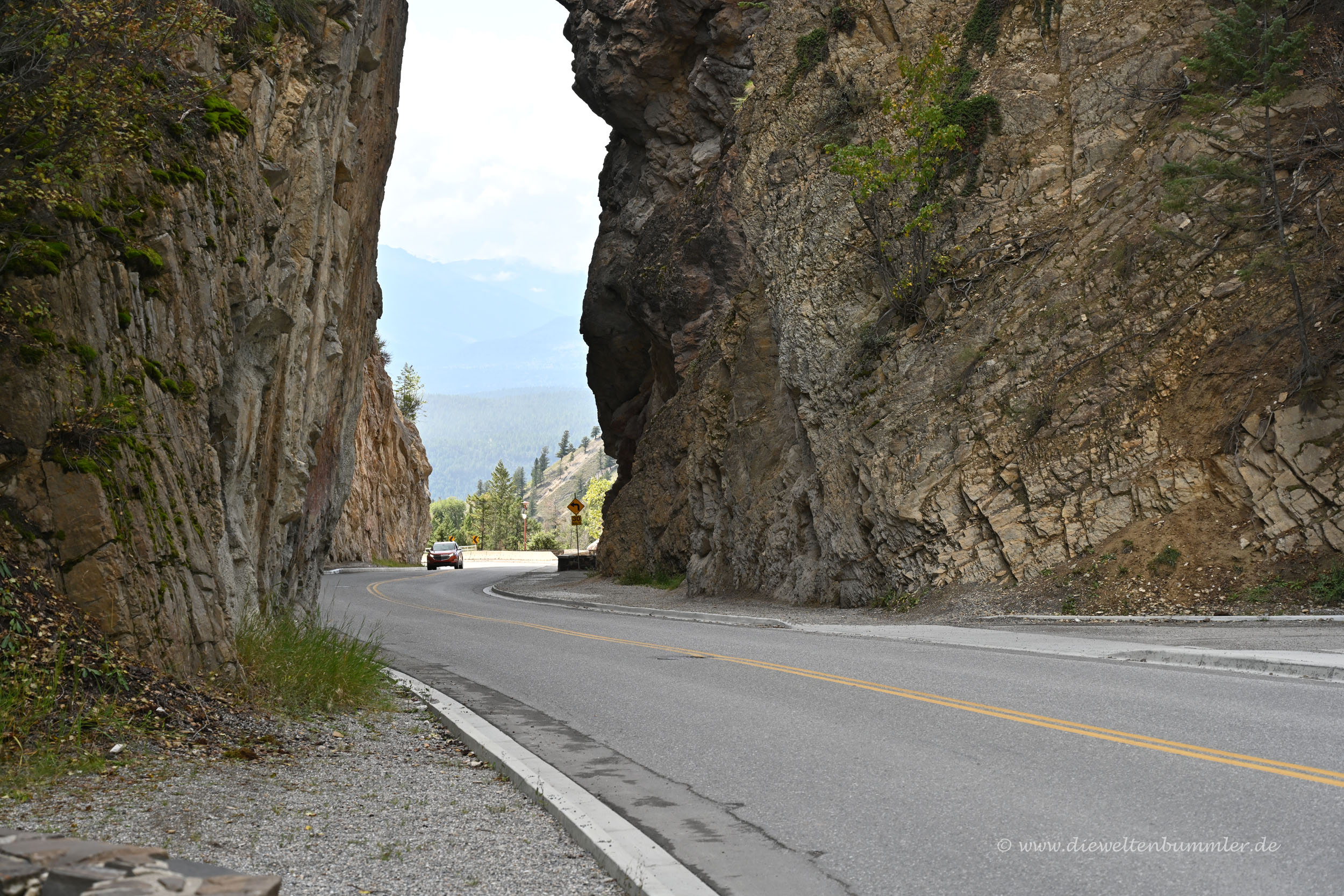 In dem Tal, das den Kootenay Nationalpark im wesentlichen bildet, hielten wir ebenfalls immer wieder an. Wir blickten auf Gewässer, die Berge und stoppten auch am Talausgang, der wiederum aus einer sehr engen Schlucht besteht. Diese Schlucht lässt sich durchfahren und schon ist man aus dem Nationalpark wieder raus. Vor einem erstreckt sich die Ortschaft Radium Hot Springs und das weite Tal des Columbia River.