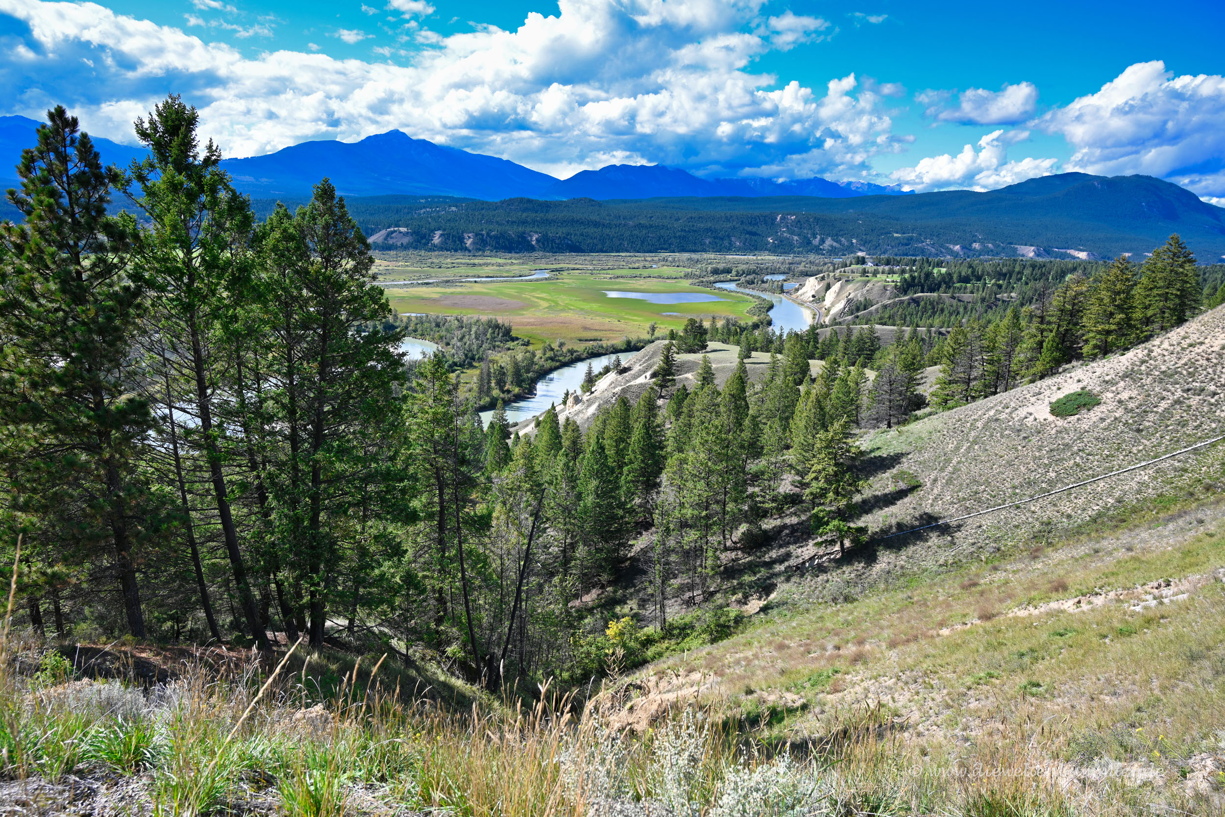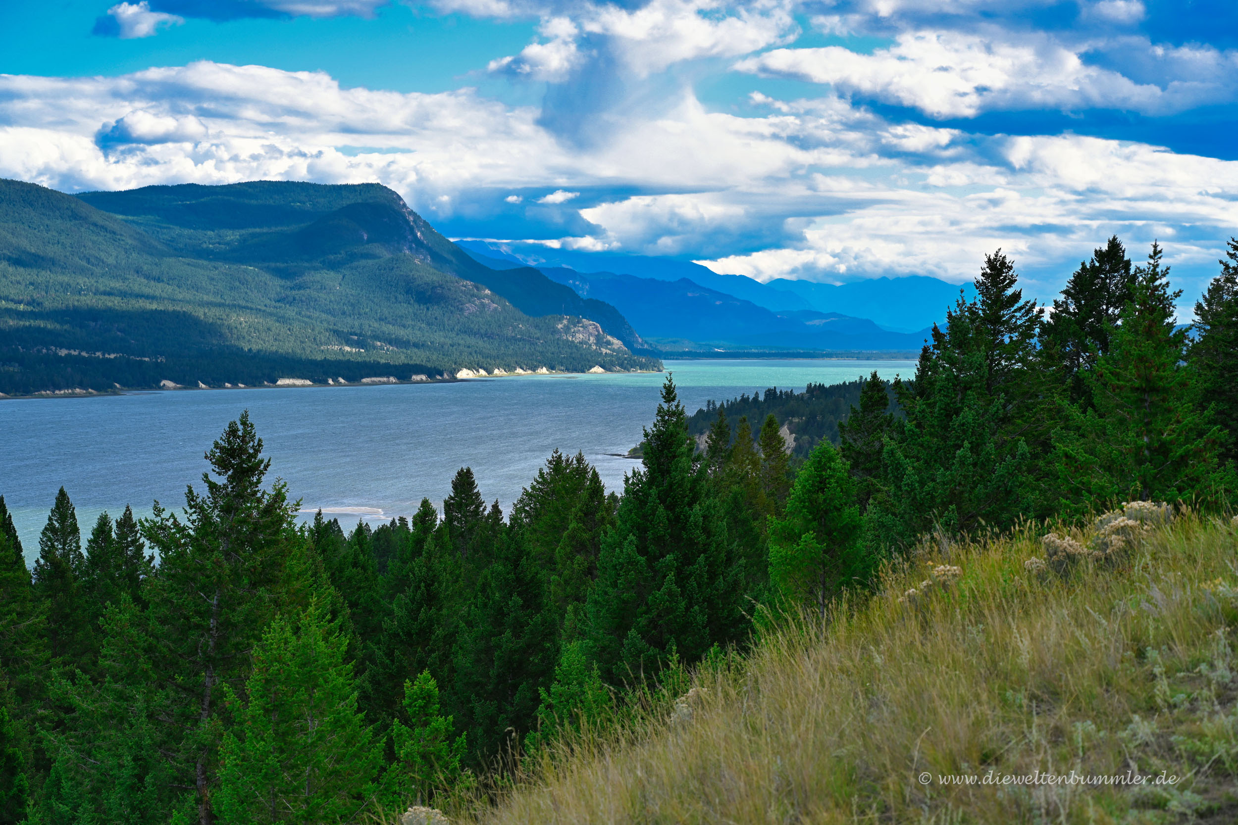 Zwar waren wir jetzt nicht mehr in einem der vielen Nationalparks, doch die Landschaft am Columbia River und vor allen Dingen die Aussichten auf das Tal waren weiterhin extrem schön. Also fuhren wir auch hier immer nur etappenweise und genossen zwischendurch den Ausblick auf den Fluss und auf den Columbia Lake, der sich nach kurzer Zeit zu unserer Rechten erstreckte.