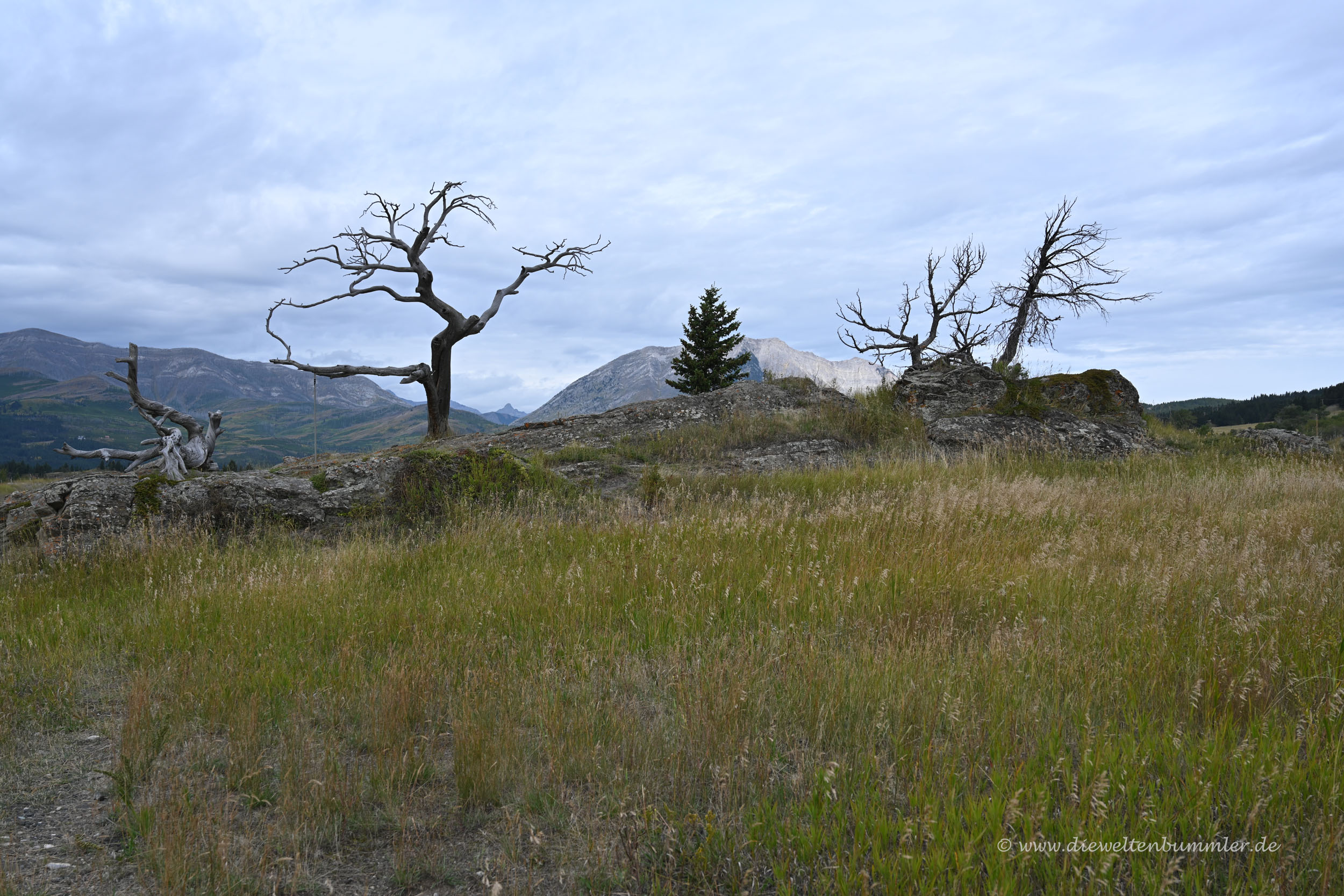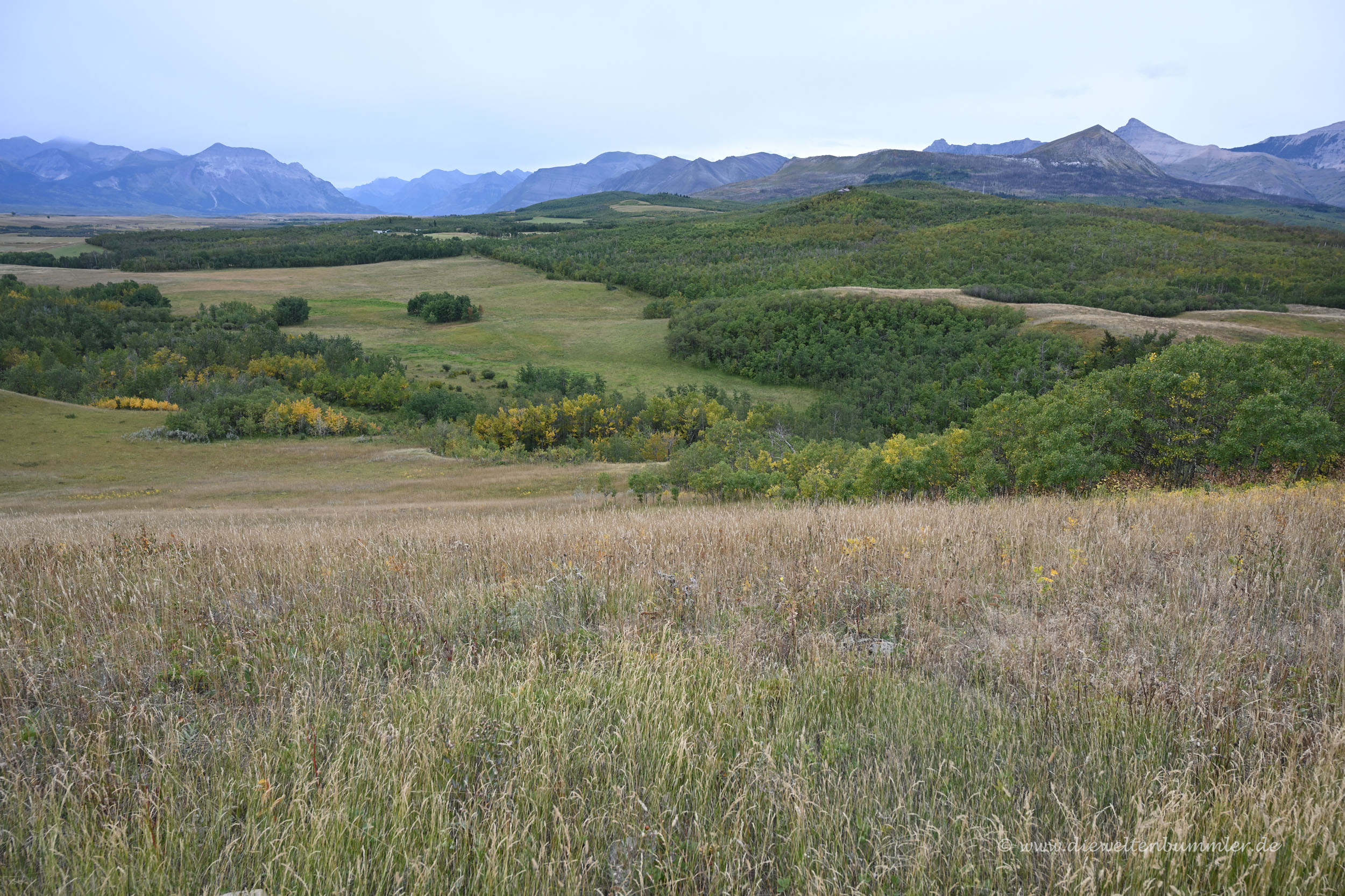 Hinter Frank Slide waren wir nun östlich der Rocky Mountains und fuhren durch die Prärie von Alberta in Richtung Süden. Die USA kamen immer näher und damit auch gleichzeitig der Abschied von Kanada. Doch vorher schauten wir uns noch einen weiteren, letzten kanadischen Nationalpark an, den Waterton Lakes Nationalpark. Seine Nähe zur USA zeigt sich darin, dass er direkt an den US-amerikanischen Glacier Nationalpark angrenzt. Bevor wir den Park erreichten, hatten wir noch einige Aussichtspunkte, an denen wir schon einen ersten Eindruck von der Gebirgslandschaft erhalten konnten.