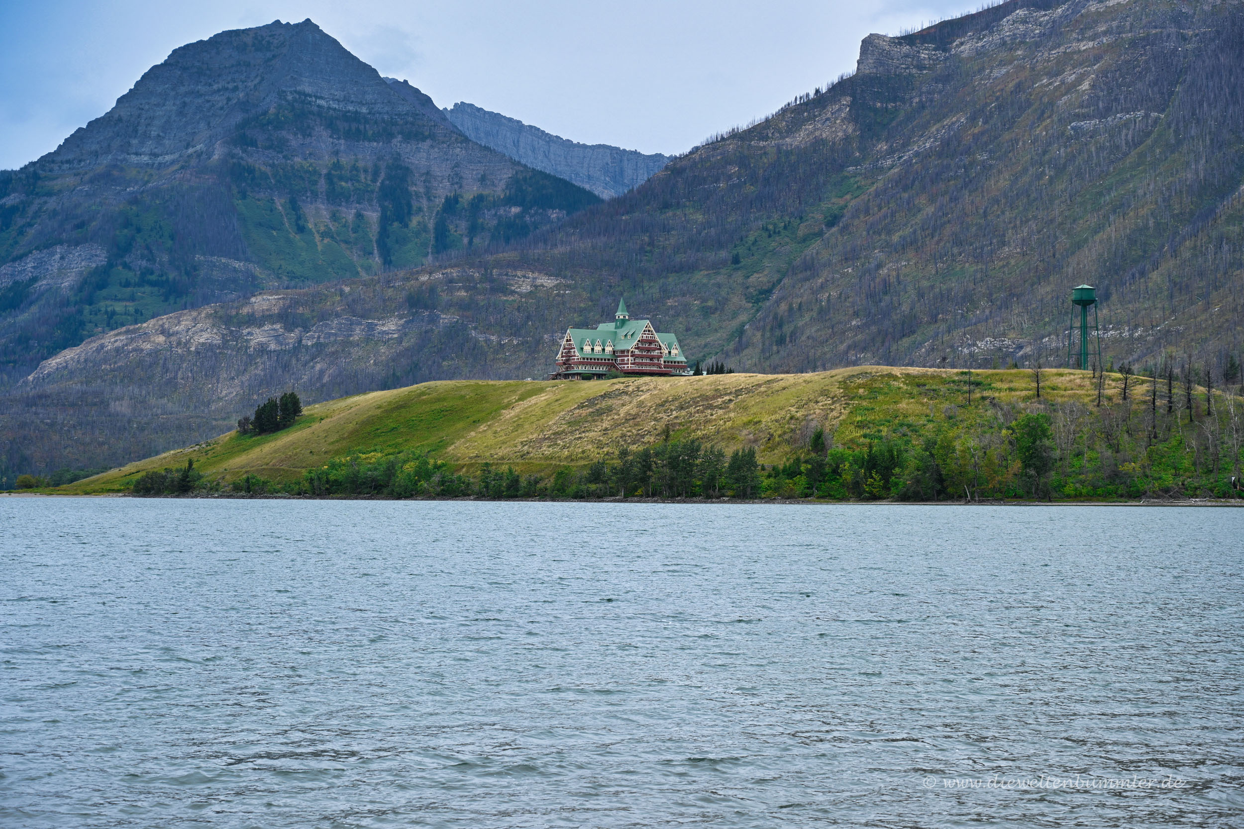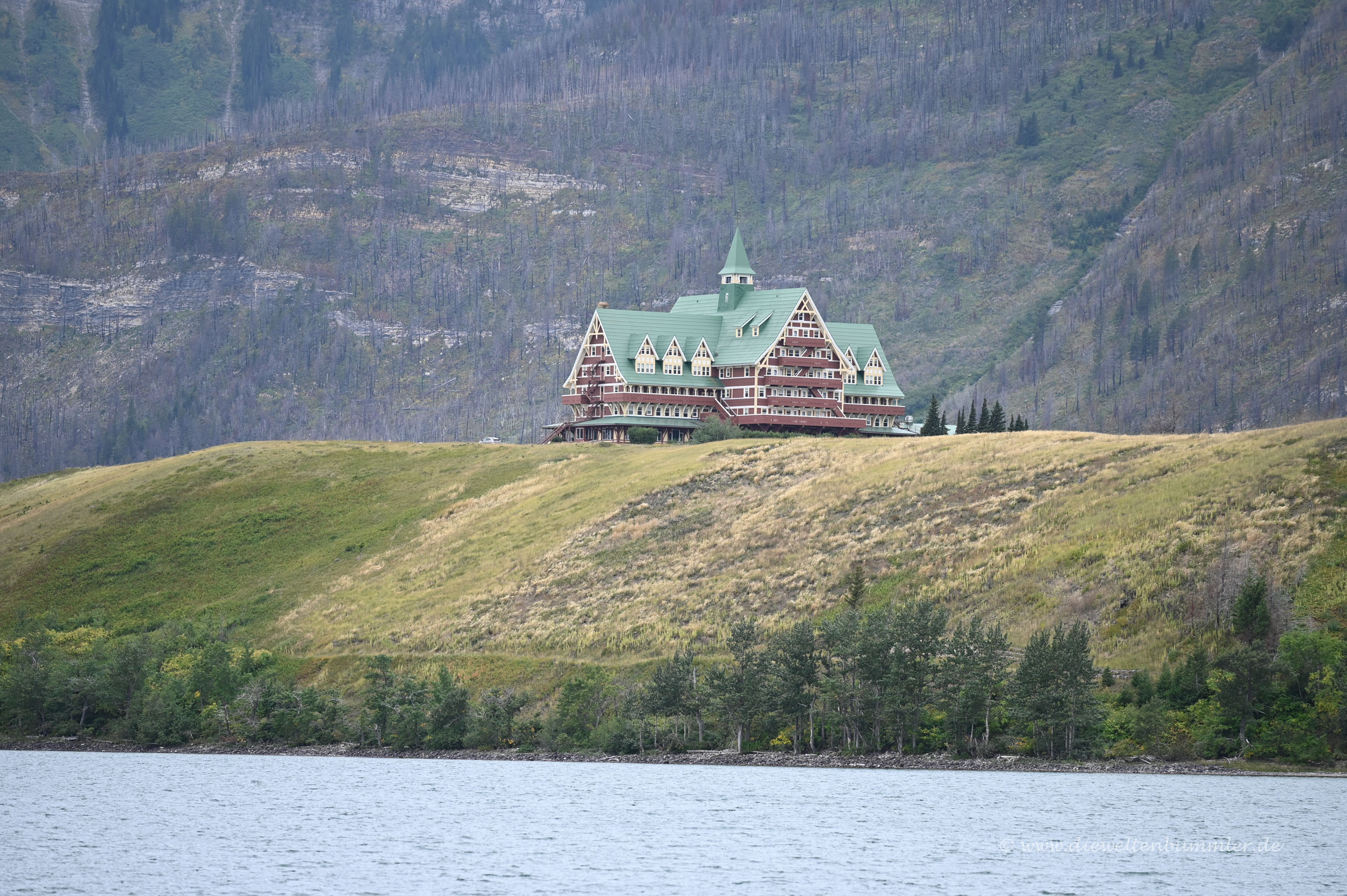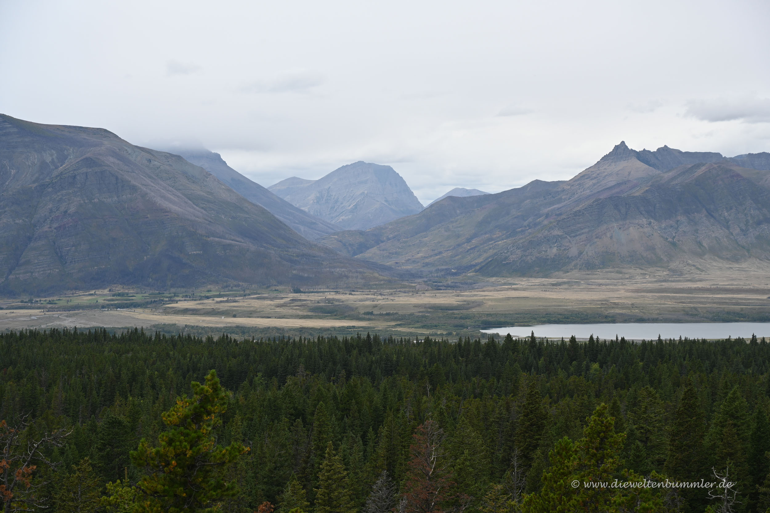 Danach ging es, natürlich wieder gegen Gebühr, in den Nationalpark hinein. Wie ich schon in einem früheren Teil dieses Reiseberichts schrieb, lohnte sich für uns keine Jahreskarte, da wir eben nur in vier kostenpflichtigen kanadischen Nationalparks unterwegs waren. Waterton Lakes war nun der vierte und überraschte uns mit einer gewissen Trostlosigkeit. Einerseits lag das auch mal wieder am schlechten Wetter und den tief hängenden Wolken. Aber andererseits spürten wir, dass hier irgendetwas nicht so ist, wie es sein sollte.