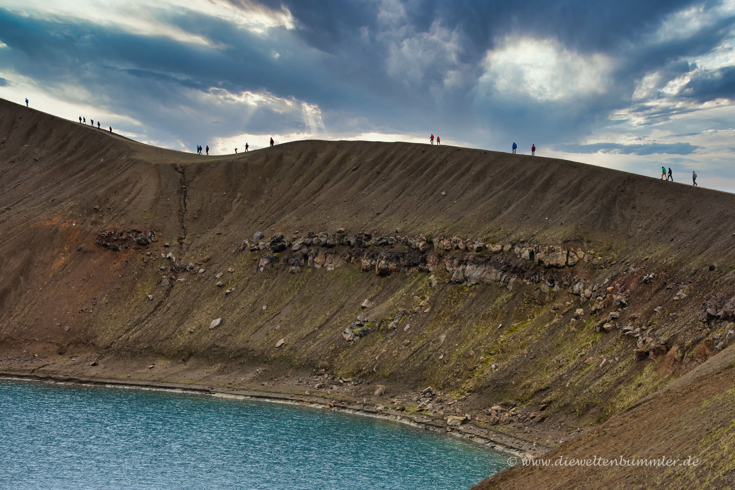 Der Krater ist ein Maar, wie man auch die Maare aus der Vulkaneifel kennt. Nur ist es hier in Island nicht so schön grün zugewachsen, sondern noch ursprünglich. Eine raue Landschaft umgibt den Krater mit seinem See, dessen Wasser leicht grünlich schimmert.