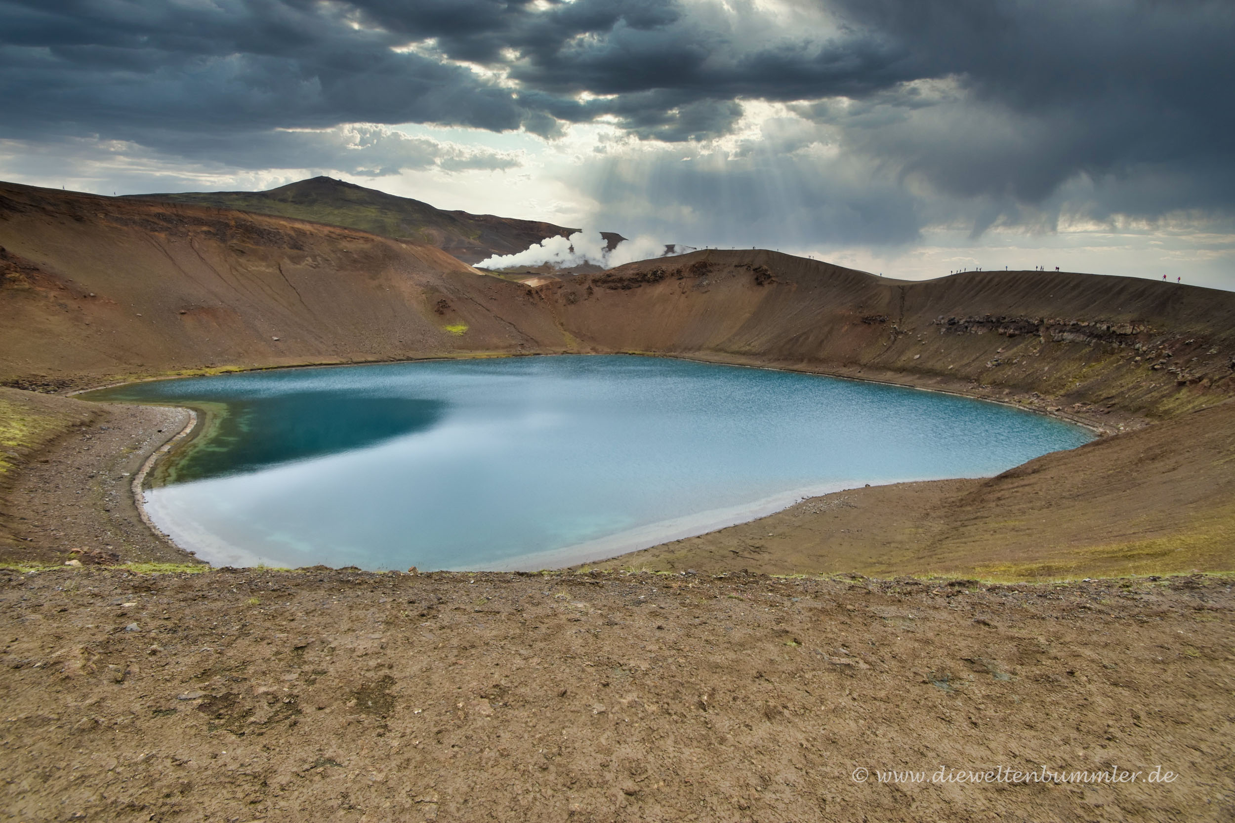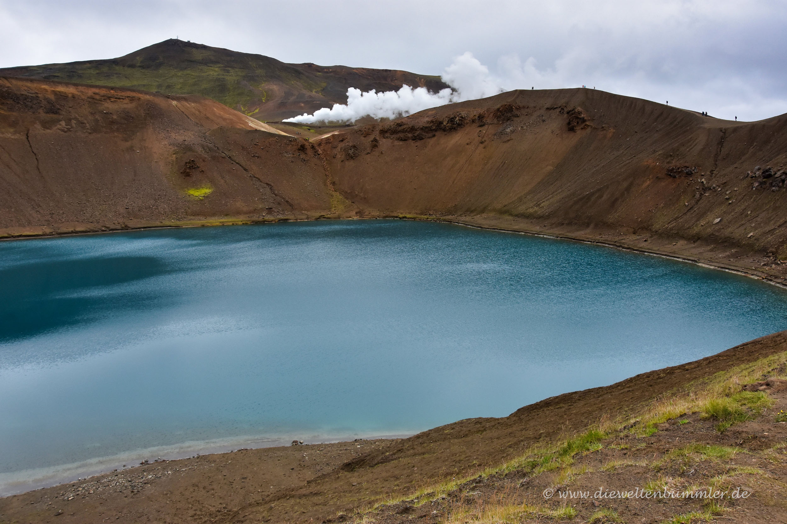 Die Straße ist übrigens eine Sackgasse und nicht viel später kommen zwei Parkplätze. Einer auf der linken Seite ist Ausgangspunkt für eine Wandertour zum Leirhnjukur, einem Gipfel an den Lavafeldern von Krafla. Der andere Parkplatz befindet sich direkt am Rande eines Kratersees. Dieser heißt Víti und entstand in der ersten Hälfte des 18. Jahrhunderts durch vulkanische Tätigkeit – logisch.