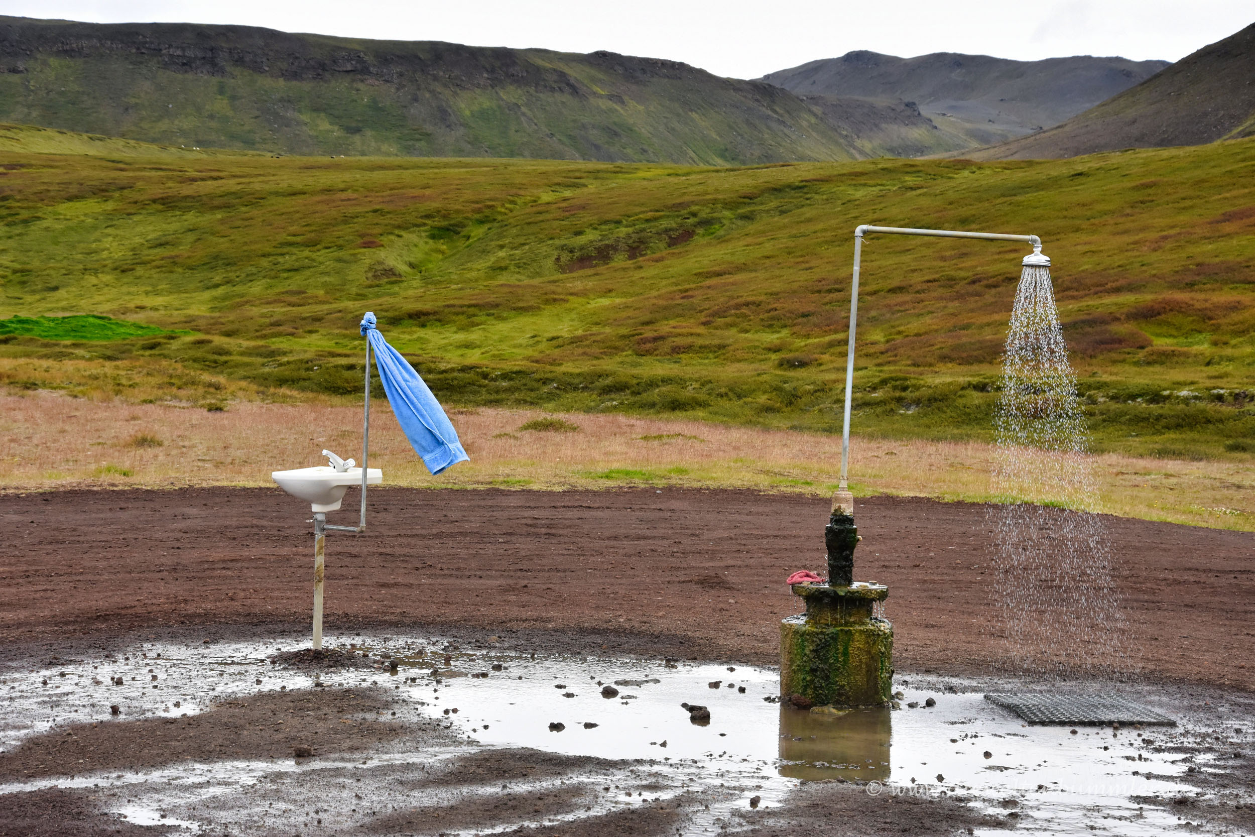 Kurz hinter dem Krafla-Kraftwerk sahen wir am Straßenrand sogar noch eine Dusche, aus der dauerhaft heißes Wasser sprudelte. Daneben noch ein Waschbecken mit Handtuch. Irgendwie unvorstellbar, aber schön.