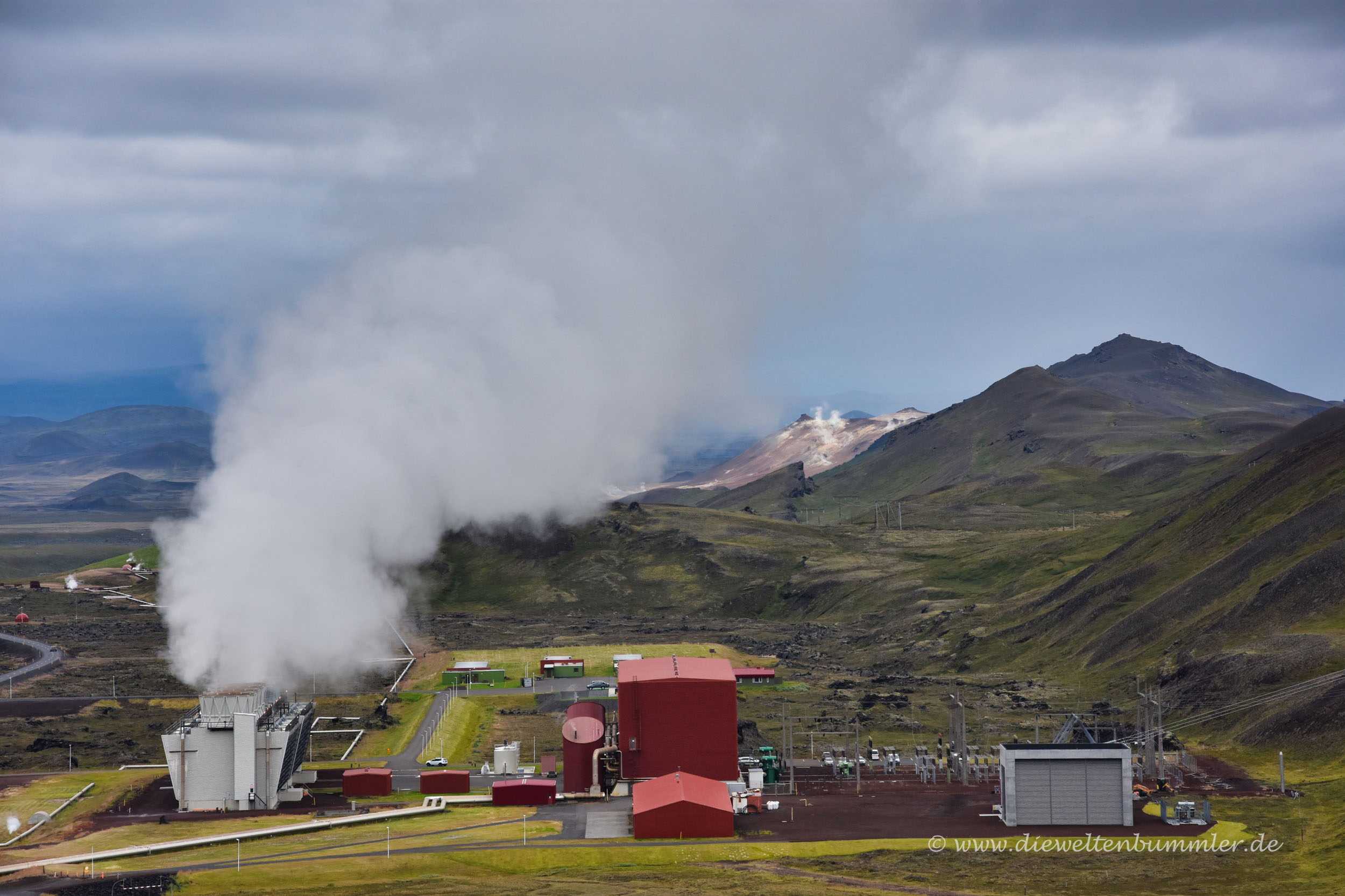 Weniger sehenswert, aber sicherlich technisch sehr interessant, ist das Krafla-Kraftwerk, das wir unterwegs auch noch passierten. Dass es sich um ein Kraftwerk handelt, ist zwar irgendwie offensichtlich, aber für uns in dieser Form eher unbekannt. Wir kennen Kraftwerke, gleich welcher Art, in der Regel mit hohen Kühltürmen und Schloten an einem zentralen, eingezäunten Ort.