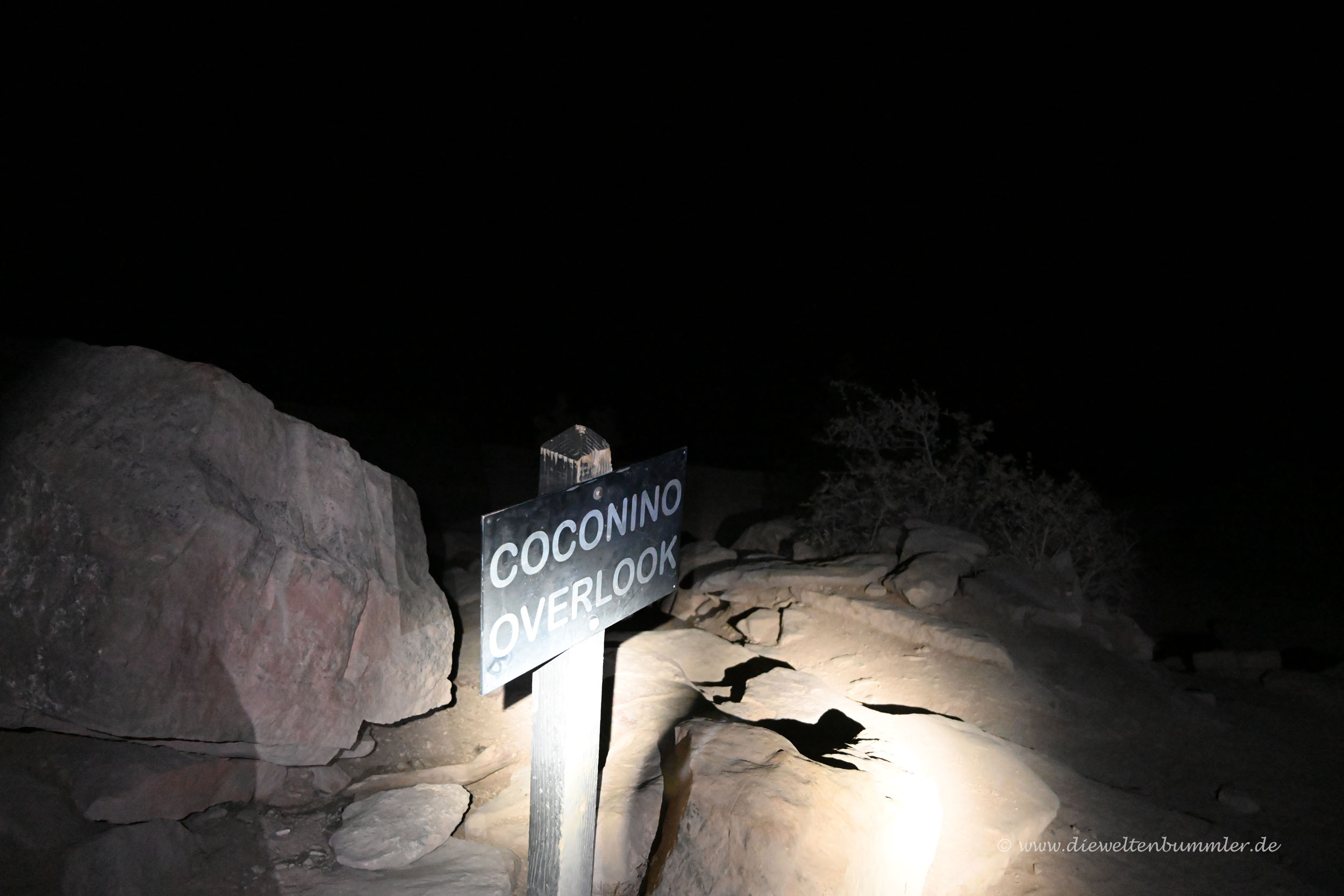 Irgendwann vor vier Uhr klingelte unser Wecker und riss uns aus dem warmen Schlafsack. Wir machten uns fertig, schnappten uns unsere Sachen, die wir am Vorabend schon gepackt hatten und zogen los. Gegen halb fünf standen wir an der dunklen Rezeption des Campingplatzes und marschierten zum Einstieg in den North Kaibab Trail. Dieser befand sich rund eineinhalb Kilometer von unserer Parzelle entfernt, womit wir schon mal den ersten und leichtesten Teil der Wanderung hinter uns brachten.