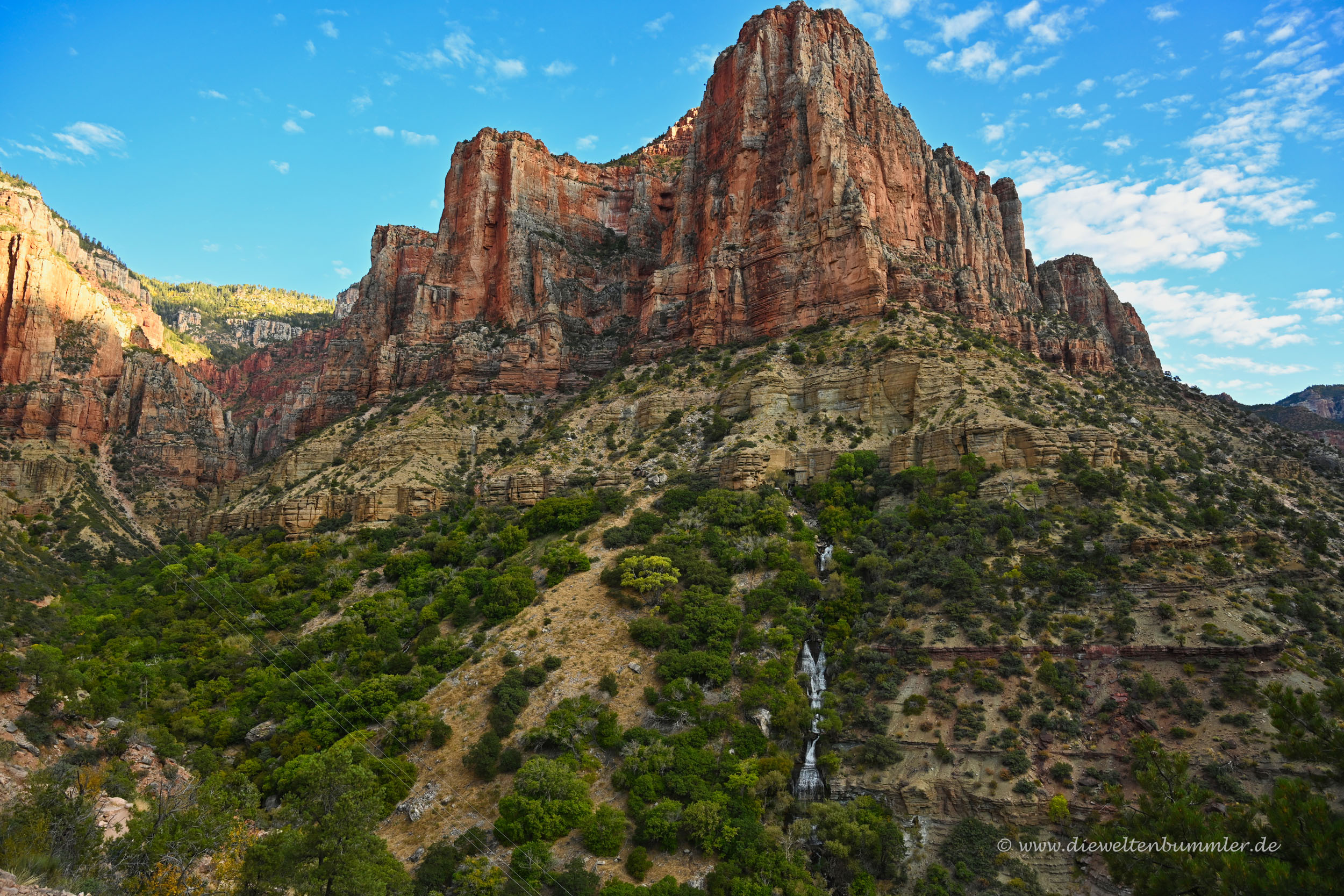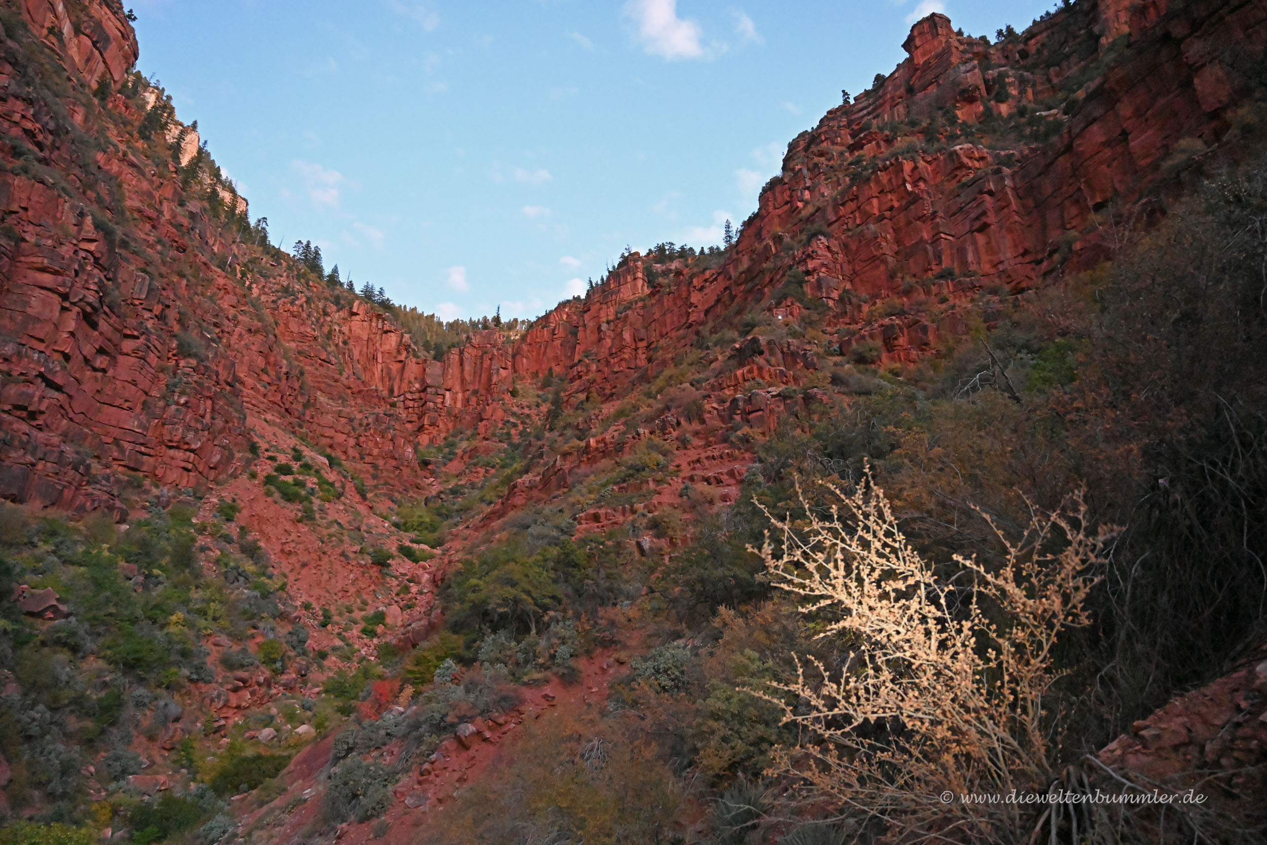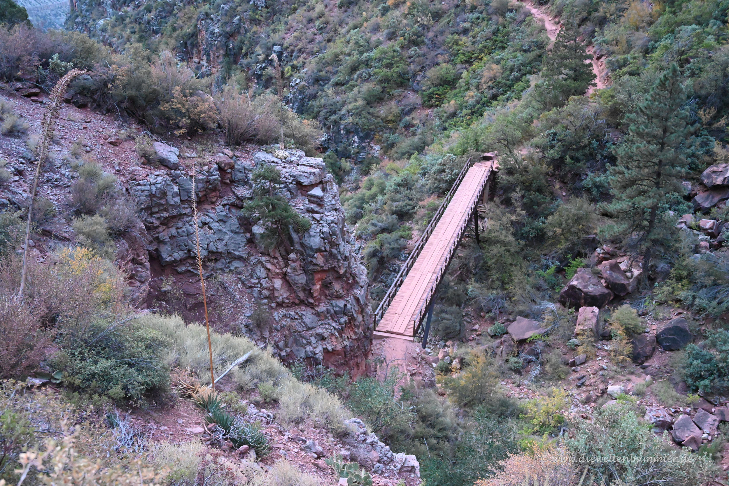 Dieser Roaring Springs Canyon mündet in einen größeren Seitencanyon des Grand Canyon. An der Einmündung befindet sich der Roaring Springs genannte Wasserfall und eine erste Station gleichen Namens, an der man Pause machen und Wasser auftanken könnte. Wer sich für eine Wanderung durch den Grand Canyon vorbereitet, sollte sich aber im Vorfeld darüber informieren, welche Stationen geöffnet sind. Roaring Springs war an dem Tag unserer Wanderung zum Beispiel nicht zugänglich, was wir aber zuvor wussten.