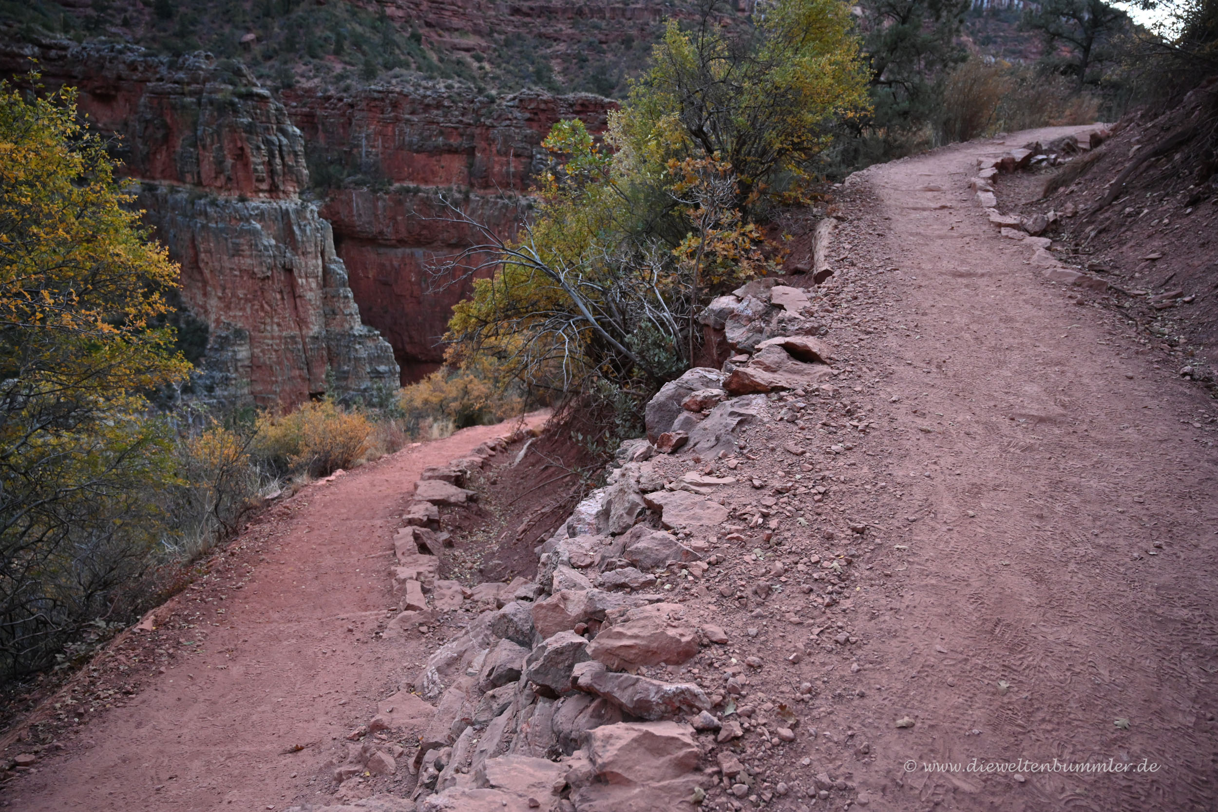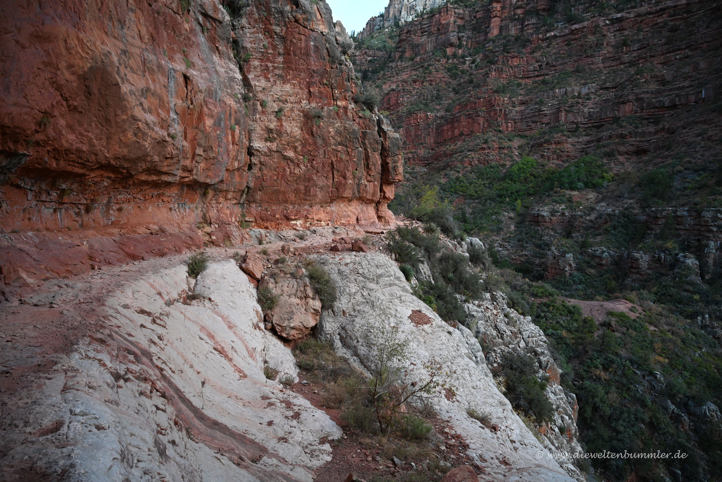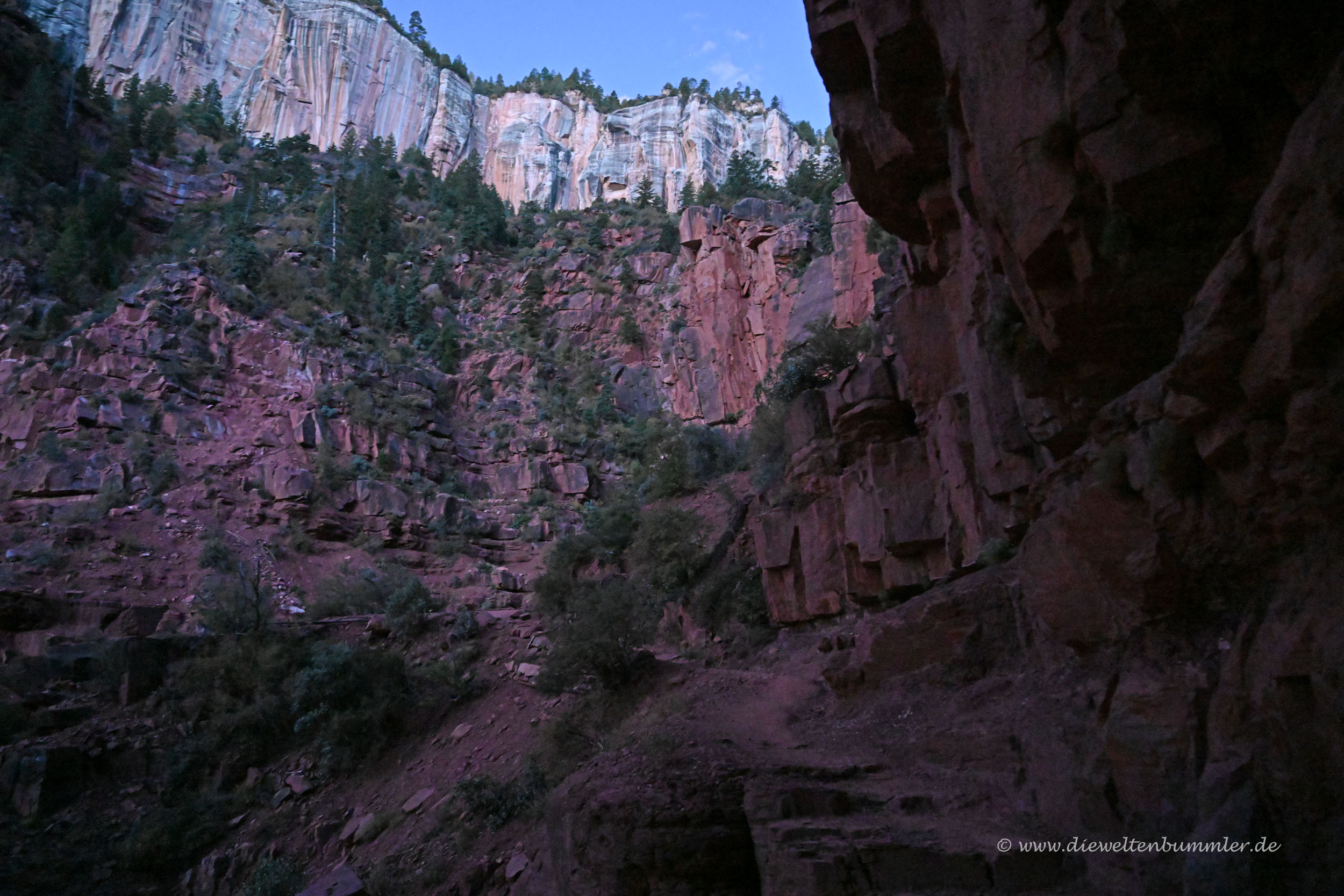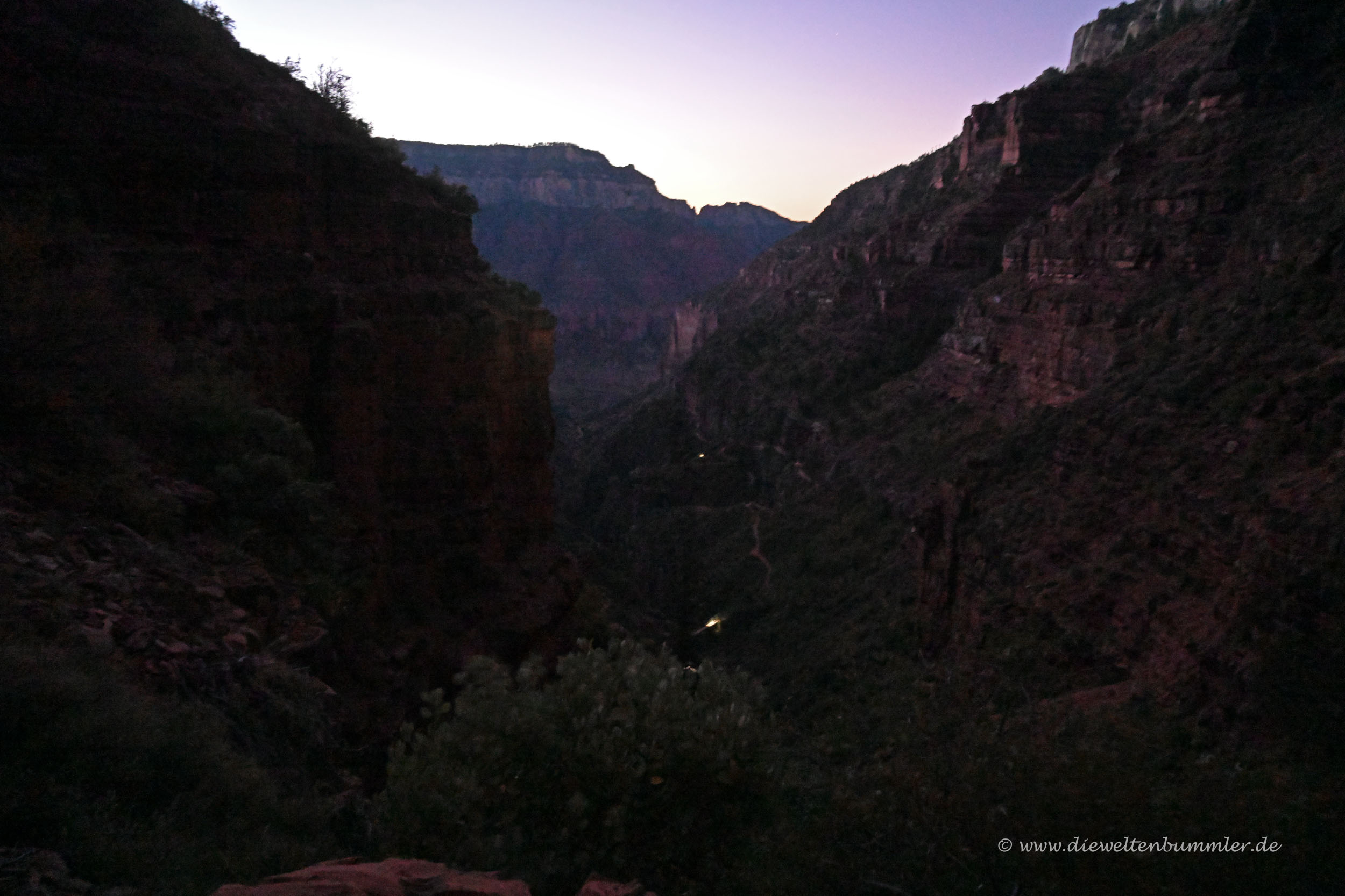 Von der Aussicht hatten wir natürlich noch nichts. Daher gingen wir weiter und immer tiefer in den Canyon hinein. Streng genommen sind wir hier nur in einem Seitental des Grand Canyon, nämlich im Roaring Springs Canyon. Ein bisschen beklemmend war die Wanderung schon, weil es eben dunkel war und wir spürten, wie sich auf der einen Seite die Felswand steil erhob und auf der anderen Seite ein falscher Schritt der letzte sein würde. Denn da ging es hinab in den Abgrund.