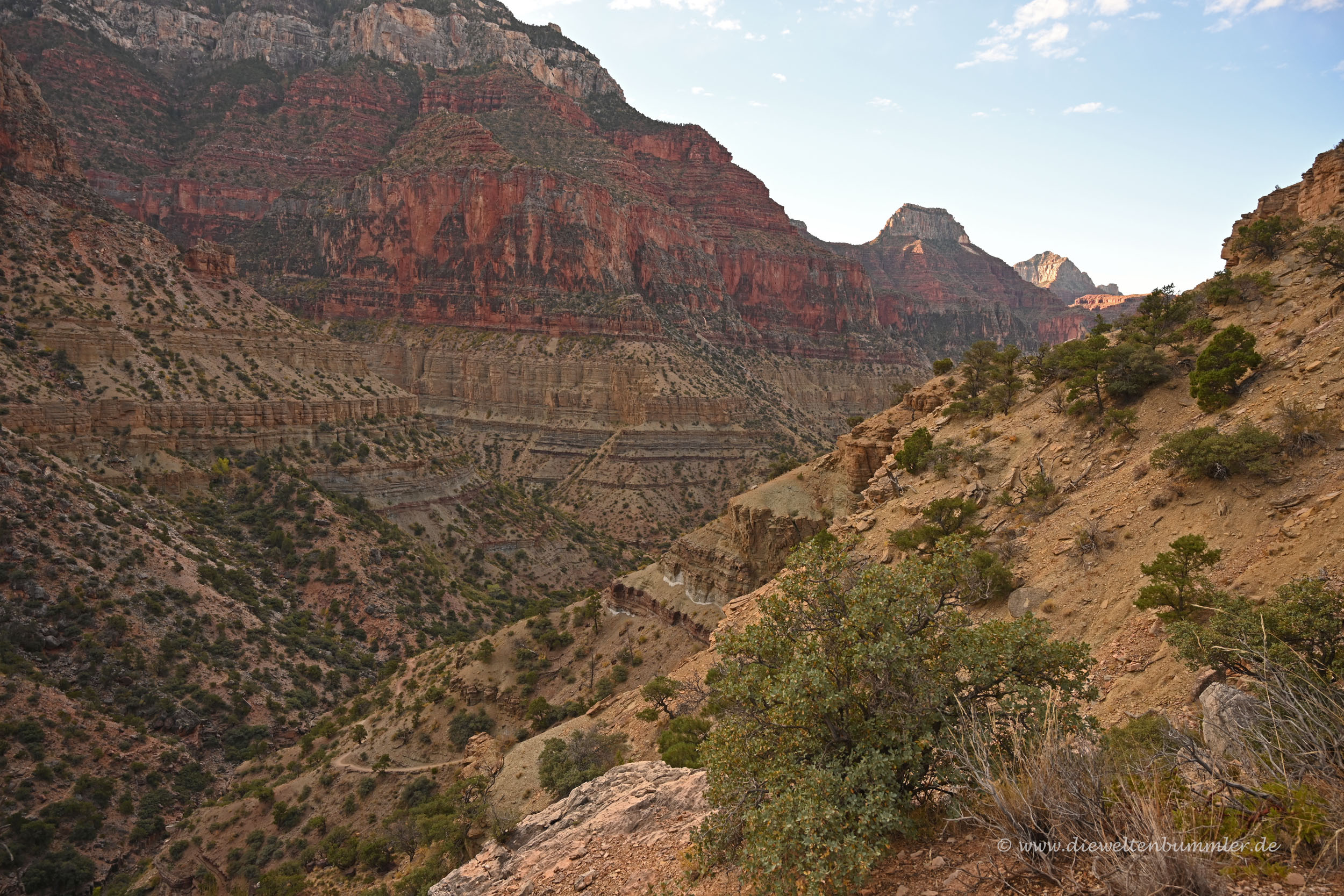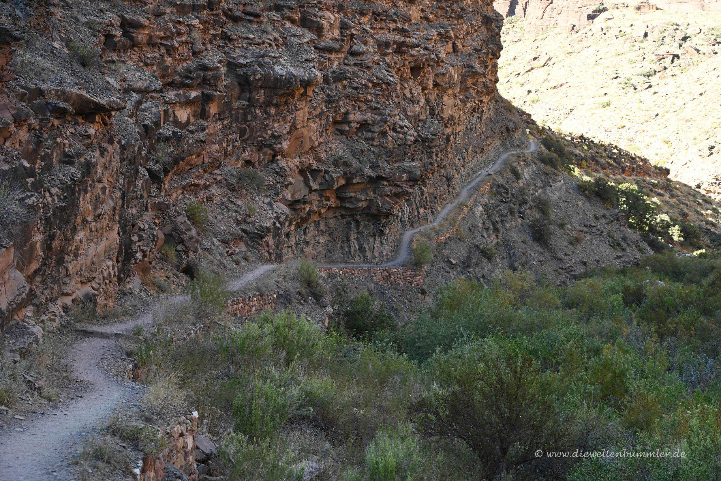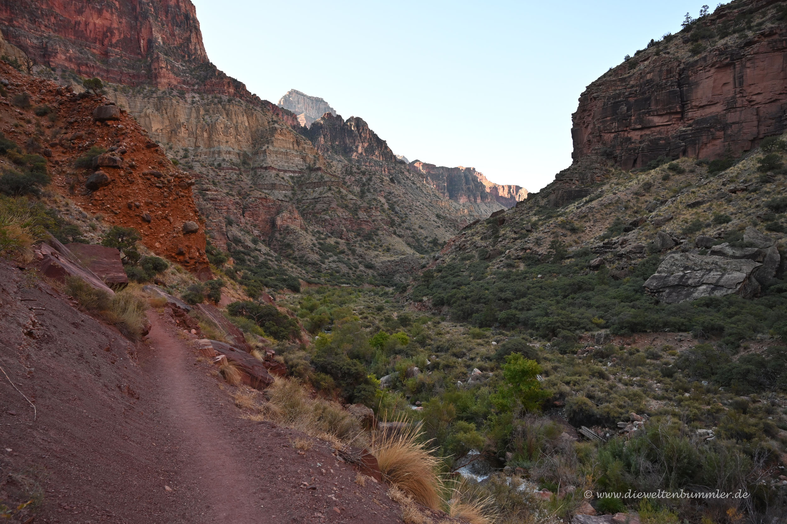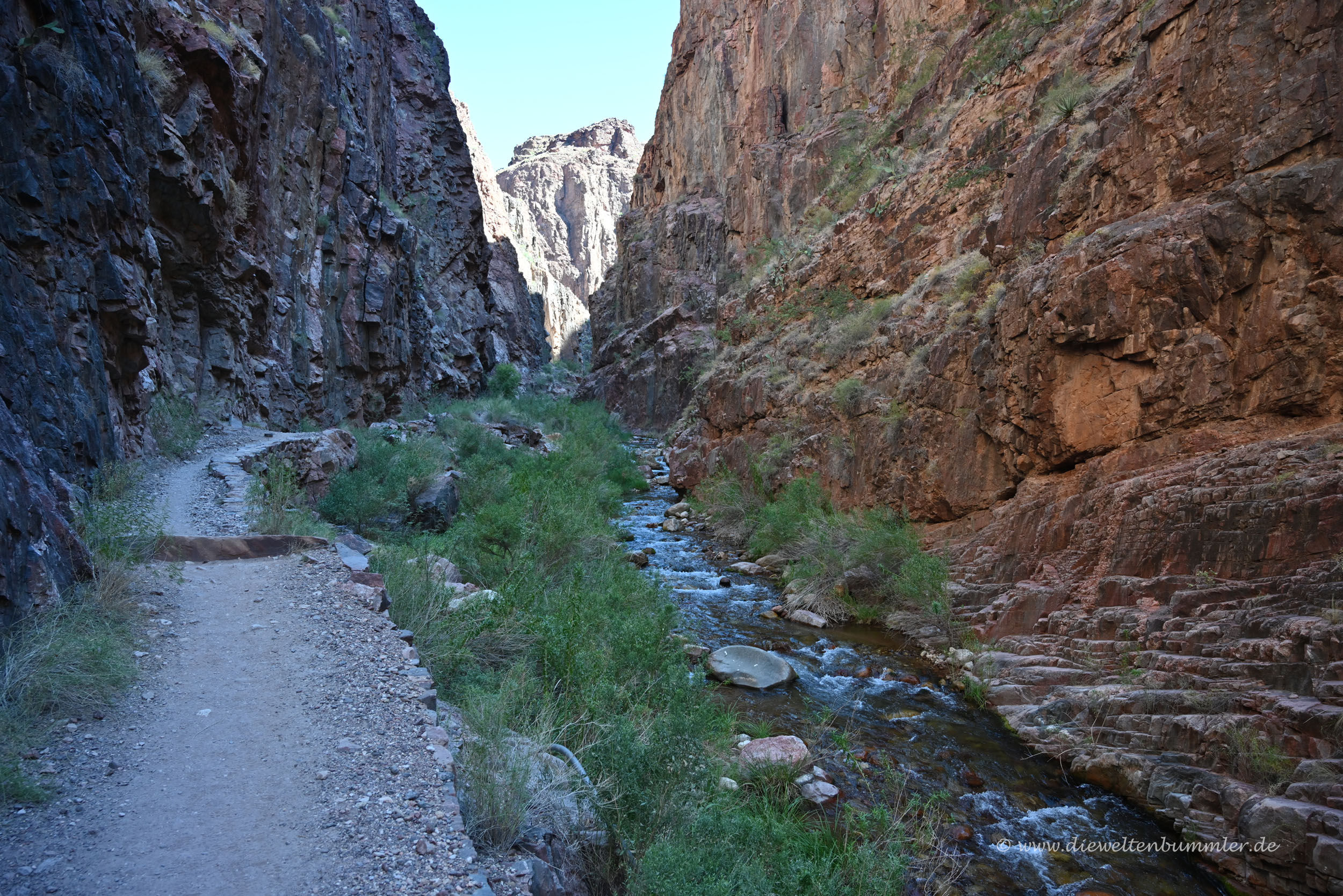 Von nun an waren wir im eigentlichen Hauptteil des Nebencanyons, der vom Wasser des Bright Angel Creek dominiert wird. Es sind zwar von der Pump House Station bis zum Colorado River immer noch weit über 700 Höhenmeter, doch diese verteilen sich auf eine Strecke von fast 20 Kilometern. Das Gefälle ist also überschaubar. Auf diesem Abschnitt ist es daher eher die Entfernung, die anstrengend ist. Zumal man ja bedenken muss, dass man bereits knapp 12 Kilometer hinter sich hat und noch eine Bergwanderung mit 1.300 Höhenmetern wartet.