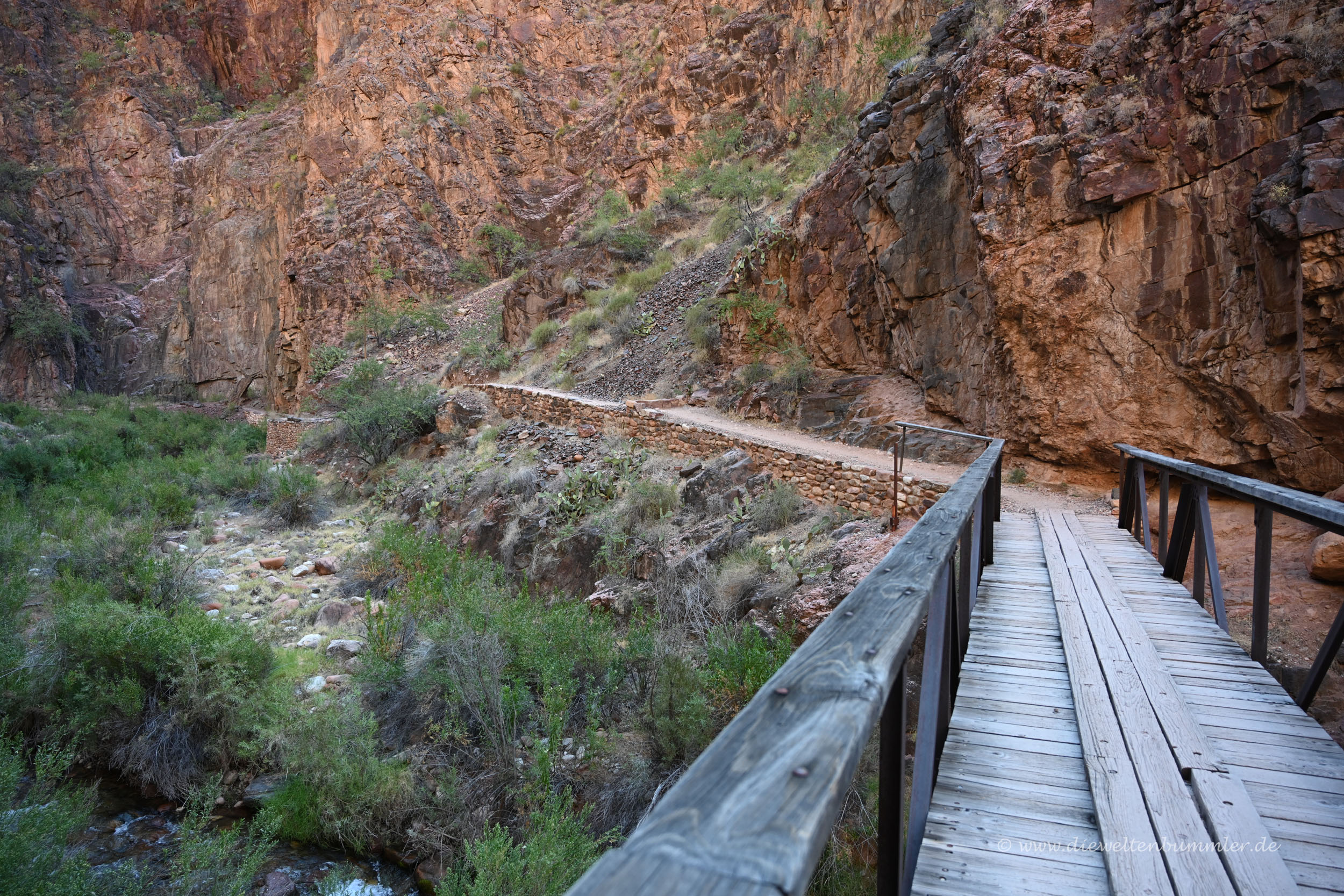 Da der Übergang zwischen dem etwas breiteren Canyon und der Enge der Schlucht langsam stattfindet, kann ich keinen genauen Zeitpunkt benennen, wann das stattfand. Laut meinem Navi würde ich sagen, dass die Engstelle ungefähr sechs Stunden nach Beginn der Wanderung folgte. Und diese Engstelle ist nicht nur ein kurzer Abschnitt, sondern vielmehr eine Strecke von knapp 10 km. Zwischendurch wechselt man auch schon mal mittels Brücke die Flussseite des Bright Angel Creek, aber im Großen und Ganzen ist man überwiegend im Schatten unterwegs. Sehr angenehm.
