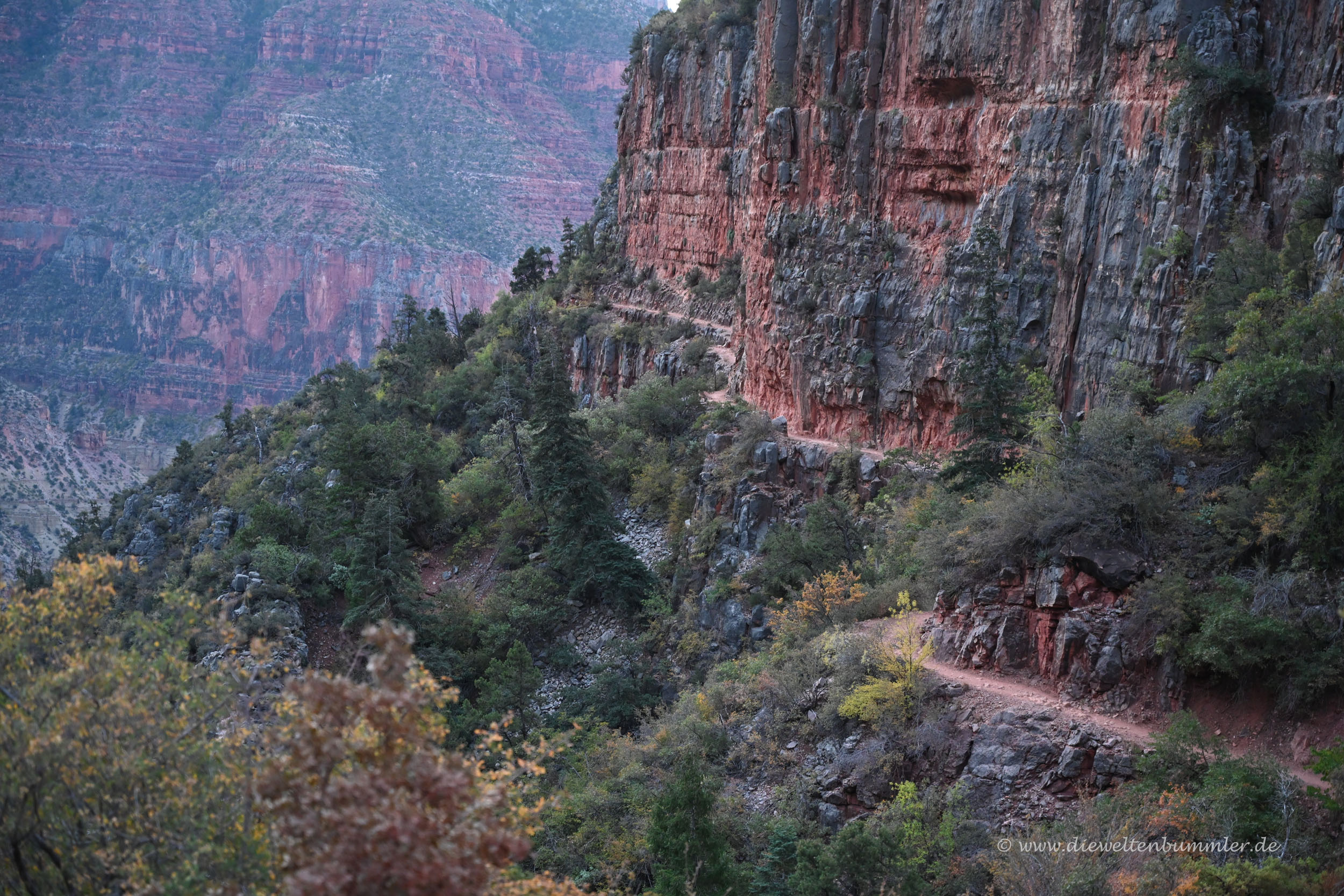 Rund viereinhalb Stunden nach dem Einstieg in den North Kaibab Trail wurde der bis hierhin angenehme Weg am Bright Angel Creek ein wenig ungemütlich. Denn man musste gegenüber von Ribbon Falls ein Stück bergauf. Nicht wirklich viel, aber man möge bedenken, dass wir schon über 17 Kilometer hinter uns hatten und da werden auch wenige Höhenmeter mittlerweile als Anstrengung empfunden. Ribbon Falls ist ein Wasserfall auf der anderen Seite des Seitencanyons. Normalerweise kann man ihn erreichen und so einen kleinen Umweg einlegen. Aber uns war einerseits nicht nach Umweg, denn dafür hatten wir noch jede Menge vor uns. Und andererseits war die Brücke, die man dafür überqueren musste, zu der Zeit unserer Wanderung ohnehin gesperrt.