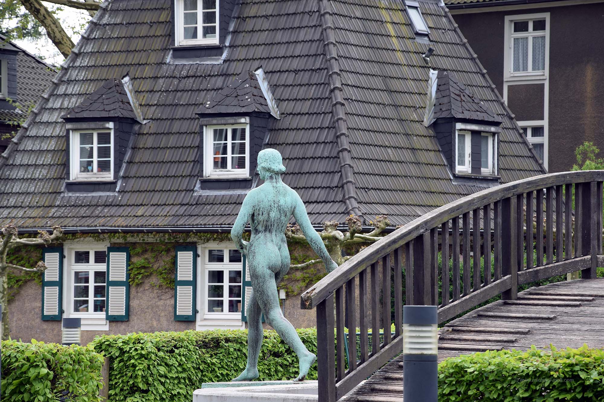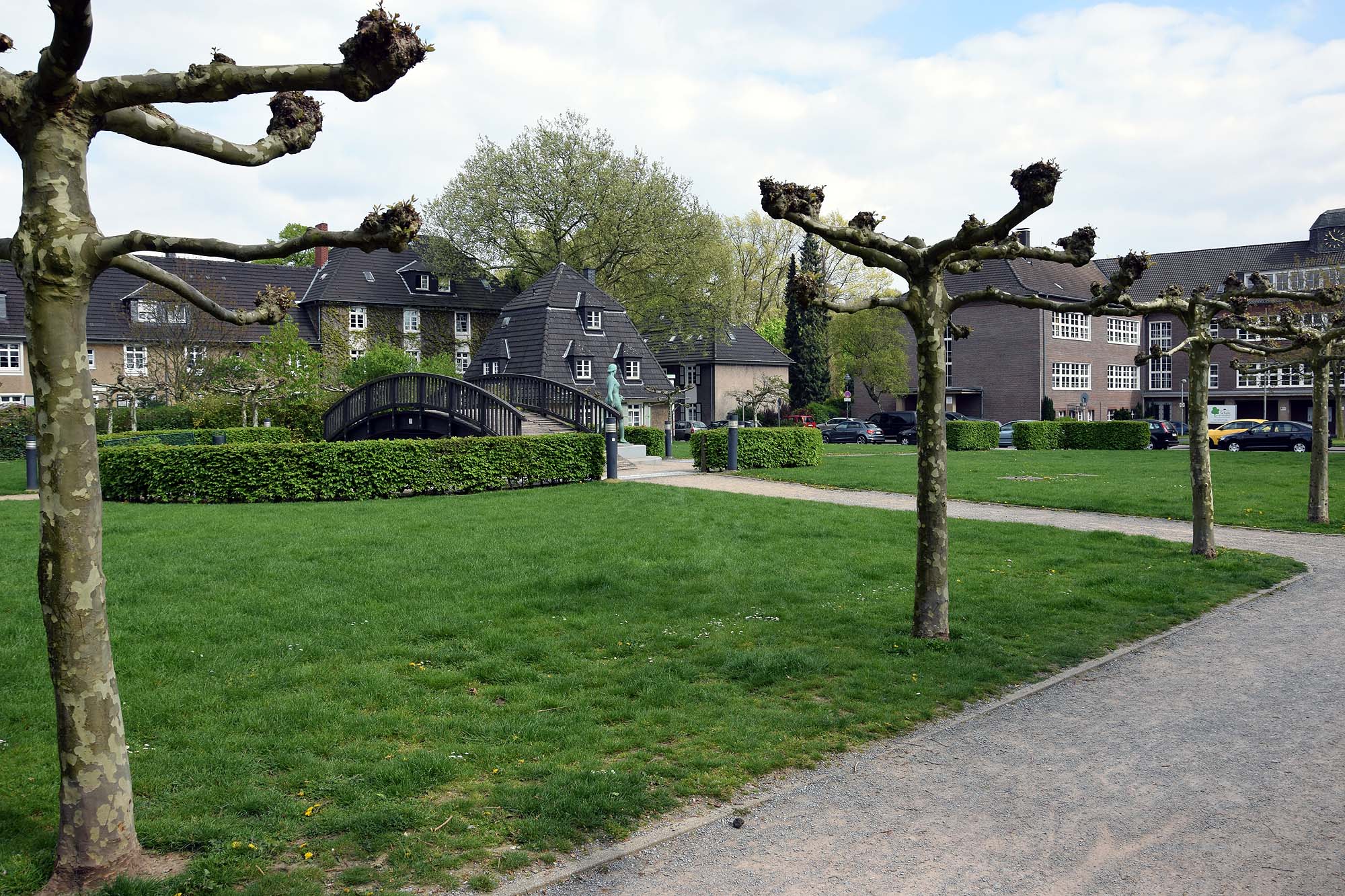 Auch die Essener Margarethenhöhe ist als Gartenstadt eigentlich kein Geheimtipp mehr. Daher beschränke ich mich auf den dortigen Hauxplatz, der eben nicht zentral in der Margaretenhöhe liegt, aber dennoch von schnuckeligen Häusern umgeben ist und in seiner Mitte eine kleine Holzbrücke beherbergt, die zwar keinen wirklichen Sinn hat, aber trotzdem, oder gerade deshalb, zum Verweilen einlädt (51.429423, 6.97571).