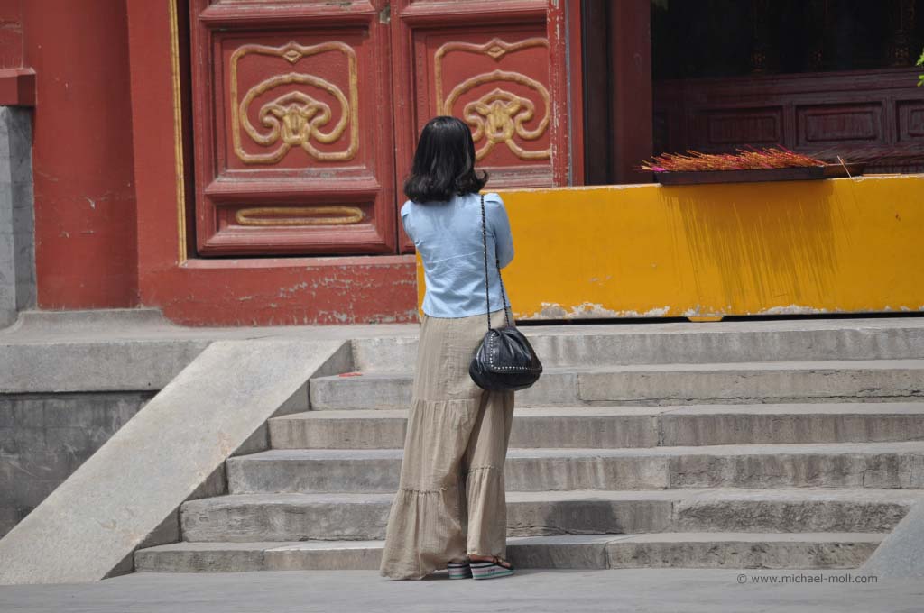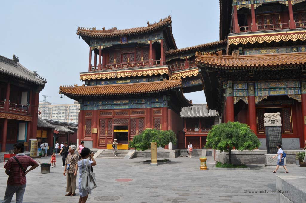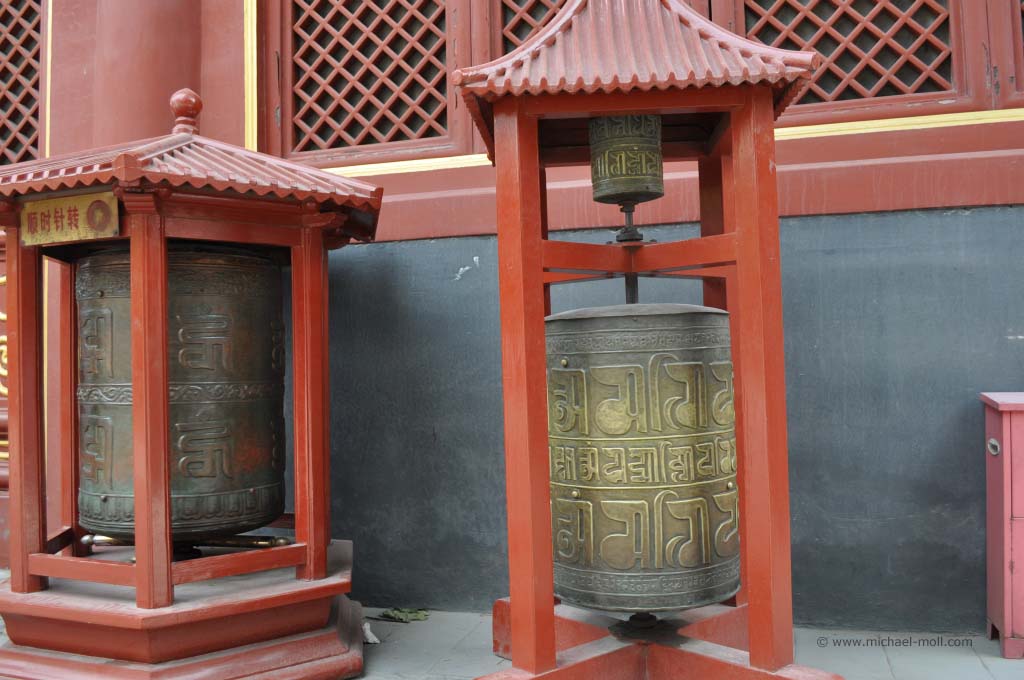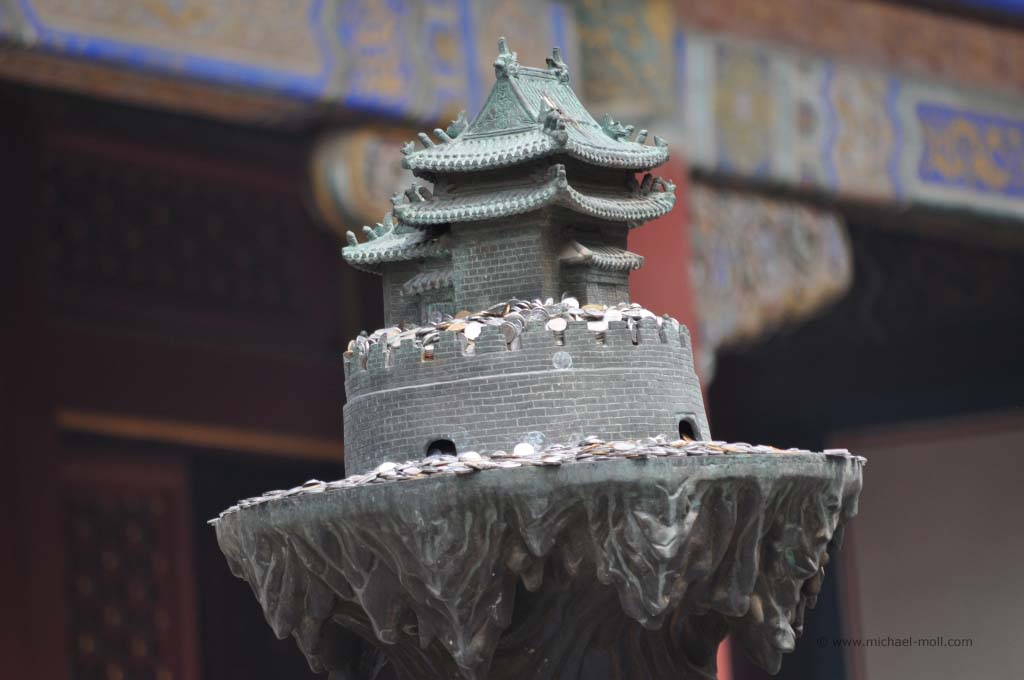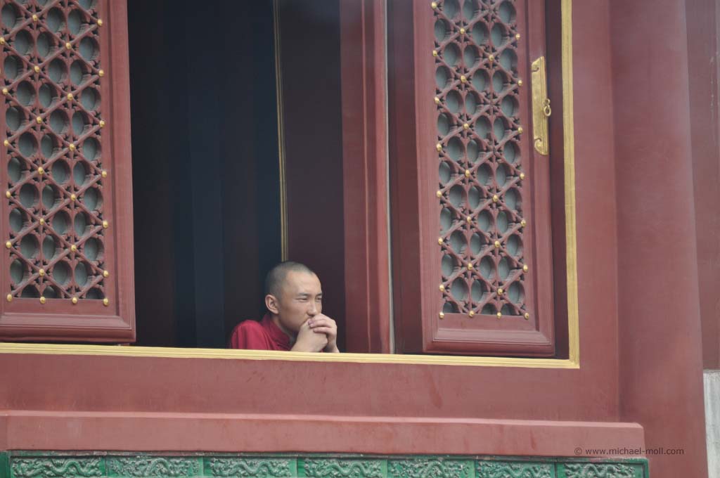 In dem Stahltor befand sich ein schmaler Schlitz, durch das uns von innen barsch auf die recht begrenzten Öffnungszeiten aufmerksam gemacht wurde. Es war aussichtslos. Diese Kirche würden wir heute nicht zu Gesicht bekommen. Wir stärkten uns mal wieder mit kalten Getränken und begaben uns auf den Weg zum weiter östlich gelegenen Beihaipark. Dieser bestand im Wesentlichen aus einem großen See, der umrundet werden kann und eine Insel mit einer weit sichtbaren weißen Pagode. Die Insel konnte über zwei Brücken oder mit kleinen Drachenbooten erreicht werden. Die Sicht war sehr schlecht. Der typische Pekinger Smog hing tief und selbst die Insel war nur mühsam zu erkennen. Auf dem See war es beinahe genauso voll wie auf dem Weg, der um das Gewässer führte. Unzählige Tretboote, voll besetzt mit chinesischen Familien bevölkerten den See und dienten gleichzeitig als Slalomfiguren für kleine Schnellboote.
