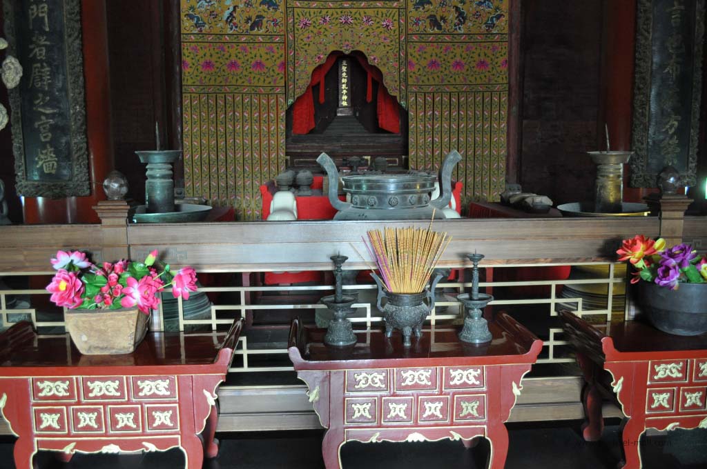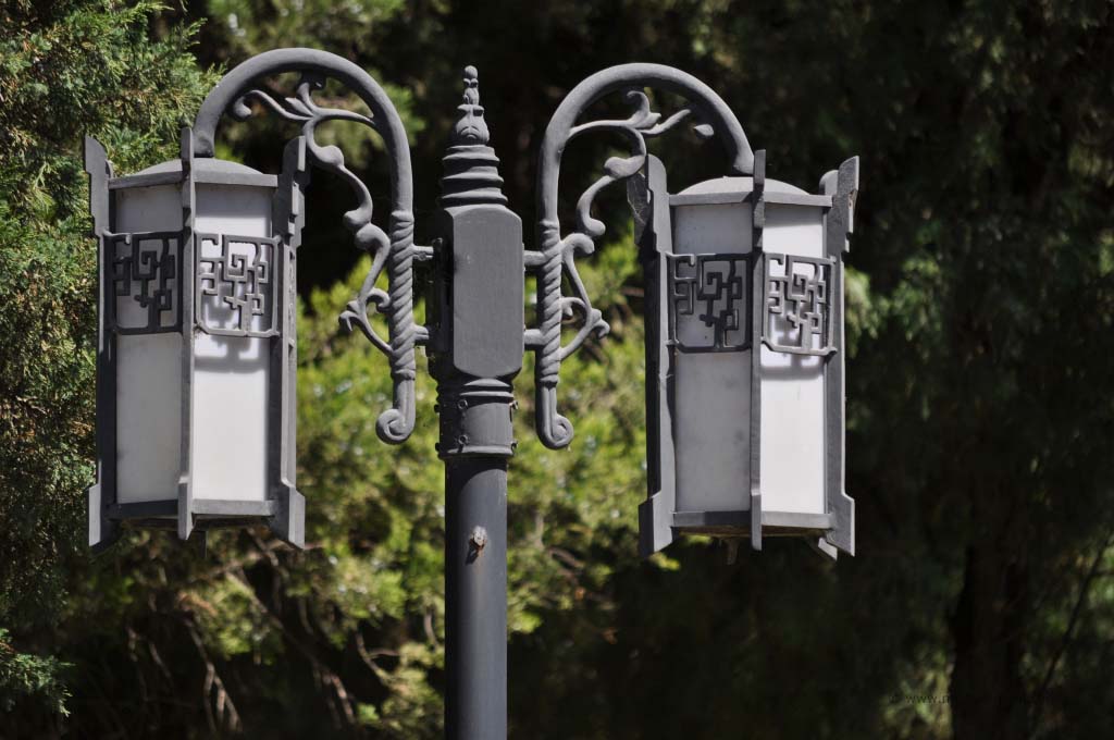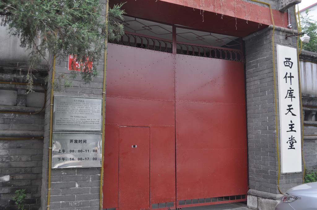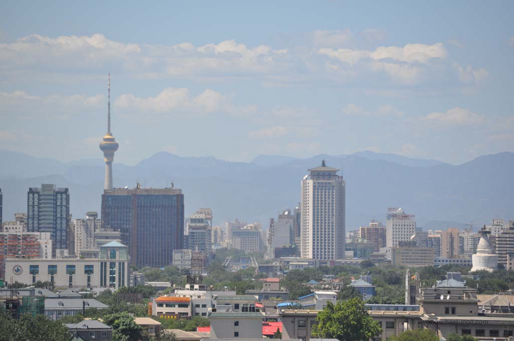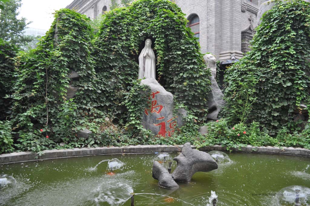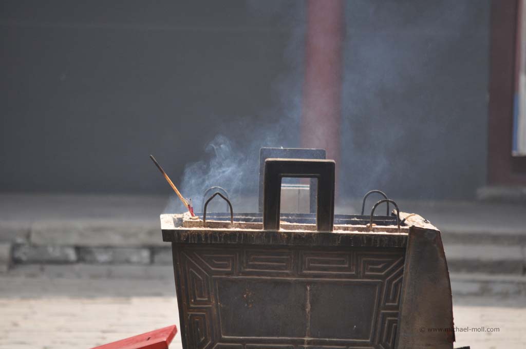 In dem Stahltor befand sich ein schmaler Schlitz, durch das uns von innen barsch auf die recht begrenzten Öffnungszeiten aufmerksam gemacht wurde. Es war aussichtslos. Diese Kirche würden wir heute nicht zu Gesicht bekommen. Wir stärkten uns mal wieder mit kalten Getränken und begaben uns auf den Weg zum weiter östlich gelegenen Beihaipark. Dieser bestand im Wesentlichen aus einem großen See, der umrundet werden kann und eine Insel mit einer weit sichtbaren weißen Pagode. Die Insel konnte über zwei Brücken oder mit kleinen Drachenbooten erreicht werden. Die Sicht war sehr schlecht. Der typische Pekinger Smog hing tief und selbst die Insel war nur mühsam zu erkennen. Auf dem See war es beinahe genauso voll wie auf dem Weg, der um das Gewässer führte. Unzählige Tretboote, voll besetzt mit chinesischen Familien bevölkerten den See und dienten gleichzeitig als Slalomfiguren für kleine Schnellboote.