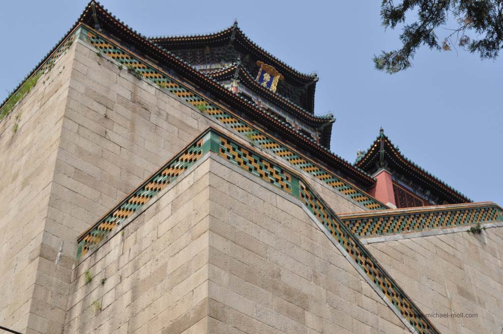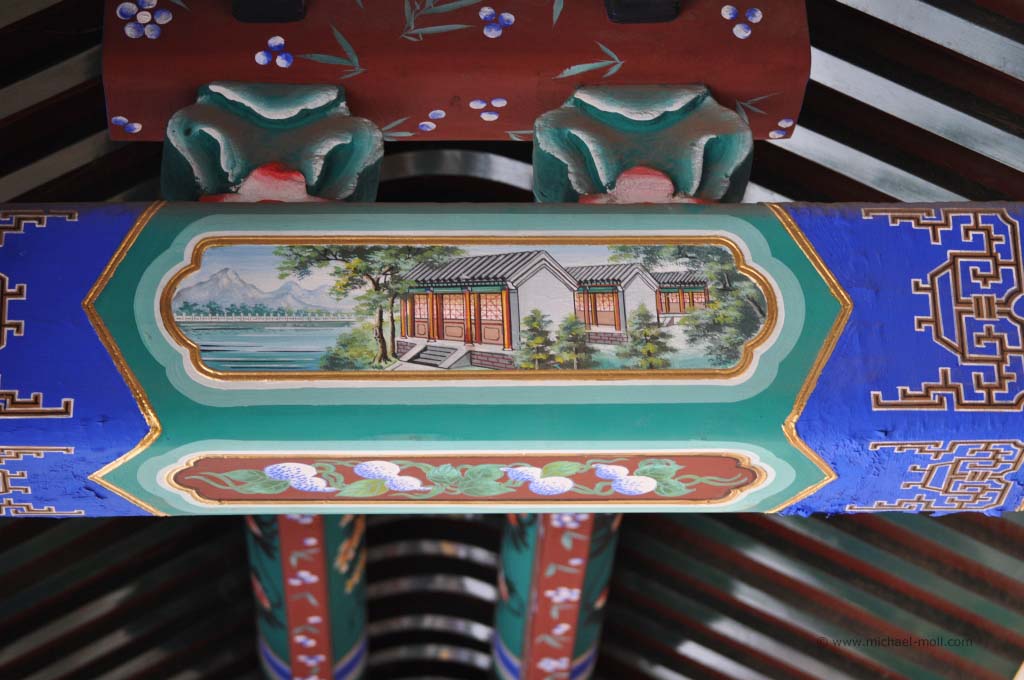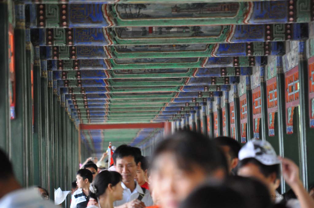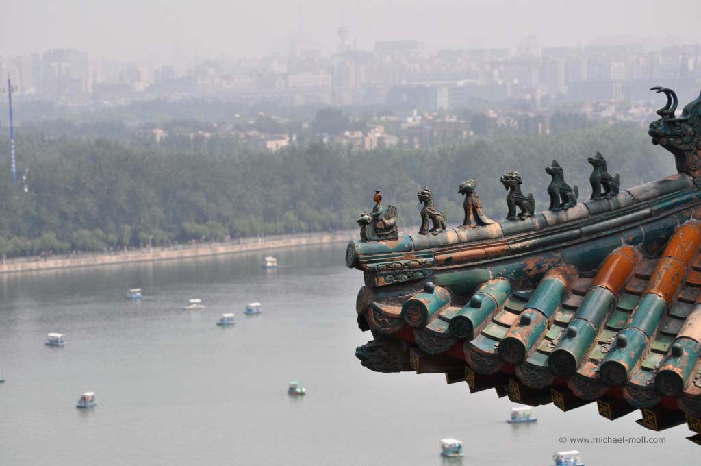 Wir entschieden uns dafür am Rande des Platzes in Ruhe entlang zu schlendern und hatten kurioserweise ausgerechnet in der Verbotenen Stadt den meisten Platz um uns herum. So viel Platz hatten wir in ganz Peking nicht mehr für uns. Wir durchschritten Tempel für Tempel, Hof für Hof und machten zahlreiche Bilder. Besonders die liebevollen Details hatten es uns angetan. Bunte Ornamente an den Wänden und kleine Figuren am Dachgebälk. Wobei mich die vorderste Figur immer an Dr. Dressler aus der Lindenstraße erinnerte. Der nördliche Bereich der Verbotenen Stadt war stark verwinkelt und demnach sehr voll. Da sich für unsere westlichen Augen die Tempel irgendwann wiederholten, beschlossen wir nach vier Stunden ausgiebiger Besichtigung die Verbotene Stadt wieder zu verlassen. Natürlich nicht, ohne vorher noch ein paar Worten einer deutschen Reiseleitung zu lauschen, die aber unsagbar langweilig war.