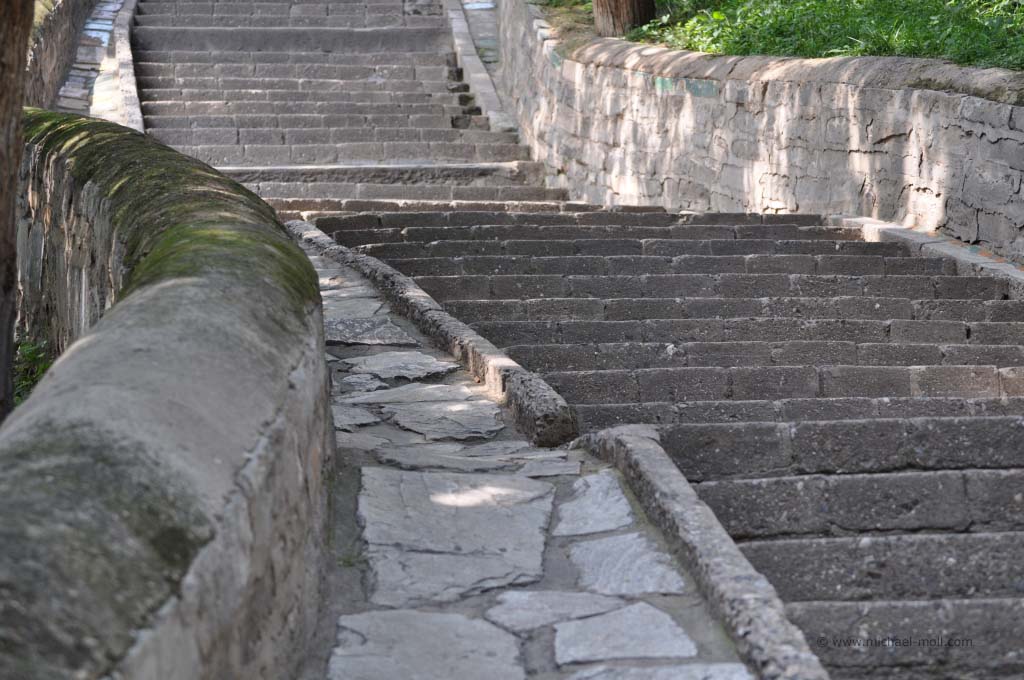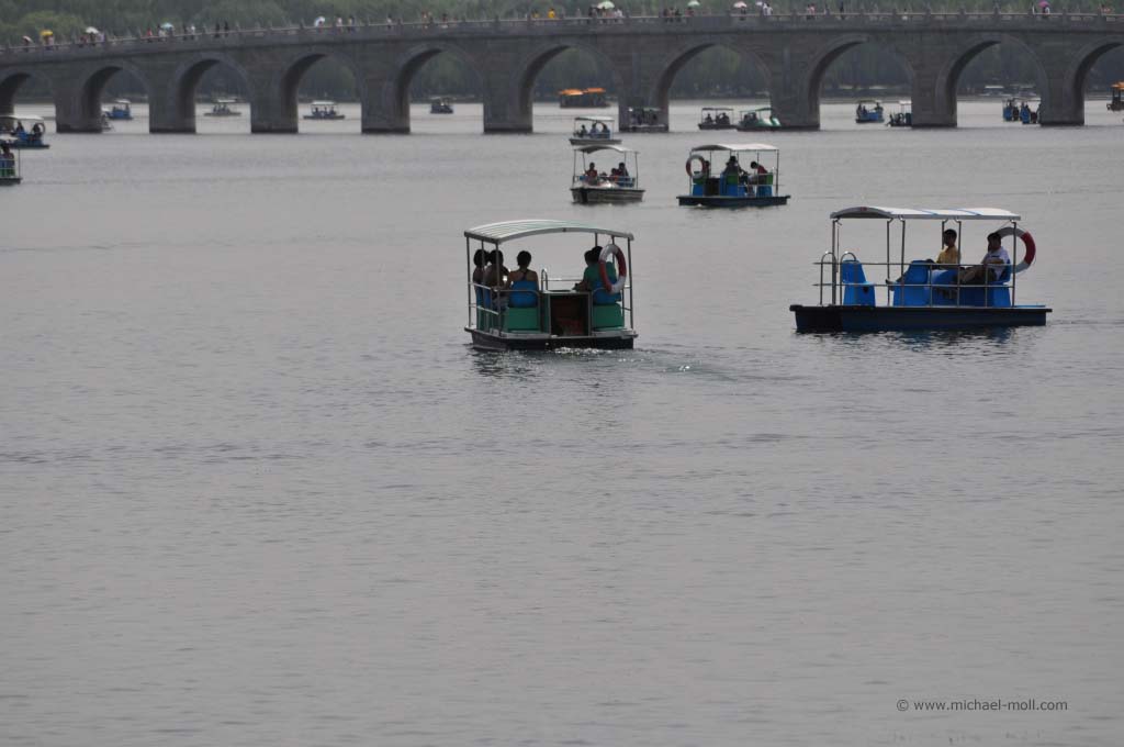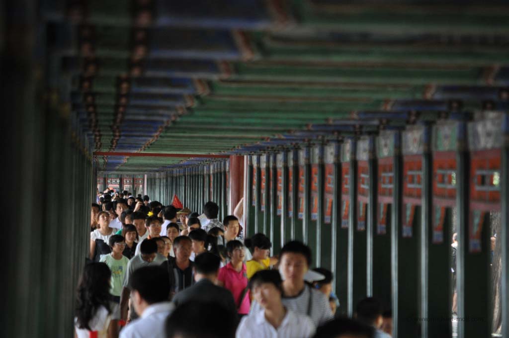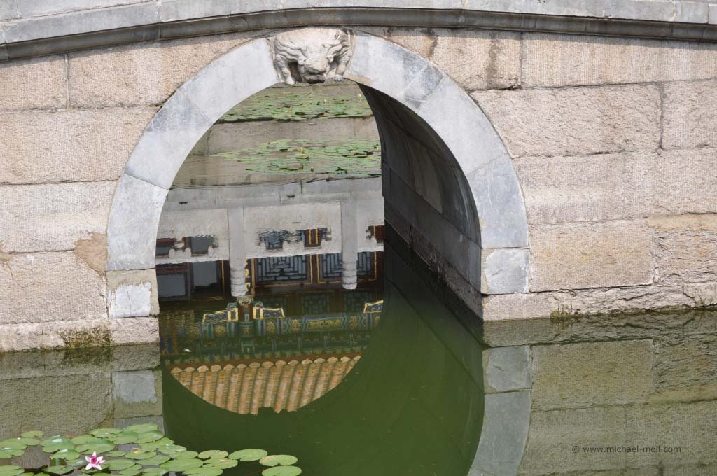 Als sich die Tore der Verbotenen Stadt öffneten, strömten die Besucher hindurch und gingen schnurstracks geradeaus. Zunächst kommt ein großer Hof mit einem quer verlaufenden Kanal über den fünf Brücken führen. Wir konnten beobachten, dass alle, und damit meine ich alle Chinesen die mittlere Brücke nutzten und so einen langen und engen Besucherstrom bildeten, obwohl sich die anderen vier Brücken nur wenige Meter rechts und links davon befanden. Ich musste unweigerlich an Lemminge oder eine Herde Schafe denken, die gedankenlos ihrem Vordermann folgten. Ganz unabhängig davon interessierte sich niemand für diesen ersten Hof. Auch hier schien es zunächst einmal wichtig zu sein, nach ganz vorne zu gelangen, ganz egal, was einen dort erwartet.