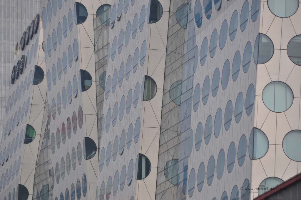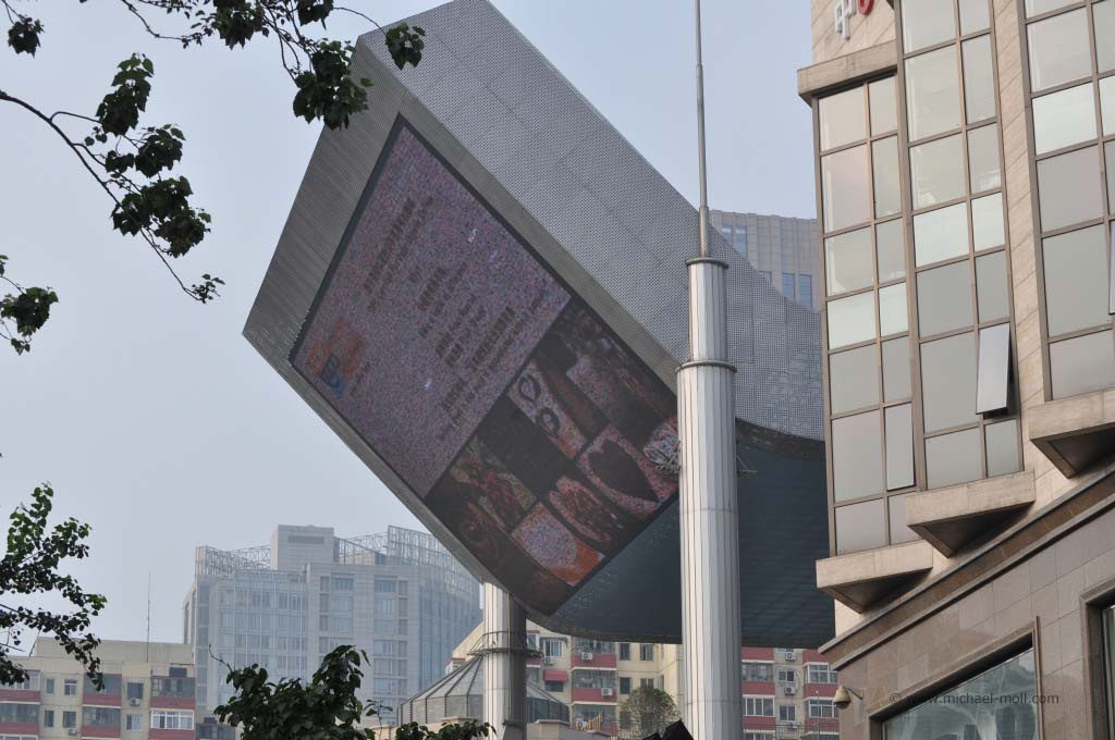 Am späten Nachmittag gingen wir am bereits bekannten Ritanpark vorbei bis zum so genannten New Beijing. Dort bestaunten wir die moderne Hochhauskulisse mit ihren ungewöhnlichen Bauten, unter anderem natürlich auch das völlig ausgebrannte Hochhaus des Fernsehsenders CCTV. An einem Ort, der schlicht The Place heißt, gibt es über der Straße eine über 200 Meter lange Videoleinwand. Uns war klar, dass wir uns die auch nochmal an einem der kommenden Abende anschauen wollten.