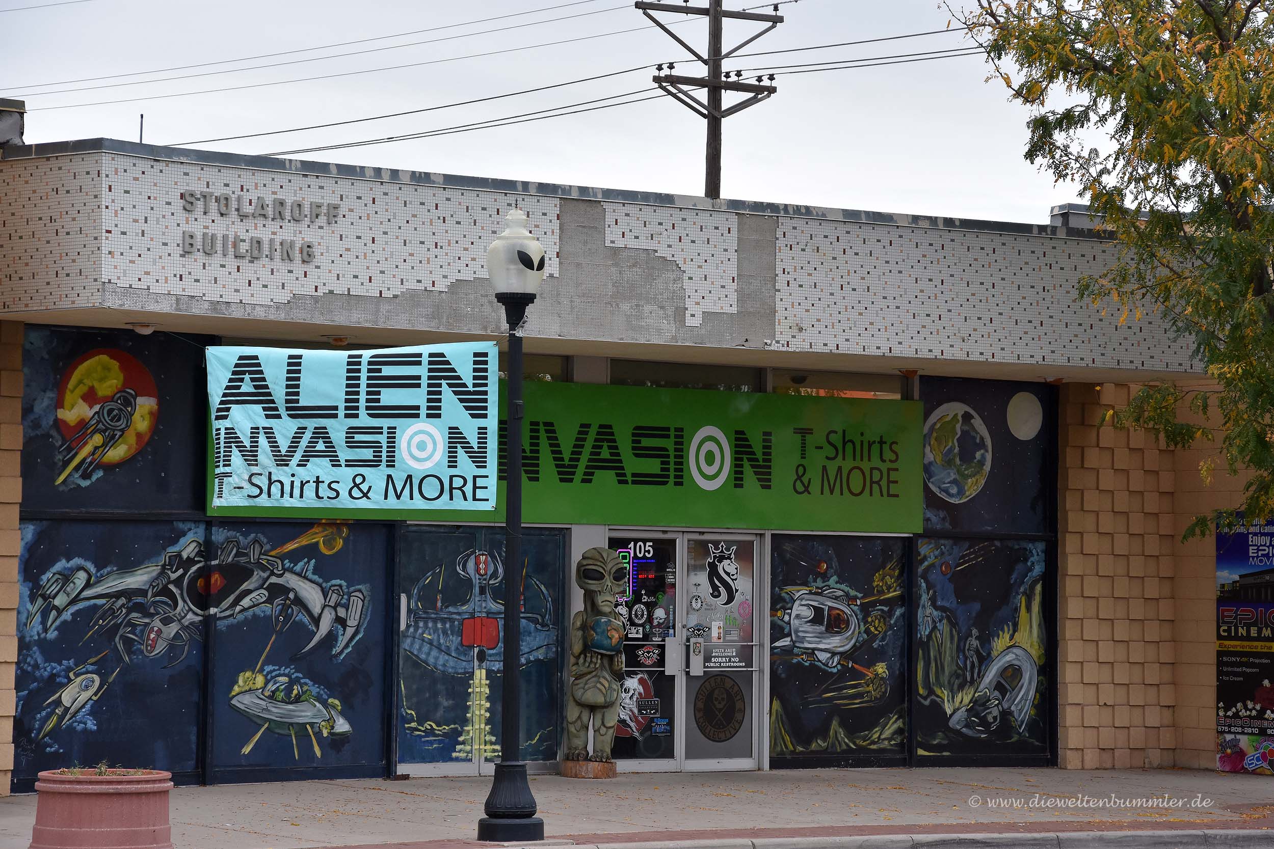 Eigentlich war das keine große Entfernung und normalerweise würden wir solche Strecken laufen, aber hier waren wir nun einmal in Amerika und da läuft alles anders. Oder anders gesagt, da läuft man solche Strecken nicht. Nach wenigen Minuten parkten wir unseren Wagen wieder ein und wir begaben uns auf die Suche nach den Außerirdischen. Das erste, was wir sahen, waren kleine grüne Fußspuren auf dem Asphalt. Diese führten uns zu einem ziemlich heruntergekommen Souvenirladen, vor dem eine typische Alienfigur weithin sichtbar ist.